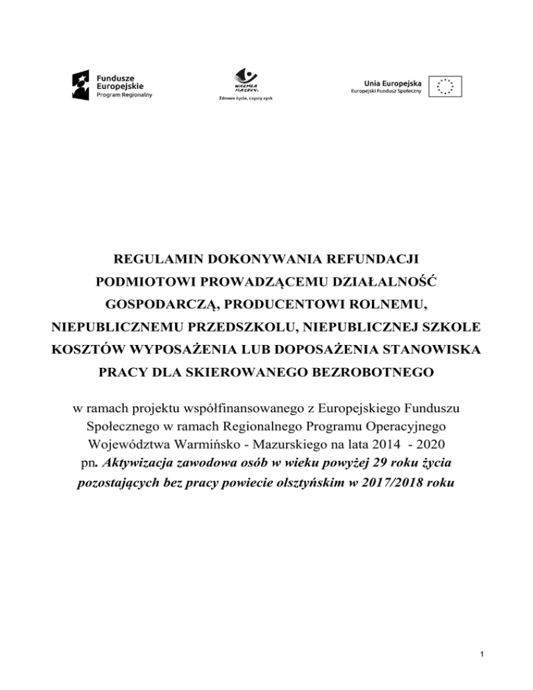 REGULAMIN DOKONYWANIA REFUNDACJI PODMIOTOWI PROWADZĄCEMU DZIAŁALNOŚĆ GOSPODARCZĄ, PRODUCENTOWI ROLNEMU, NIEPUBLICZNEMU PRZEDSZKOLU, NIEPUBLICZNEJ SZKOLE KOSZTÓW WYPOSAŻENIA LUB DOPOSAŻENIA STANOWISKA PRACY DLA SKIEROWANEGO BEZROBOTNEGO w ramach projektu współfinansowanego z Europejskiego Funduszu Społecznego w ramach Regionalnego Programu Operacyjnego Województwa Warmińsko - Mazurskiego na lata 2014 - 2020 pn. Aktywizacja zawodowa osób w wieku powyżej 29 roku życia pozostających bez pracy powiecie olsztyńskim w 2017/2018 roku 1 ROZDZIAŁ I Postanowienia ogólne. §1 Podstawa prawna. 1. Ustawa z dnia 20 kwietnia 2004 roku o promocji zatrudnienia i instytucjach rynku pracy (tekst jednolity Dz. U. z 2016 r. poz. 645 z późn. zm.), zwana dalej „ustawą”. 2. Rozporządzenie Ministra Pracy i Polityki Społecznej z dnia 23 kwietnia 2012 roku w sprawie dokonywania z Funduszu Pracy refundacji kosztów wyposażenia lub doposażenia stanowiska pracy dla skierowanego bezrobotnego oraz przyznawania środków na podjęcie działalności gospodarczej (tekst jednolity Dz. U. z 2015 r., poz.1041), zwane dalej „rozporządzeniem”. 3. Rozporządzenie Komisji (UE) nr 1407/2013 z dnia 18 grudnia 2013 r. w sprawie stosowania art. 107 i 108 Traktatu o funkcjonowaniu Unii Europejskiej do pomocy de minimis ( Dz. Urz. UE L 352 z 24.12.2013,str.1 ); rozporządzenie Komisji ( UE) nr 1408/2013 z dnia 18 grudnia 2013 r. w sprawie stosowania art. 107 i 108 Traktatu o funkcjonowaniu Unii Europejskiej do pomocy de minimis w sektorze rolnym (Dz. Urz. UE L 352 z 24.12.2013, str.9 ) zwane dalej „rozporządzeniem Komisji”. 4. Ustawa z dnia 30 kwietnia 2004 roku o postępowaniu w sprawach dotyczących pomocy publicznej. 5. Kodeks cywilny. §2 1. Zgodnie z powyższymi regulacjami Dyrektor Urzędu Pracy Powiatu Olsztyńskiego działający z upoważnienia Starosty ze środków Funduszu Pracy może dokonywać refundacji kosztów wyposażenia lub doposażenia stanowiska pracy dla skierowanego bezrobotnego w wysokości określonej w umowie: 1) podmiotowi prowadzącemu działalność gospodarczą zwanym dalej „ podmiotem”, 2) osobie fizycznej, osobie prawnej lub jednostce organizacyjnej nieposiadającej osobowości prawnej, zamieszkującej lub mającej siedzibę na terytorium Rzeczypospolitej Polskiej, będącej posiadaczem gospodarstwa rolnego w rozumieniu ustawy z dnia 15 listopada 1984 roku o podatku rolnym lub prowadzącej dział specjalny produkcji rolnej, o którym mowa w ustawie z dnia 26 lipca 1991 roku o podatku dochodowym od osób fizycznych lub w ustawie z dnia 15 lutego 1992 roku o podatku dochodowym od osób prawnych, zatrudniającej w okresie ostatnich 6 miesięcy, w każdym miesiącu, co najmniej jednego pracownika w pełnym wymiarze czasu pracy, zwanej dalej „producentem rolnym”, 3) niepublicznemu przedszkolu i niepublicznej szkole, o których mowa w ustawie z dnia 7 września 1991 roku o systemie oświaty. 2. Refundacja kosztów wyposażenia lub doposażenia stanowiska pracy dla skierowanego bezrobotnego dokonywana jest w ramach projektu współfinansowanego z Europejskiego Funduszu Społecznego w ramach Regionalnego Programu Operacyjnego Województwa Warmińsko – Mazurskiego na lata 2014 – 2020, Oś priorytetowa 10 Regionalny rynek pracy, Działanie 10.1. „Poprawa dostępu do zatrudnienia osób bezrobotnych i poszukujących pracy – projekty pozakonkursowe realizowane przez powiatowe urzędy pracy” zwany w dalszej części regulaminu programem RPO. 2 §3 Wysokość przyznawanych środków 1. 2. Podmiotowi, producentowi rolnemu, niepublicznemu przedszkolu, niepublicznej szkole, który poniósł koszty wyposażenia lub doposażenia stanowiska pracy dla skierowanego bezrobotnego może być dokonana refundacja w wysokości określonej w umowie, w kwocie nie wyższej niż 20.000 zł. Refundacja jest dokonywana na wniosek podmiotu, producenta rolnego, niepublicznego przedszkola, niepublicznej szkoły po przedłożeniu rozliczenia i udokumentowaniu poniesionych w okresie od dnia zawarcia umowy do dnia zatrudnienia skierowanego bezrobotnego, kosztów na wyposażenie lub doposażenie stanowiska pracy i zatrudnienia na tym stanowisku bezrobotnego. §4 Uprawnionymi do otrzymania środków finansowych są: 1. Podmiot, producent rolny, niepubliczne przedszkole, niepubliczna szkoła, mający swoją siedzibę w powiecie olsztyńskim, który tworzy miejsca pracy w powiecie olsztyńskim. 2. Podmiot, producent rolny, niepubliczne przedszkole, niepubliczna szkoła, który ma swoją siedzibę poza powiatem olsztyńskim, a miejsca pracy tworzy w powiecie olsztyńskim. ROZDZIAŁ II Warunki przyznawania środków Funduszu Pracy i tryb rozpatrywania wniosków §5 1. Podstawę do ubiegania się przez podmiot, producenta rolnego, niepubliczne przedszkole, niepubliczną szkołę o refundację kosztów wyposażenia lub doposażenia stanowiska pracy stanowi: 1) złożenie w Urzędzie Pracy kompletnego i prawidłowo sporządzonego wniosku wraz z załącznikami, 2) złożenie oświadczenia o niezaleganiu w dniu złożenia wniosku z wypłacaniem w terminie wynagrodzeń pracownikom oraz opłacaniem w terminie składek na ubezpieczenia społeczne, zdrowotne, Fundusz Pracy oraz Fundusz Gwarantowanych Świadczeń Pracowniczych, Fundusz Emerytur Pomostowych, innych danin publicznych oraz nieposiadaniu nieuregulowanych w terminie zobowiązań cywilnoprawnych, 3) złożenie informacji określonych w przepisach wydanych na podstawie z art. 37 ust.2a ustawy z dnia 30 kwietnia 2004 roku o postępowaniu w sprawach dotyczących pomocy publicznej, 4) złożenie oświadczenia o niekaralności w okresie 2 lat przed dniem złożenia wniosku za przestępstwa przeciwko obrotowi gospodarczemu, w rozumieniu ustawy z dnia 6 czerwca 1997 roku – Kodeks Karny lub ustawy z dnia 28 października 2002 roku o odpowiedzialności podmiotów zbiorowych za czyny zabronione pod groźbą kary, 5) złożenie oświadczenia o prowadz