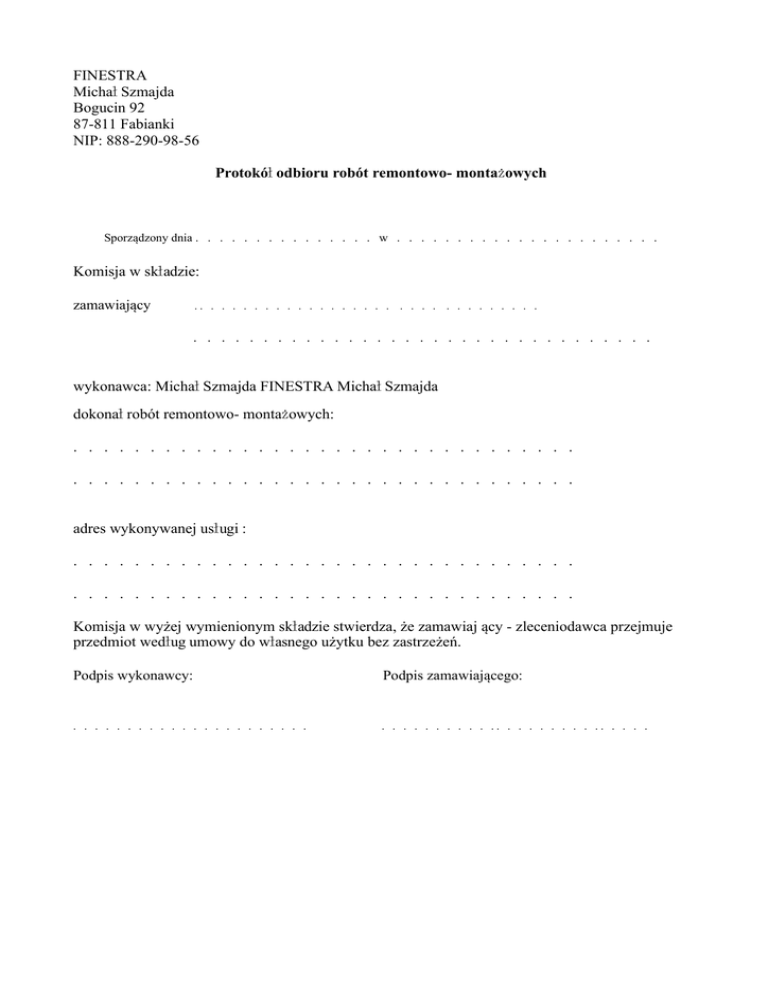 FINESTRA Michał Szmajda Bogucin 92 87-811 Fabianki NIP: 888-290-98-56 Protokół odbioru robót remontowo- montażowych Sporządzony dnia . . . . . . . . . . . . . . . w . . . . . . . . . . . . . . . . . . . . . . Komisja w składzie: zamawiający .. . . . . . . . . . . . . . . . . . . . . . . . . . . . . . . . . . . . . . . . . . . . . . . . . . . . . . . . . . . . . . . . wykonawca: Michał Szmajda FINESTRA Michał Szmajda dokonał robót remontowo- montażowych: . . . . . . . . . . . . . . . . . . . . . . . . . . . . . . . . . . . . . . . . . . . . . . . . . . . . . . . . . . . . . . . . . . adres wykonywanej usługi : . . . . . . . . . . . . . . . . . . . . . . . . . . . . . . . . . . . . . . . . . . . . . . . . . . . . . . . . . . . . . . . . . . Komisja w wyżej wymienionym składzie stwierdza, że zamawiaj ący - zleceniodawca przejmuje przedmiot według umowy do własnego użytku bez zastrzeżeń. Podpis wykonawcy: Podpis zamawiającego: . . . . . . . . . . . . . . . . . . . . . . . . . . . . . . . . .. . . . . . . . . .. . . . .