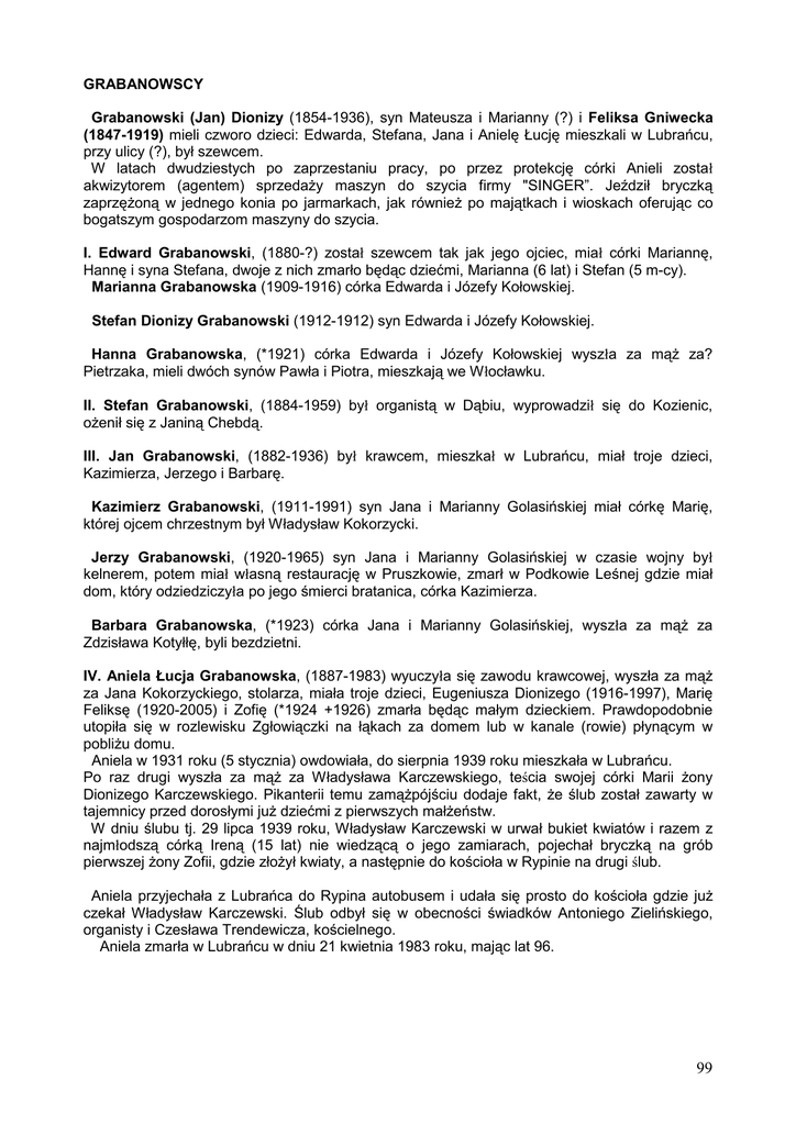 GRABANOWSCY Grabanowski (Jan) Dionizy (1854-1936), syn Mateusza i Marianny (?) i Feliksa Gniwecka (1847-1919) mieli czworo dzieci: Edwarda, Stefana, Jana i Anielę Łucję mieszkali w Lubrańcu, przy ulicy (?), był szewcem. W latach dwudziestych po zaprzestaniu pracy, po przez protekcję córki Anieli został akwizytorem (agentem) sprzedaŜy maszyn do szycia firmy "SINGER”. Jeździł bryczką zaprzęŜoną w jednego konia po jarmarkach, jak równieŜ po majątkach i wioskach oferując co bogatszym gospodarzom maszyny do szycia. I. Edward Grabanowski, (1880-?) został szewcem tak jak jego ojciec, miał córki Mariannę, Hannę i syna Stefana, dwoje z nich zmarło będąc dziećmi, Marianna (6 lat) i Stefan (5 m-cy). Marianna Grabanowska (1909-1916) córka Edwarda i Józefy Kołowskiej. Stefan Dionizy Grabanowski (1912-1912) syn Edwarda i Józefy Kołowskiej. Hanna Grabanowska, (*1921) córka Edwarda i Józefy Kołowskiej wyszła za mąŜ za? Pietrzaka, mieli dwóch synów Pawła i Piotra, mieszkają we Włocławku. II. Stefan Grabanowski, (1884-1959) był organistą w Dąbiu, wyprowadził się do Kozienic, oŜenił się z Janiną Chebdą. III. Jan Grabanowski, (1882-1936) był krawcem, mieszkał w Lubrańcu, miał troje dzieci, Kazimierza, Jerzego i Barbarę. Kazimierz Grabanowski, (1911-1991) syn Jana i Marianny Golasińskiej miał córkę Marię, której ojcem chrzestnym był Władysław Kokorzycki. Jerzy Grabanowski, (1920-1965) syn Jana i Marianny Golasińskiej w czasie wojny był kelnerem, potem miał własną restaurację w Pruszkowie, zmarł w Podkowie Leśnej gdzie miał dom, który odziedziczyła po jego śmierci bratanica, córka Kazimierza. Barbara Grabanowska, (*1923) córka Jana i Marianny Golasińskiej, wyszła za mąŜ za Zdzisława Kotyłłę, byli bezdzietni. IV. Aniela Łucja Grabanowska, (1887-1983) wyuczyła się zawodu krawcowej, wyszła za mąŜ za Jana Kokorzyckiego, stolarza, miała troje dzieci, Eugeniusza Dionizego (1916-1997), Marię Feliksę (1920-2005) i Zofię (*1924 +1926) zmarła będąc małym dzieckiem. Prawdopodobnie utopiła się w rozlewisku Zgłowiączki na łąkach za domem lub w kanale (rowie) płynącym w pobliŜu domu. Aniela w 1931 roku (5 stycznia) owdowiała, do sierpnia 1939 roku mieszkała w Lubrańcu. Po raz drugi wyszła za mąŜ za Władysława Karczewskiego, teścia swojej córki Marii Ŝony Dionizego Karczewskiego. Pikanterii temu zamąŜpójściu dodaje fakt, Ŝe ślub został zawarty w tajemnicy przed dorosłymi juŜ dziećmi z pierwszych małŜeństw. W dniu ślubu tj. 29 lipca 1939 roku, Władysław Karczewski w urwał bukiet kwiatów i razem z najmłodszą córką Ireną (15 lat) nie wiedzącą o jego zamiarach, pojechał bryczką na grób pierwszej Ŝony Zofii, gdzie złoŜył kwiaty, a następnie do kościoła w Rypinie na drugi ślub. Aniela przyjechała z Lubrańca do Rypina autobusem i udała się prosto do kościoła gdzie juŜ czekał Władysław Karczewski. Ślub odbył się w obecności świadków Antoniego Zielińskiego, organisty i Czesława Trendewicza, kościelnego. Aniela zmarła w Lubrańcu w dniu 21 kwietnia 1983 roku, mając lat 96. 99