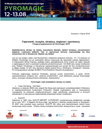 Szczecin, 5 lipca 2016 Fajerwerki, muzyka, strażacy, żeglarze i sportowcy Trwają przygotowania do Pyromagic 2016 Spektakularne obrazy na niebie, wyszukane dźwięki, dzielni strażacy, nieustraszeni żeglarze i waleczne piłkarki. Tak, w ogromnym skrócie, zapowiadają się dwa sierpniowe dni w Szczecinie. Będzie się działo! Już po raz kolejny niebo nad Szczecinem rozbłyśnie tysiącami kolorów. 12 i 13 sierpnia na Wałach Chrobrego tuż po zachodzie słońca rozpoczną się niezwykłe pokazy fajerwerków. O odpowiedni klimat imprezy zadbają cztery specjalistyczne firmy znane na całym świecie z zapierających dech w piersiach pokazów pirotechnicznych. Od 2008 roku swoje możliwości przy Wałach Chrobrego w Szczecinie zaprezentowało już ponad 20 firm pirotechnicznych z całego świata. W tym roku Szczecin będzie gościł firmy z Wietnamu, Szwajcarii i Szwecji. W roli gospodarza wystąpi SUREX Firma Rodzinna Ryszard Suzdalewicz. Podczas piątkowego otwarcia Festiwalu, jeszcze przed zmierzchem, o godz. 20.00, zaprezentowana zostanie tzw. „dzienna pirotechnika”, czyli efektowne pokazy kolorowego dymu, tworzące niezapomniane widowisko. Zapraszamy! Pyromagic czyli przepiękne obrazy na niebie Team Da Nang - Viet Nam Założony w sierpniu 2008 roku zespół Da Nang jest pierwszym przedstawicielem Wietnamu w międzynarodowych konkursach Fireworks. Zespół wyposażony jest w nowoczesne rozwiązania na poziomie międzynarodowym. Jego członkowie uczestniczyli w licznych szkoleniach w celu jeszcze doskonalszej prezentacji swoich możliwości. SUGYP Założona w 1967 roku SUGYP-IMPORT G.PORCHET pirotechniczną działalność zaczęła już w roku 1971. Z biegiem lat firma stała się jednym z liderów swojej branży w Szwajcarii. W 2007 roku powstał nowy podmiot: SUGYP SA, który pod kierownictwem dwóch braci kontynuuje swój rozwój. Zmiany służą rozwojowi twórczości artystycznej a nowe wyzwania techniczne wprowadziły firmę w unikatowy wymiar pirotechniczny. SYGUP co roku produkuje ponad 150 pokazów na 1 sierpnia, w dniu szwajcarskiego święta narodowego. Göteborgs Fyrverkeri Fabrik, GFF Göteborgs Fyrverkeri Fabrik, GFF jest największą firmą w Skandynawii zajmującą się pokazami sztucznych ogni. Wykonuje większość dużych i najważniejszych pokazów w kraju. GFF została założona w 1994 roku przez byłych konkurentów – Martina Hildeberga i Andersa Hållindera. Szczecin Music Live czyli bardzo dobre dźwięki Tradycją stało się już, że pokazom fajerwerków PYROMAGIC towarzyszy wyjątkowa muzyczna oprawa. Już po raz czwarty podczas wydarzenia nie zabraknie festiwalu Szczecin Music Live. Tegoroczna edycja będzie kontynuacją przyjętego bardzo dobrze przez szczecińską publiczność kierunku muzycznego będącego mieszanką folku i muzyki tanecznej wzbogaconego o brzmienia muzyki elektronicznej. Podczas dwóch dni festiwalu usłyszymy i zobaczymy wybitnych przedstawicieli tego gatunku z Polski i zagranicy. W tym roku usłyszymy Duże Pe, Warsaw Afrobeat Orchestra, United Flavour, Diego Cichy Don & Bro Bro Sound. Firefighter Combat Challenge czyli dzielni strażacy Wały Chrobrego po raz kolejny będą miejscem zmagań strażaków ze Stanów Zjednoczonych, Europy i – oczywiście – z Polski. Firefighter Combat Challenge to rywalizacja "najtwardszych" strażaków, która zyskuje coraz więcej sympatyków. Zawody zostały wymyślone ponad 20 lat temu w USA. Do Europy przywędrowały 9 lat temu. W trakcie zawodów strażacy wykonają szereg wyczerpujących zadań. W pełnym rynsztunku (hełmy, rękawice, kombinezony) będą musieli m.in.: wnieść 19-kilogramowy wąż strażacki na szczyt 12-metrowej wieży, za pomocą wielkiego młota przesunąć na odległość 1,5 metra metalową sztabę o wadze 72,5 kg, pokonać slalom na dystansie 40 m i przebiec dystans 30 m ciągnąc wypełniony wodą wąż, przeciągnąć, idąc tyłem, manekina o wadze 79 kg na odległość 30 m. Konkurencje biegów są w dużym stopniu odzwierciedleniem rzeczywistej pracy strażaka, a efektowość i dynamiczny przebieg sprawiają, że jest to impreza bardzo widowiskowa. Przygotowano również atrakcje dla najmłodszych. Dzieci będą mogły spróbować swoich sił na specjalnie przygotowanych torach w podobnych konkurencjach. Każde dziecko będzie mogło zmierzyć się z ciężarem przesuwanym młotem, slalomem, nawodnionym wężem strażackim oraz manekinem. Polonez Cup czyli nieustraszeni żeglarze Polonez Cup Race 2016 to pełnomorska prestiżowa impreza żeglarska w rejonie Bałtyku. Skupia najlepszych żeglarzy samotników i załogi dwuosobowe z Polski i zagranicy. Od 2015 roku impreza towarzyszy Festiwalowi Sztucznych Ogni Pyromagic. Edycja 2016 rozpocznie się 13 sierpnia w godzinach 13:00 – 15:30 od 2 krótkich wyścigów na Odrze w Szczecinie. Nagrodą główną jest historyczny „Puchar Poloneza”, nazwany tak dla upamiętnienia zakończenia rejsu dookoła świata przez kpt. Krzysztofa Baranowskiego na jachcie Polonez. W roku 2016 zwycięzcy w poszczególnych grupach otrzymają tytuły Mistrzów Polski. Baltic Single & Double Handed Polonez Cup Race 2016, czyli I Morskie Żeglarskie Mistrzostwa Polski Żeglarzy Samotników i Załóg Dwuosobowych organizowane są przez Fundację Sailportal.pl we współpracy z Komisją Morską Żeglarstwa PZŻ. Listy startowe, harmonogram i szczegóły dostępne są na stronie regat: www.regatypoloneza.pl, www.polonezcup.com. Tegoroczna edycja odbędzie się w dniach 11-16.08.2016. Baltica Summer Cup czyli waleczne piłkarki Piąty międzynarodowy turniej towarzyski piłki ręcznej kobiet - Baltica Summer Cup – odbędzie się 13 i 14 sierpienia 2016. W rozgrywkach wezmą udział dwie czołowe drużyny PGNiG Superligi oraz drużyny z Białorusi i Niemiec. Wszystkie mecze odbędą się na hali przy ul. Twardowskiego w Szczecinie. Uczestnicy turnieju: BNTU-BelAZ Minsk, VfL Oldenburg, MKS Zagłębie Lubin, Pogoń Baltica Szc