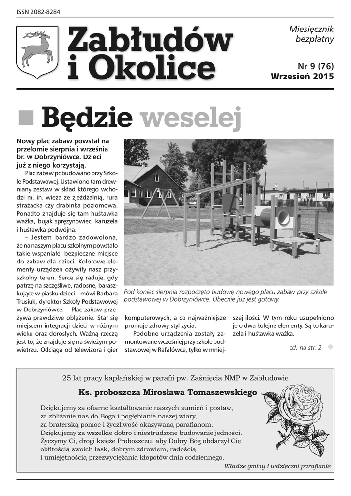 ISSN 2082-8284 Zabłudów i Okolice Miesięcznik bezpłatny Nr 9 (76) Wrzesień 2015 Będzie weselej Nowy plac zabaw powstał na przełomie sierpnia i września br. w Dobrzyniówce. Dzieci już z niego korzystają. Plac zabaw pobudowano przy Szkole Podstawowej. Ustawiono tam drewniany zestaw w skład którego wchodzi m. in. wieża ze zjeżdżalnią, rura strażacka czy drabinka poziomowa. Ponadto znajduje się tam huśtawka ważka, bujak sprężynowiec, karuzela i huśtawka podwójna. – Jestem bardzo zadowolona, że na naszym placu szkolnym powstało takie wspaniałe, bezpieczne miejsce do zabaw dla dzieci. Kolorowe elementy urządzeń ożywiły nasz przyszkolny teren. Serce się raduje, gdy patrzę na szczęśliwe, radosne, baraszkujące w piasku dzieci – mówi Barbara Trusiuk, dyrektor Szkoły Podstawowej w Dobrzyniówce. – Plac zabaw przeżywa prawdziwe oblężenie. Stał się miejscem integracji dzieci w różnym wieku oraz dorosłych. Ważną rzeczą jest to, że znajduje się na świeżym powietrzu. Odciąga od telewizora i gier Pod koniec sierpnia rozpoczęto budowę nowego placu zabaw przy szkole podstawowej w Dobrzyniówce. Obecnie już jest gotowy. komputerowych, a co najważniejsze promuje zdrowy styl życia. Podobne urządzenia zostały zamontowane wcześniej przy szkole podstawowej w Rafałówce, tylko w mniej- szej ilości. W tym roku uzupełniono je o dwa kolejne elementy. Są to karuzela i huśtawka ważka. cd. na str. 2 25 lat pracy kapłańskiej w parafii pw. Zaśnięcia NMP w Zabłudowie Ks. proboszcza Mirosława Tomaszewskiego Dziękujemy za ofiarne kształtowanie naszych sumień i postaw, za zbliżanie nas do Boga i pogłębianie naszej wiary, za braterską pomoc i życzliwość okazywaną parafianom. Dziękujemy za wszelkie dobro i niestrudzone budowanie jedności. Życzymy Ci, drogi księże Proboszczu, aby Dobry Bóg obdarzył Cię obfitością swoich łask, dobrym zdrowiem, radością i umiejętnością przezwyciężania kłopotów dnia codziennego. Władze gminy i wdzięczni parafianie Zabłudów i Okolice 2 Zabawa, która uczy Będzie weselej cd. ze str. 1 W obu miejscowościach rozmieszczono je z zachowaniem stref bezpieczeństwa. Elementy drewniane tych urządzeń zostały zabezpieczone przed deszczem i mrozem specjalnymi substancjami impregnacyjnymi. Ponadto zostały one pomalowane farbami ekologicznymi. Całkowity koszt nowego placu zabaw w Dobrzyniówce wyniósł prawie 23 tysiące złotych. Za dodatkowe dwa elementy w Rafałówce zapłacono około 6 tysięcy złotych. Pieniądze te pochodziły z budżetu gminy Zabłudów w ramach przyznanego wsi funduszowi sołeckiemu. PW Dwa pytania do Barbary Trusiuk, dyrektora Szkoły Podstawowej w Dobrzyniówce. Czy plac zabaw to pomysł szkoły czy sołtysa? Fakt powstania placu zabaw przy szkole w Dobrzyniówce, to zasługa mieszkańców na czele z naszym byłym sołtysem Mieczysławem Makulewskim. To sołectwo wyszło z taką inicjatywą, aby przeznaczyć fundusz sołecki na budowę placu zabaw. Uważam, że to był trafiony pomysł. W imieniu dzieci i własnym składam serdeczne podziękowania za ten gest. Cieszę się, że fundusz sołecki został przeznaczony dla młodych mieszkańców wsi. Jak zamierzacie go wykorzystywać w procesie edukacji? Wiemy, że szczególnie zabawy i gry ruchowe mają duży wpływ na rozwój dzieci. A tego typu zajęcia najlepiej sprawdzają się na świeżym powietrzu. Dlatego będziemy urządzenia na placu wykorzystywać do różnorodnych ćwiczeń, zabaw ruchowych. Sprawność ruchowa łączy się ze zdrowiem. Wśród dzieci obserwuje się nasilające zjawisko odchyleń od prawidłowego rozwoju, różnego rodzaju wady postawy i nieprawidłowości psychoruchowe. Wniosek jest jeden: plac zabaw to wspaniała zabawa, która uczy i wszechstronnie rozwija. Dziękuję za rozmowę Dożynki Białoruskie 13 września 2015 r. (niedziela), Ryboły, plac przy Muzeum ,,Ojcowizna” W programie: godz. 9.30 – Święta Liturgia w Cerkwi p.w. Śww. Kosmy i Damiana w Rybołach godz. 10.00 – nabożeństwo rzymsko-katolickie przy Krzyżach – kol. Ryboły godz. 12.00 – oficjalne otwarcie Część artystyczna * koncert zespołów „MAŁANKA” z Bielska Podlaskiego, KAPELA PODLASKA z Siemiatycz, „KALINKA” z Białegostoku, Zespoły z WDK w Rybołach, „KRYNICA” z Białegostoku, „OMORFOS” z Siemiatycz, „RADZIMICZY” z Mińska Imprezy towarzyszące: * wystawa płodów rolnych * konkursy: plastyczny, wieńców dożynkowych, obrzędowe * atrakcje dla dzieci Organizatorzy: Zarząd Główny BTSK w Białymstoku, Miejski Ośrodek Animacji Kultury w Zabłudowie, Miejska Biblioteka Publiczna w Zabłudowie Wiejski Dom Kultury w Rybołach Zrealizowano przy wsparciu finansowym Urzędu Marszałkowskiego Województwa Podlaskiego i pomocy Kulturalnego Centrum Białorusi w Polsce Nr 9 (76) • Wrzesień 2015 3 25 lat w Zabłudowie Z ks. Mirosławem Tomaszewskim, proboszczem parafii pw. Zaśnięcia N.M.P. w Zabłudowie rozmawia Piotr Woroniecki. 1 września br. minęło dwadzieścia pięć pracy księdza w Zabłudowie. Jak podsumowałby ksiądz ten czas. Czy były to udane lata? W kilku zdaniach nie jest łatwo ocenić dwadzieścia pięć lat życia. Pa- jąc ze środków finansowych z Urzędy Marszałkowskiego, Urzędu Miejskiego w Zabłudowie i własnych. W tym roku wymieniliśmy okna, osuszaliśmy fundamenty, uporządkowaliśmy teren wokół cerkwi i pobudowaliśmy nowy parkan z kamienia. Jednak co ważniejsze, w dzisiejszych trudnych czasach, w których świat podąża w kierunku zaniku autorytetów, wciąż obserwuję wiernych, którzy mają szacunek do Boga i świątyni. A co uważa ksiądz za swój największy sukces, a co za porażkę. Myślę, że sukcesem jest dobra współpraca z wiernymi, aktywna rada parafialna i wyrozumiała komisja rewizyjna, chór na dobrym poziomie, do którego garną się dzieci i młodzież. Ponadto naszym sukcesem jest kilkukrotne pozyskanie pieniędzy na ren