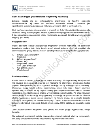 Linguistic Atelier Barbara Jasińska al. Chruściela 94/2 04-412 Warszawa ww w. L in g uis t ic At e l ier . c om b iur o @ Li n g uis t ic At e li e r .c om tel. 502 760 514 Split exchanges (rozdzielone fragmenty rozmów) Zabawa nadaje się do wykorzystania praktycznie na każdym poziomie zaawansowania. Jej celem jest zarówno utrwalanie słówek i zwrotów, jak i praktyczne ćwiczenia związane z naturalną wymianą zdań w języku obcym. Split exchanges dobrze się sprawdza w grupach od 8 do 16 osób i jest to zabawa dla uczniów, którzy potrafią czytać. Można ją stosować w przypadku dzieci w wieku od 78 lat, natomiast górna granica wieku nie istnieje, ponieważ dorośli również świetnie się przy tym bawią. Przygotowanie Przed zajęciami należy przygotować fragmenty krótkich rozmówek na osobnych kawałkach papieru, tak, żeby każdy uczeń dostał jeden z nich. Na przykład dla ośmioosobowej grupy dzieci z klasy 4 szkoły podstawowej mogłoby to wyglądać tak: 1. - What's your nationality? - I'm Italian. 2. - Where are you from? - Rome, Italy. 3. - Do you like blue? - Yes. Look at my cap! 4. - I've got ice cream. - It's delicious! Przebieg zabawy Każde dziecko losowo dostaje jedną część rozmowy. W ciągu minuty każdy uczeń ma nauczyć się na pamięć tego, co jest napisane na otrzymanej przez niego kartce papieru. Następnie wszyscy krążą po sali szukając osoby z drugą częścią rozmowy. Uczniowie mogą mówić jedynie zapamiętaną przez nich frazę i każdy powinien spotkać się z każdym. W tej części zabawy jest zwykle mnóstwo śmiechu i nawet najbardziej nieśmiali kursanci chętnie wypowiadają swoje kwestie. Po kilku minutach osoby, które znalazły swoją "drugą połowę" ustawiają się parami w rzędzie. Reszta głośno wypowiada swoje części rozmowy na forum grupy, co pozwala (często z pomocą nauczyciela) na odnalezienie pary. Często w tym momencie dochodzi do zmiany podjętej już wcześniej decyzji przez osoby, które sądziły, że znalazły swoją parę. Jako podsumowanie wszystkie pary głośno na forum grupy wypowiadają swoje kwestie. Na wyższych poziomach należy odpowiednio dobrać materiał użyty w rozmowach, tak, żeby ćwiczenie stanowiło odpowiednie wyzwanie dla kursantów. www.SolidnyAngielski.LinguisticAtelier.com - darmowe ćwiczenia i materiały do nauki angielskiego