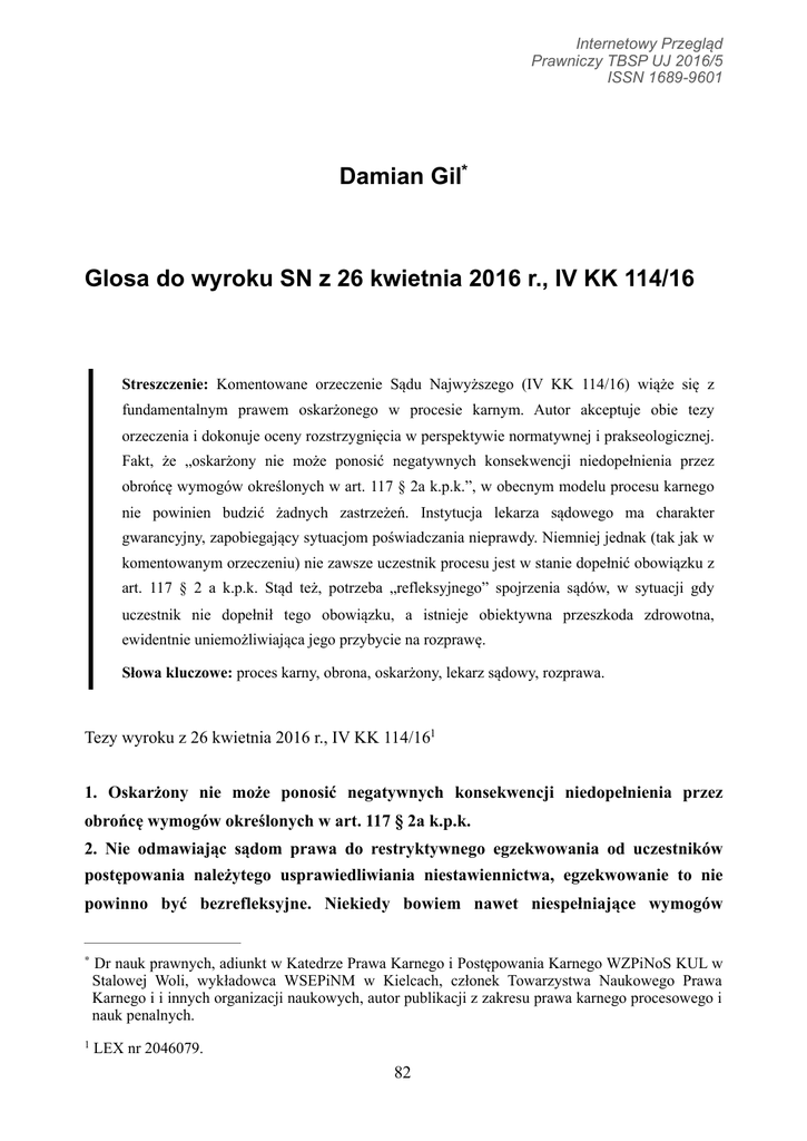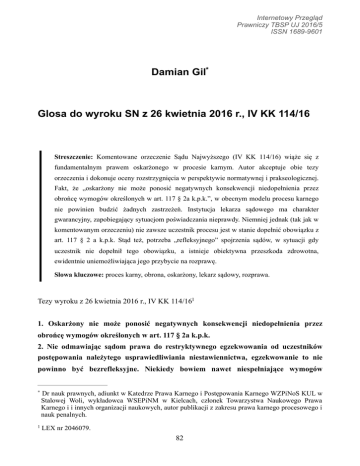 Internetowy Przegląd Prawniczy TBSP UJ 2016/5 ISSN 1689-9601 Damian Gil* Glosa do wyroku SN z 26 kwietnia 2016 r., IV KK 114/16 Streszczenie: Komentowane orzeczenie Sądu Najwyższego (IV KK 114/16) wiąże się z fundamentalnym prawem oskarżonego w procesie karnym. Autor akceptuje obie tezy orzeczenia i dokonuje oceny rozstrzygnięcia w perspektywie normatywnej i prakseologicznej. Fakt, że „oskarżony nie może ponosić negatywnych konsekwencji niedopełnienia przez obrońcę wymogów określonych w art. 117 § 2a k.p.k.”, w obecnym modelu procesu karnego nie powinien budzić żadnych zastrzeżeń. Instytucja lekarza sądowego ma charakter gwarancyjny, zapobiegający sytuacjom poświadczania nieprawdy. Niemniej jednak (tak jak w komentowanym orzeczeniu) nie zawsze uczestnik procesu jest w stanie dopełnić obowiązku z art. 117 § 2 a k.p.k. Stąd też, potrzeba „refleksyjnego” spojrzenia sądów, w sytuacji gdy uczestnik nie dopełnił tego obowiązku, a istnieje obiektywna przeszkoda zdrowotna, ewidentnie uniemożliwiająca jego przybycie na rozprawę. Słowa kluczowe: proces karny, obrona, oskarżony, lekarz sądowy, rozprawa. Tezy wyroku z 26 kwietnia 2016 r., IV KK 114/161 1. Oskarżony nie może ponosić negatywnych konsekwencji niedopełnienia przez obrońcę wymogów określonych w art. 117 § 2a k.p.k. 2. Nie odmawiając sądom prawa do restryktywnego egzekwowania od uczestników postępowania należytego usprawiedliwiania niestawiennictwa, egzekwowanie to nie powinno być bezrefleksyjne. Niekiedy bowiem nawet niespełniające wymogów ∗ Dr nauk prawnych, adiunkt w Katedrze Prawa Karnego i Postępowania Karnego WZPiNoS KUL w Stalowej Woli, wykładowca WSEPiNM w Kielcach, członek Towarzystwa Naukowego Prawa Karnego i i innych organizacji naukowych, autor publikacji z zakresu prawa karnego procesowego i nauk penalnych. 1 LEX nr 2046079. (82 zaświadczenie lekarskie jasno wskazuje, że z uwagi na charakter schorzenia zainteresowany rzeczywiście nie był w stanie stawić się na rozprawę (posiedzenie), jak też, że moment zaistnienia niedyspozycji mógł mu utrudnić skontaktowanie się z lekarzem sądowym. W takim wypadku słuszne będzie zaniechanie prowadzenia czynności i wezwanie danej osoby do niezwłocznego dostarczenia prawidłowego zaświadczenia. Stanowisko wyrażone przez Sąd Najwyższy dotyczy niezwykle istotnej kwestii z punktu widzenia respektowania fundamentalnych praw oskarżonego w postępowaniu odwoławczym. Po zmianie art. 117 § 2a k.p.k., dokonanej nowelą z 15 czerwca 2007 r.2, Sąd Najwyższy kilkukrotnie wypowiadał się w kwestii usprawiedliwionego niestawiennictwa z powodu choroby oskarżonych, świadków, obrońców, pełnomocników i innych uczestników postępowania, które to de lege lata wymaga zaświadczenia potwierdzającego niemożność stawienia się na wezwanie organu procesowego, wystawionego przez lekarza sądowego.3 Komentowane orzeczenie nie kwestionuje zasadności formalizacji usprawiedliwienia z art. 117 § 2a k.p.k. Wyjaśnia natomiast, że nie zawsze dopełnienie tych formalności jest możliwe, z powodów, których obiektywna ocena przesądza o takiej przeszkodzie, co w konsekwencji nie powinno naruszać prawa do obrony w postępowaniu odwoławczym. Z powyższym stanowiskiem Sądu Najwyższego należ się zgodzić. Przystępując do analizy zasadności argumentacji jaką posłużył się Sąd Najwyższy, należy zaznaczyć że teza pierwsza glosowanego wyroku, wpisuje się w nurt szczególnej ochrony oskarżonego (favor defensionis), szczególnie w sytuacji gdy jest pozbawiony wolności, ma ustanowionego obrońcę i w związku z tym liczy, że będzie należycie reprezentowany w stadium odwoławczym. W sprawie, która dała początek omawianemu rozstrzygnięciu, obrońca naruszył obowiązek wynikający z art. 117 § 2a k.p.k. Dolegliwość (złamanie kompensacyjne kręgosłupa), która była przyczyną niestawiennictwa na termin rozprawy odwoławczej, obiektywnie uniemożliwiała mu przybycie do lekarza sądowego i uzyskanie zaświadczenia. Obrońca czynił bezowocne starania o ustanowienie substytuta, a także wnosił o odroczenie sprawy, dołączając zaświadczenie lekarskie wystawione na użytek ZUS. Sąd odwoławczy, kierując się wykładnią gramatyczną przepisu art. 117 § 2a k.p.k. postanowił nie odroczyć sprawy i wydać wyrok na tejże rozprawie. Zarzut kasacji – „rażącego naruszenia przepisów postępowania, które miało wpływ na treść orzeczenia – art. 2 Ustawa z dnia 15 czerwca 2007 r. o lekarzu sądowym, (Dz. U. Nr 123, poz. 849). 3 Por. m.in.: wyrok SN z 27 stycznia 2016 r., V KK 321/15, LEX nr 2007809; wyrok SN z 18 listopada 2015 r., V KK 121/15, LEX nr 1920188; wyrok SN z 14 października 2014 r., SDI 27/14, Biul. PK 2014, nr 10/30-32; wyrok SN z 9 maca 2011 r., II KK 259/10, LEX nr 784270. (83 117 § 2a w zw. z art. 6 k.p.k.”, sformułowany przez obrońcę spotkał się z przychylnością prokuratora Prokuratury Okręgowej. Sąd Najwyższy zwrócił uwagę, że adwokat informował o charakterze schorzenia, niemożności skontaktowania się z lekarzem sądowym i obiektywnej przeszkodzie w odbyciu długiej i uciążliwej podróży do sądu odwoławczego. Pomijając arkana przedmiotowej sprawy, kwestią godną uwagi jest respektowanie gwarancji wynikających z prawa oskarżonego do obrony. To, że oskarżony pozbawiony wolności nie składa wniosku o sprowadzenie go na rozprawę nie oznacza, że rezygnuje z prawa do obrony. W sytuacji gdy ma ustanowionego obrońcę i to on jest autorem apelacji, oskarżony darzący zaufaniem swojego pomocnika procesowego, może być przeświadczony że jego stanowisko i obecność na rozprawie odwoławczej są zbędne. Jeżeli chodzi o obronę obligatoryjną, udział obrońcy jest konieczny podczas całego postępowania karnego, ponieważ w przypadkach określonych w art. 79 § 1 k.p.k. ustawodawca przyjął domniemanie, że oskarżony nie jest w stani