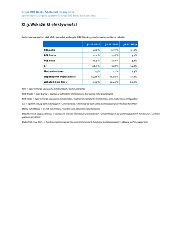 Grupa BRE Banku SA Raport roczny 2011 Sprawozdanie Zarządu z działalności Grupy BRE Banku SA w 2011 roku XI.3.Wskaźniki efektywności Podstawowe wskaźniki efektywności w Grupie BRE Banku przedstawia poniższa tabela: 31.12.2011 31.12.2010 31.12.2009 ROA netto 1,26 % 0,77 % 0,16% ROE brutto 21,0 % 15,6 % 5,1% ROE netto 16,4 % 11,8 % 3,2% C/I 48,3 % 51,8 % 54,2% 2,5% 2,2% 2,3% 14,96 % 15,90 % 11,50% 9,59 % 10,40 % 6,62% Marża odsetkowa Współczynnik wypłacalności Wskaźnik Core Tier 1 ROA = zysk netto (z udziałami mniejszości) / suma aktywów; ROE brutto = zysk brutto / kapitał (z udziałami mniejszości, bez zysku roku bieżącego); ROE netto = zysk netto (z udziałami mniejszości / kapitał (z udziałami mniejszości, bez zysku roku bieżącego); C/I = ogólne koszty administracyjne + amortyzacja / dochody (w tym saldo pozostałych przychodów/kosztów; Marża odsetkowa = wynik odsetkowy / średni stan aktywów odsetkowych; Współczynnik wypłacalności = fundusze własne (fundusze podstawowe i uzupełniające po pomniejszeniach funduszy) / aktywa ważone ryzykiem; Wskaźnik Core Tier 1 = fundusze podstawowe (po pomniejszeniach funduszy podstawowych) / aktywa ważone ryzykiem.