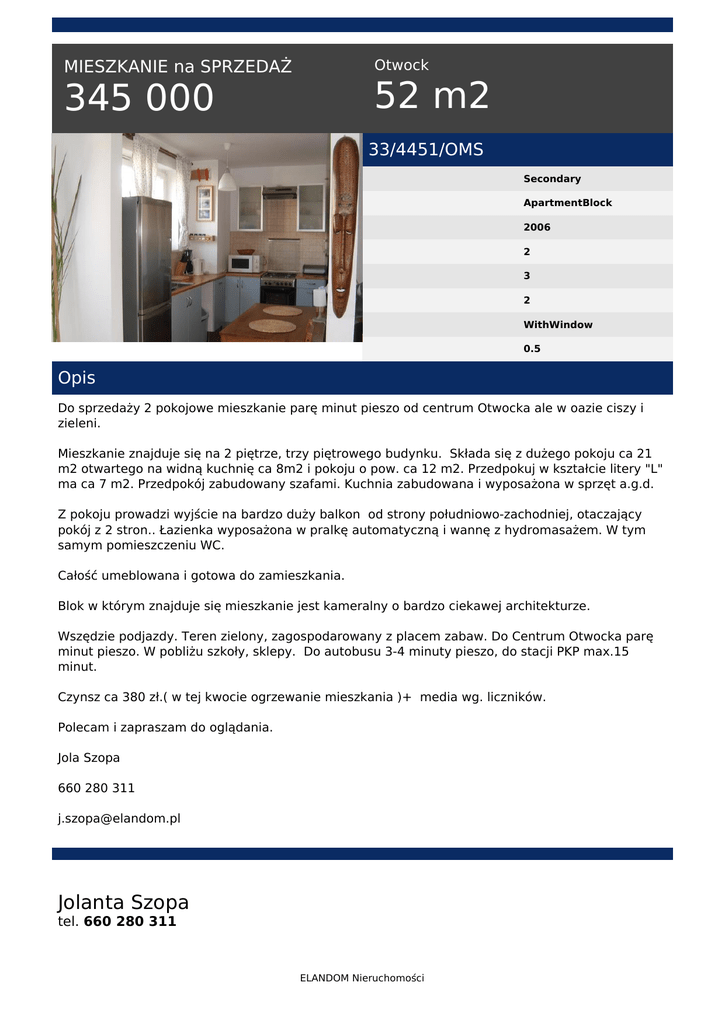 Otwock MIESZKANIE na SPRZEDAŻ 52 m2 345 000 33/4451/OMS Secondary ApartmentBlock 2006 2 3 2 WithWindow 0.5 Opis Do sprzedaży 2 pokojowe mieszkanie parę minut pieszo od centrum Otwocka ale w oazie ciszy i zieleni. Mieszkanie znajduje się na 2 piętrze, trzy piętrowego budynku. Składa się z dużego pokoju ca 21 m2 otwartego na widną kuchnię ca 8m2 i pokoju o pow. ca 12 m2. Przedpokuj w kształcie litery "L" ma ca 7 m2. Przedpokój zabudowany szafami. Kuchnia zabudowana i wyposażona w sprzęt a.g.d. Z pokoju prowadzi wyjście na bardzo duży balkon od strony południowo-zachodniej, otaczający pokój z 2 stron.. Łazienka wyposażona w pralkę automatyczną i wannę z hydromasażem. W tym samym pomieszczeniu WC. Całość umeblowana i gotowa do zamieszkania. Blok w którym znajduje się mieszkanie jest kameralny o bardzo ciekawej architekturze. Wszędzie podjazdy. Teren zielony, zagospodarowany z placem zabaw. Do Centrum Otwocka parę minut pieszo. W pobliżu szkoły, sklepy. Do autobusu 3-4 minuty pieszo, do stacji PKP max.15 minut. Czynsz ca 380 zł.( w tej kwocie ogrzewanie mieszkania )+ media wg. liczników. Polecam i zapraszam do oglądania. Jola Szopa 660 280 311 [email protected] Jolanta Szopa tel. 660 280 311 ELANDOM Nieruchomości email: [email protected] ELANDOM Nieruchomości Powered by TCPDF (www.tcpdf.org)