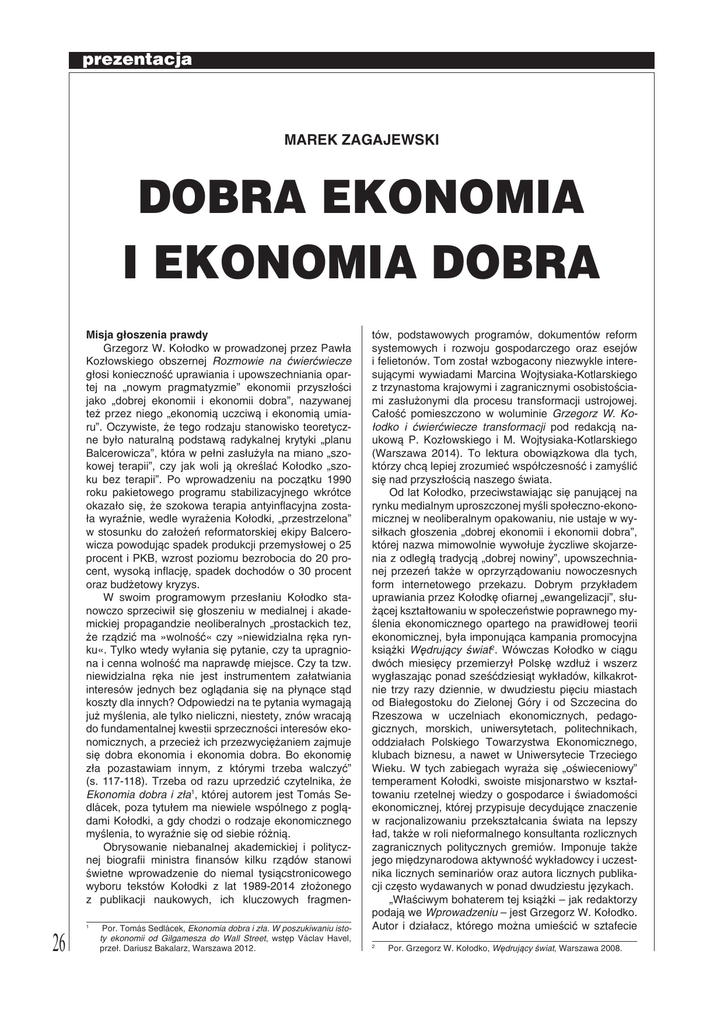 prezentacja MAREK ZAGAJEWSKI DOBRA EKONOMIA I EKONOMIA DOBRA Misja głoszenia prawdy Grzegorz W. Kołodko w prowadzonej przez Pawła Kozłowskiego obszernej Rozmowie na ćwierćwiecze głosi konieczność uprawiania i upowszechniania opartej na „nowym pragmatyzmie” ekonomii przyszłości jako „dobrej ekonomii i ekonomii dobra”, nazywanej też przez niego „ekonomią uczciwą i ekonomią umiaru”. Oczywiste, że tego rodzaju stanowisko teoretyczne było naturalną podstawą radykalnej krytyki „planu Balcerowicza”, która w pełni zasłużyła na miano „szokowej terapii”, czy jak woli ją określać Kołodko „szoku bez terapii”. Po wprowadzeniu na początku 1990 roku pakietowego programu stabilizacyjnego wkrótce okazało się, że szokowa terapia antyinflacyjna została wyraźnie, wedle wyrażenia Kołodki, „przestrzelona” w stosunku do założeń reformatorskiej ekipy Balcerowicza powodując spadek produkcji przemysłowej o 25 procent i PKB, wzrost poziomu bezrobocia do 20 procent, wysoką inflację, spadek dochodów o 30 procent oraz budżetowy kryzys. W swoim programowym przesłaniu Kołodko stanowczo sprzeciwił się głoszeniu w medialnej i akademickiej propagandzie neoliberalnych „prostackich tez, że rządzić ma »wolność« czy »niewidzialna ręka rynku«. Tylko wtedy wyłania się pytanie, czy ta upragniona i cenna wolność ma naprawdę miejsce. Czy ta tzw. niewidzialna ręka nie jest instrumentem załatwiania interesów jednych bez oglądania się na płynące stąd koszty dla innych? Odpowiedzi na te pytania wymagają już myślenia, ale tylko nieliczni, niestety, znów wracają do fundamentalnej kwestii sprzeczności interesów ekonomicznych, a przecież ich przezwyciężaniem zajmuje się dobra ekonomia i ekonomia dobra. Bo ekonomię zła pozastawiam innym, z którymi trzeba walczyć” (s. 117-118). Trzeba od razu uprzedzić czytelnika, że Ekonomia dobra i zła1, której autorem jest Tomás Sedlácek, poza tytułem ma niewiele wspólnego z poglądami Kołodki, a gdy chodzi o rodzaje ekonomicznego myślenia, to wyraźnie się od siebie różnią. Obrysowanie niebanalnej akademickiej i politycznej biografii ministra finansów kilku rządów stanowi świetne wprowadzenie do niemal tysiącstronicowego wyboru tekstów Kołodki z lat 1989-2014 złożonego z publikacji naukowych, ich kluczowych fragmen1 26 Por. Tomás Sedlácek, Ekonomia dobra i zła. W poszukiwaniu istoty ekonomii od Gilgamesza do Wall Street, wstęp Václav Havel, przeł. Dariusz Bakalarz, Warszawa 2012. tów, podstawowych programów, dokumentów reform systemowych i rozwoju gospodarczego oraz esejów i felietonów. Tom został wzbogacony niezwykle interesującymi wywiadami Marcina Wojtysiaka-Kotlarskiego z trzynastoma krajowymi i zagranicznymi osobistościami zasłużonymi dla procesu transformacji ustrojowej. Całość pomieszczono w woluminie Grzegorz W. Kołodko i ćwierćwiecze transformacji pod redakcją naukową P. Kozłowskiego i M. Wojtysiaka-Kotlarskiego (Warszawa 2014). To lektura obowiązkowa dla tych, którzy chcą lepiej zrozumieć współczesność i zamyślić się nad przyszłością naszego świata. Od lat Kołodko, przeciwstawiając się panującej na rynku medialnym uproszczonej myśli społeczno-ekonomicznej w neoliberalnym opakowaniu, nie ustaje w wysiłkach głoszenia „dobrej ekonomii i ekonomii dobra”, której nazwa mimowolnie wywołuje życzliwe skojarzenia z odległą tradycją „dobrej nowiny”, upowszechnianej przezeń także w oprzyrządowaniu nowoczesnych form internetowego przekazu. Dobrym przykładem uprawiania przez Kołodkę ofiarnej „ewangelizacji”, służącej kształtowaniu w społeczeństwie poprawnego myślenia ekonomicznego opartego na prawidłowej teorii ekonomicznej, była imponująca kampania promocyjna książki Wędrujący świat2. Wówczas Kołodko w ciągu dwóch miesięcy przemierzył Polskę wzdłuż i wszerz wygłaszając ponad sześćdziesiąt wykładów, kilkakrotnie trzy razy dziennie, w dwudziestu pięciu miastach od Białegostoku do Zielonej Góry i od Szczecina do Rzeszowa w uczelniach ekonomicznych, pedagogicznych, morskich, uniwersytetach, politechnikach, oddziałach Polskiego Towarzystwa Ekonomicznego, klubach biznesu, a nawet w Uniwersytecie Trzeciego Wieku. W tych zabiegach wyraża się „oświeceniowy” temperament Kołodki, swoiste misjonarstwo w kształtowaniu rzetelnej wiedzy o gospodarce i świadomości ekonomicznej, której przypisuje decydujące znaczenie w racjonalizowaniu przekształcania świata na lepszy ład, także w roli nieformalnego konsultanta rozlicznych zagranicznych politycznych gremiów. Imponuje także jego międzynarodowa aktywność wykładowcy i uczestnika licznych seminariów oraz autora licznych publikacji często wydawanych w ponad dwudziestu językach. „Właściwym bohaterem tej książki – jak redaktorzy podają we Wprowadzeniu – jest Grzegorz W. Kołodko. Autor i działacz, którego można umieścić w sztafecie 2 Por. Grzegorz W. Kołodko, Wędrujący świat, Warszawa 2008. prezentacja naszych realistycznych intelektualistów, zaangażowanych i niepokornych. Przed nim byli inni wielcy tworzący polską szkołę ekonomii: Czesław Bobrowski, Józef Pajestka, Tadeusz Kowalik… Nie wymieniamy wszystkich. Tak jak oni profesor Kołodko jest zawsze twórczo obecny w najważniejszych debatach. Uczony i obywatel, współczesny uczestnik tworzącej naszą kulturę i formującą naród inteligencji. Ideowo zaangażowany na rzecz społecznego postępu, moralnie stabilny i nonkonformistyczny, realizujący wzór opisanego przez Tadeusza Kotarbińskiego spolegliwego opiekuna, ale uogólnionego na całą społeczność” (s. 12). Na tym tle Kołodko lokuje się znakomicie jako byt samoistny, na swój sposób osobny, samodzielny i znacząca indywidualność tak w świecie nauki jak i polityki. Zabawną ilustracją tego stanu rzeczy jest pyszna opowieść Kołodki o tym, jak we wrześni