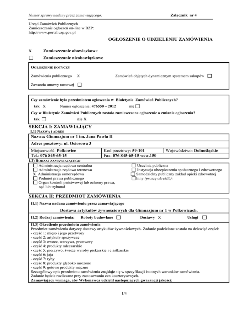 Numer sprawy nadany przez zamawiającego: Załącznik nr 4 Urząd Zamówień Publicznych Zamieszczanie ogłoszeń on-line w BZP: http://www.portal.uzp.gov.pl OGŁOSZENIE O UDZIELENIU ZAMÓWIENIA Zamieszczanie obowiązkowe X Zamieszczanie nieobowiązkowe OGŁOSZENIE DOTYCZY Zamówienia publicznego X Zamówień objętych dynamicznym systemem zakupów Zawarcia umowy ramowej Czy zamówienie było przedmiotem ogłoszenia w Biuletynie Zamówień Publicznych? tak X Numer ogłoszenia: 476550 – 2012 nie Czy w Biuletynie Zamówień Publicznych zostało zamieszczone ogłoszenie o zmianie ogłoszenia? tak nie X SEKCJA I: ZAMAWIAJĄCY I.1) NAZWA I ADRES Nazwa: Gimnazjum nr 1 im. Jana Pawła II Adres pocztowy: ul. Ociosowa 3 Miejscowość: Polkowice Tel.: 076 845-65-15 Kod pocztowy: 59-101 Fax: 076 845-65-15 wew.150 I.2) RODZAJ ZAMAWIAJĄCEGO Administracja rządowa centralna Administracja rządowa terenowa X Administracja samorządowa Podmiot prawa publicznego Organ kontroli państwowej lub ochrony prawa, sąd lub trybunał Województwo: Dolnośląskie Uczelnia publiczna Instytucja ubezpieczenia społecznego i zdrowotnego Samodzielny publiczny zakład opieki zdrowotnej Inny (proszę określić): SEKCJA II: PRZEDMIOT ZAMÓWIENIA II.1) Nazwa nadana zamówieniu przez zamawiającego Dostawa artykułów żywnościowych dla Gimnazjum nr 1 w Polkowicach. II.2) Rodzaj zamówienia: Roboty budowlane Dostawy X Usługi II.3) Określenie przedmiotu zamówienia Przedmiot zamówienia dotyczy dostawy artykułów żywnościowych. Zadanie podzielone zostało na dziewięć części: - część 1: mięso i jego przetwory - część 2: artykuły spożywcze - część 3: owoce, warzywa, przetwory - część 4: produkty mleczarskie - część 5: pieczywo, świeże wyroby piekarskie i ciastkarskie - część 6: jaja - część 7: ryby - część 8: produkty głęboko mrożone - część 9: gotowe produkty mączne Szczegółowy opis przedmiotu zamówienia znajduje się w specyfikacji istotnych warunków zamówienia. Zadanie będzie rozliczane przy zastosowaniu cen kosztorysowych. Zamawiający wymaga, aby Wykonawca udzielił następujących gwarancji jakości: 1/4 Numer sprawy nadany przez zamawiającego: Załącznik nr 4 Dostarczany przedmiot dostawy musi odpowiadać wymogom określonym przez rozporządzenie (WE) nr 852/2004 Parlamentu Europejskiego i Rady z dnia 29 kwietnia 2004 r. w sprawie higieny środków spożywczych (Dz. Urz. UE L 139 z 30.04.2004, str. 1; Dz. Urz. UE Polskie wydanie specjalne, rozdz. 13, t. 34, str. 319), jak również ustawę z dnia 25 sierpnia 2006 r. o bezpieczeństwie żywności i żywienia (t.j. Dz.U. z 2010 r. Nr 136, poz. 914) oraz przez inne akty prawne z zakresu prawa żywnościowego. Zamawiający dopuszcza składanie ofert częściowych. Jeden wykonawca może złożyć oferty na nie więcej niż dwie części. Zamawiający dopuszcza zastosowanie produktów równoważnych do wskazanych w niniejszej specyfikacji i jej załącznikach. Warunkiem zastosowania materiałów i produktów równoważnych jest posiadanie przez te materiały i produkty takich samych parametrów technicznych charakteryzujących, stanowiących o ich przydatności, charakterze itp. Zamawiający nie przewiduje udzielania zaliczek na poczet wykonania zamówienia. II.4) WSPÓLNY SŁOWNIK ZAMÓWIEŃ (CPV) Słownik główny Główny przedmiot 15100000-9 – produkty zwierzęce, mięso i produkty mięsne 15800000-6 – różne produkty spożywcze 15300000-1 – warzywa i owoce 15500000-3 – produkty mleczarskie 15600000-4 – produkty z ziarna i skrobi 03142500-3 – jaja 15200000-0 – ryby i przetwory rybne 15896000-5 – produkty głęboko mrożone 15851000-8 – gotowe produkty mączne Dodatkowe przedmioty SEKCJA III: PROCEDURA III.1) TRYB UDZIELENIA ZAMÓWIENIA Przetarg nieograniczony X Przetarg ograniczony Negocjacje z ogłoszeniem Dialog konkurencyjny III.2) INFORMACJE ADMINISTRACYJNE Negocjacje bez ogłoszenia Zamówienie z wolnej ręki Zapytanie o cenę Licytacja elektroniczna Zamówienie dotyczy projektu/programu finansowanego ze środków Unii Europejskiej tak wskazać projekt/program: nie X SEKCJA IV: UDZIELENIE ZAMÓWIENIA CZĘŚĆ nr 2 NAZWA Dostawa różnych produktów spożywczych. IV.1) DATA UDZIELENIA ZAMÓWIENIA: 31.12.2012r. (dd/mm/rrrr) IV.2) LICZBA OTRZYMANYCH OFERT: 2 IV.3) LICZBA ODRZUCONYCH OFERT: 1 IV.4) NAZWA I ADRES WYKONAWCY, KTÓREMU UDZIELONO ZAMÓWIENIA Nazwa: Zakład Handlu i Usług KAMA, mgr Czesław Kaczan Adres pocztowy: Łaszczyn 25A Miejscowość: Rawicz Kod pocztowy: 63-900 Kraj/województwo: wielkopolskie IV.5) SZACUNKOWA WARTOŚĆ ZAMÓWIENIA (bez VAT) 28764,52 zł IV.6) INFORMACJA O CENIE WYBRANEJ OFERTY ORAZ O OFERTACH Z NAJNIŻSZĄ I NAJWYŻSZĄ CENĄ Cena wybranej oferty 23196,52 zł Oferta z najniższą ceną 23196,52 zł / Oferta z najwyższą ceną 24357,02 zł Waluta: PLN 2/4 Numer sprawy nadany przez zamawiającego: Załącznik nr 4 CZĘŚĆ nr 3 NAZWA Dostawa owoców i warzyw. IV.1) DATA UDZIELENIA ZAMÓWIENIA: 31.12.2012r. (dd/mm/rrrr) IV.2) LICZBA OTRZYMANYCH OFERT: 1 IV.3) LICZBA ODRZUCONYCH OFERT: 0 IV.4) NAZWA I ADRES WYKONAWCY, KTÓREMU UDZIELONO ZAMÓWIENIA Nazwa: Hurtownia Stępień, Czesław, Urszula, Piotr, Paweł Stępień spółka jawna Adres pocztowy: ul. Dąbrowskiego 29 Miejscowość: Polkowice Kod pocztowy: 59-100 Kraj/województwo: dolnośląskie IV.5) SZACUNKOWA WARTOŚĆ ZAMÓWIENIA (bez VAT) 41545,20 zł IV.6) INFORMACJA O CENIE WYBRANEJ OFERTY ORAZ O OFERTACH Z NAJNIŻSZĄ I NAJWYŻSZĄ CENĄ Cena wybranej oferty 40500,07 zł Oferta z najniższą ceną 40500,07 zł / Oferta z najwyższą ceną 40500,07 zł Waluta: PLN CZĘŚĆ nr 4 NAZWA Dostawa produktów mleczarskich. IV.1) DATA UDZIELENIA ZAMÓWIENIA: 31.12.2012r (dd/mm/rrrr) IV.2) LICZBA OTRZYMANYCH OFERT: 1 IV.3) LICZBA ODRZUCONYCH OFERT: 0 IV.4) NAZWA I ADRES WYKONAWCY, KTÓREMU UDZIELONO ZAMÓWIENIA Nazwa: „DARS” Adamczak, Stanek spółka jawna Adres pocztowy: ul. Kolejowa 1 Miejscowość: Wsch