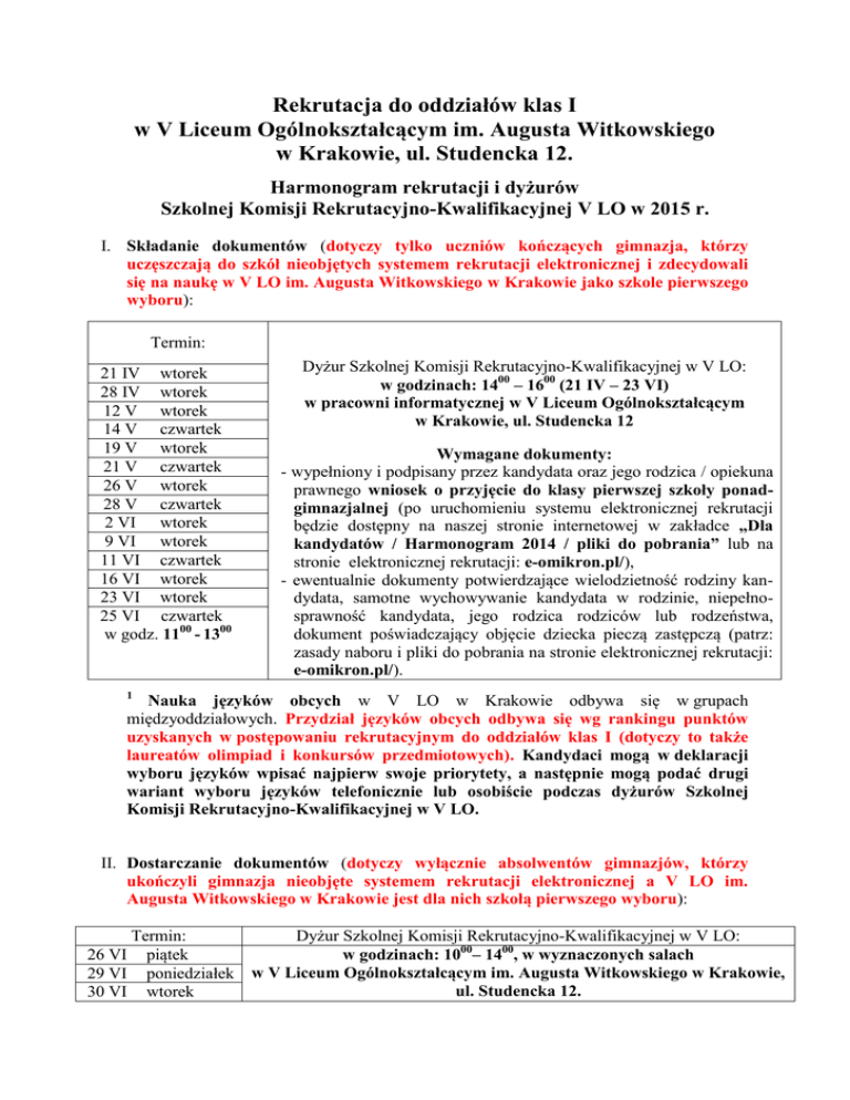 Rekrutacja do oddziałów klas I w V Liceum Ogólnokształcącym im. Augusta Witkowskiego w Krakowie, ul. Studencka 12. Harmonogram rekrutacji i dyżurów Szkolnej Komisji Rekrutacyjno-Kwalifikacyjnej V LO w 2015 r. I. Składanie dokumentów (dotyczy tylko uczniów kończących gimnazja, którzy uczęszczają do szkół nieobjętych systemem rekrutacji elektronicznej i zdecydowali się na naukę w V LO im. Augusta Witkowskiego w Krakowie jako szkole pierwszego wyboru): Termin: 21 IV wtorek 28 IV wtorek 12 V wtorek 14 V czwartek 19 V wtorek 21 V czwartek 26 V wtorek 28 V czwartek 2 VI wtorek 9 VI wtorek 11 VI czwartek 16 VI wtorek 23 VI wtorek 25 VI czwartek w godz. 1100 - 1300 Dyżur Szkolnej Komisji Rekrutacyjno-Kwalifikacyjnej w V LO: w godzinach: 1400 – 1600 (21 IV – 23 VI) w pracowni informatycznej w V Liceum Ogólnokształcącym w Krakowie, ul. Studencka 12 Wymagane dokumenty: - wypełniony i podpisany przez kandydata oraz jego rodzica / opiekuna prawnego wniosek o przyjęcie do klasy pierwszej szkoły ponadgimnazjalnej (po uruchomieniu systemu elektronicznej rekrutacji będzie dostępny na naszej stronie internetowej w zakładce „Dla kandydatów / Harmonogram 2014 / pliki do pobrania” lub na stronie elektronicznej rekrutacji: e-omikron.pl/), - ewentualnie dokumenty potwierdzające wielodzietność rodziny kandydata, samotne wychowywanie kandydata w rodzinie, niepełnosprawność kandydata, jego rodzica rodziców lub rodzeństwa, dokument poświadczający objęcie dziecka pieczą zastępczą (patrz: zasady naboru i pliki do pobrania na stronie elektronicznej rekrutacji: e-omikron.pl/). 1 Nauka języków obcych w V LO w Krakowie odbywa się w grupach międzyoddziałowych. Przydział języków obcych odbywa się wg rankingu punktów uzyskanych w postępowaniu rekrutacyjnym do oddziałów klas I (dotyczy to także laureatów olimpiad i konkursów przedmiotowych). Kandydaci mogą w deklaracji wyboru języków wpisać najpierw swoje priorytety, a następnie mogą podać drugi wariant wyboru języków telefonicznie lub osobiście podczas dyżurów Szkolnej Komisji Rekrutacyjno-Kwalifikacyjnej w V LO. II. Dostarczanie dokumentów (dotyczy wyłącznie absolwentów gimnazjów, którzy ukończyli gimnazja nieobjęte systemem rekrutacji elektronicznej a V LO im. Augusta Witkowskiego w Krakowie jest dla nich szkołą pierwszego wyboru): 26 VI 29 VI 30 VI Termin: piątek poniedziałek wtorek Dyżur Szkolnej Komisji Rekrutacyjno-Kwalifikacyjnej w V LO: w godzinach: 1000– 1400, w wyznaczonych salach w V Liceum Ogólnokształcącym im. Augusta Witkowskiego w Krakowie, ul. Studencka 12. Wymagane dokumenty: - poświadczona przez dyrektora gimnazjum kopia świadectwa ukończenia gimnazjum, - poświadczona przez dyrektora gimnazjum kopia zaświadczenia o wyniku egzaminu gimnazjalnego, - poświadczone kopie (lub ksero + oryginał do wglądu) zaświadczeń o uzyskaniu tytułu laureata lub finalisty etapu ponadwojewódzkiego / wojewódzkiego konkursów przedmiotowych organizowanych przez kuratora oświaty, - w przypadku kandydatów z wadami słuchu, wzroku, narządów ruchu i innymi schorzeniami orzeczenie kwalifikacyjne publicznej poradni psychologiczno-pedagogicznej, w tym publicznej poradni specjalistycznej, - ewentualnie zaświadczenia o szczególnych osiągnięciach ucznia, które nie zostały wpisane na świadectwie ukończenia gimnazjum z braku miejsca. Uwaga! Przy składaniu dokumentów nie jest wymagana obecność kandydata. III. Ogłoszenie przez Szkolną Komisję Rekrutacyjno-Kwalifikacyjną w V LO im. Augusta Witkowskiego w Krakowie list kandydatów przyjętych do oddziałów klas I oraz list kandydatów niezakwalifikowanych do przyjęcia do oddziałów klas I: Termin: 3 VII (piątek) godz. 1100, tablice ogłoszeń w holu głównym V LO w Krakowie. IV. Potwierdzanie woli podjęcia nauki w V LO im. Augusta Witkowskiego w Krakowie przez kandydatów umieszczonych na listach zakwalifikowanych do przyjęcia do oddziałów klas I: 3 VII 6 VII 7 VII Termin: piątek poniedziałek wtorek Dyżur Szkolnej Komisji Rekrutacyjno-Kwalifikacyjnej w V LO: w godzinach: 1100– 1300, w wyznaczonych salach w V LO w godzinach: 1000– 1500, w wyznaczonych salach w V LO w godzinach : 1000– 1500, w wyznaczonych salach w V LO Potwierdzenie woli podjęcia nauki w V LO im. Augusta Witkowskiego wymaga złożenia oryginałów świadectwa ukończenia gimnazjum i egzaminu gimnazjalnego. Prosimy również o złożenie: - kopii lub kserokopii poświadczonych zaświadczeń o uzyskaniu tytułu finalisty lub laureata wojewódzkiego konkursu przedmiotowego dla gimnazjalistów (dotyczy kandydatów, którzy nie złożyli ich wcześniej), - absolwenci gimnazjów objętych rekrutacją elektroniczną dostarczają dodatkowo wypełniony i podpisany przez kandydata oraz jego rodzica / opiekuna prawnego wniosek o przyjęcie do klasy pierwszej szkoły ponadgimnazjalnej (po uruchomieniu systemu elektronicznej rekrutacji dostępny będzie na naszej stronie internetowej w zakładce „Dla kandydatów / Harmonogram 2015 / pliki do pobrania” lub na stronie elektronicznej rekrutacji: e-omikron.pl/), - dwóch zdjęć (na odwrocie podpisanych imieniem i nazwiskiem), - kserokopii skróconego aktu urodzenia ucznia. - karty zdrowia ucznia (do odbioru w gabinecie medycznym macierzystego gimnazjum). V. Ogłoszenie przez Szkolną Komisję Rekrutacyjno-Kwalifikacyjną w V LO im. Augusta Witkowskiego w Krakowie list przyjętych do oddziałów klas I w roku szk. 2015/2016: Termin: 8 VII (środa) do godz. 1000, tablice ogłoszeń w holu głównym V LO w Krakowie. 8 lipca 2015 r. (środa) o godz. 1700 – zebranie rodziców uczniów przyjętych do klas I VI. Rekrutacja uzupełniająca (będzie prowadzona tylko wtedy, gdy V LO im. Augusta Witkowskiego w Krakowie będzie dysponowało wolnymi miejscami w oddziałach klas I na rok szkolny 2015/2016): Termin: 9 VII czwartek 10 VII piątek Dyżur Szkolnej Komisji Rekrutacyjno-Kwalifikacyjnej w V LO: