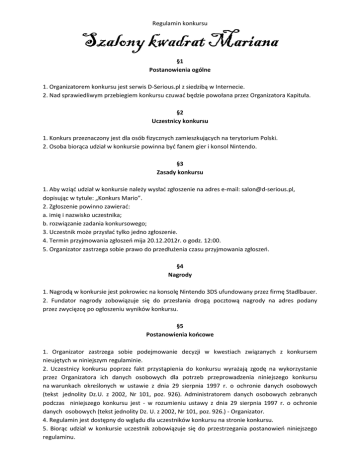 Regulamin konkursu Szalony kwadrat Mariana §1 Postanowienia ogólne 1. Organizatorem konkursu jest serwis D-Serious.pl z siedzibą w Internecie. 2. Nad sprawiedliwym przebiegiem konkursu czuwać będzie powołana przez Organizatora Kapituła. §2 Uczestnicy konkursu 1. Konkurs przeznaczony jest dla osób fizycznych zamieszkujących na terytorium Polski. 2. Osoba biorąca udział w konkursie powinna być fanem gier i konsol Nintendo. §3 Zasady konkursu 1. Aby wziąć udział w konkursie należy wysłać zgłoszenie na adres e-mail: [email protected], dopisując w tytule: „Konkurs Mario”. 2. Zgłoszenie powinno zawierać: a. imię i nazwisko uczestnika; b. rozwiązanie zadania konkursowego; 3. Uczestnik może przysłać tylko jedno zgłoszenie. 4. Termin przyjmowania zgłoszeń mija 20.12.2012r. o godz. 12:00. 5. Organizator zastrzega sobie prawo do przedłużenia czasu przyjmowania zgłoszeń. §4 Nagrody 1. Nagrodą w konkursie jest pokrowiec na konsolę Nintendo 3DS ufundowany przez firmę Stadlbauer. 2. Fundator nagrody zobowiązuje się do przesłania drogą pocztową nagrody na adres podany przez zwycięzcę po ogłoszeniu wyników konkursu. §5 Postanowienia końcowe 1. Organizator zastrzega sobie podejmowanie decyzji w kwestiach związanych z konkursem nieujętych w niniejszym regulaminie. 2. Uczestnicy konkursu poprzez fakt przystąpienia do konkursu wyrażają zgodę na wykorzystanie przez Organizatora ich danych osobowych dla potrzeb przeprowadzenia niniejszego konkursu na warunkach określonych w ustawie z dnia 29 sierpnia 1997 r. o ochronie danych osobowych (tekst jednolity Dz.U. z 2002, Nr 101, poz. 926). Administratorem danych osobowych zebranych podczas niniejszego konkursu jest - w rozumieniu ustawy z dnia 29 sierpnia 1997 r. o ochronie danych osobowych (tekst jednolity Dz. U. z 2002, Nr 101, poz. 926.) - Organizator. 4. Regulamin jest dostępny do wglądu dla uczestników konkursu na stronie konkursu. 5. Biorąc udział w konkursie uczestnik zobowiązuje się do przestrzegania postanowień niniejszego regulaminu.