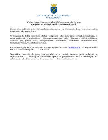 Wydawnictwo Uniwersytetu Jagiellońskiego zatrudni do biura specjalistę ds. obsługi publikacji elektronicznych. Zakres obowiązków to m.in: obsługa platform internetowych, obsługa ebooków i czasopism online, współpraca międzynarodowa. Wymagania: b. dobra znajomość obsługi komputera i chęć rozwijania nowych umiejętności, b. dobra znajomość j. angielskiego, doskonała organizacja pracy i kontakt z ludźmi, efektywne działanie pod presją czasu, zaangażowanie, sumienność, dokładność, odpowiedzialność, komunikatywność, wykształcenie wyższe. List motywacyjny i CV ze zdjęciem prosimy wysyłać na adres: [email protected] lub Wydawnictwo UJ, ul. Michałowskiego 9/2, 31-126 Kraków. Warunkiem przyjęcia do pracy jest zatrudnienie w ramach stosunku pracy wyłącznie w Wydawnictwie UJ. Prosimy o dostarczenie zgody na przetwarzanie danych osobowych. Po zakończeniu rekrutacji wszystkie dokumenty zostaną komisyjnie zniszczone.