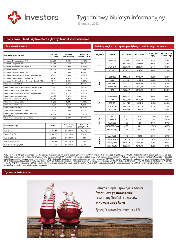 Tygodniowy biuletyn informacyjny 17 grudnia 2012 r. Stopy zwrotu funduszy Investors i głównych indeksów rynkowych Fundusze Investors Indeksy akcji, stawki rynku pieniężnego i walutowego, surowce Segment Indeks Zmiana tygodn io wa Zmiana o d po czątku roku Inv estor Zrównoważony F IO 328,54 1,56% 15,49% WIG 20 Inv estor Obligacji FIO 281,11 0,17% 8,68% WIG Inv estor Akcji Duży ch Spółek FIO 367,68 2,92% 16,79% mWIG 40 Inv estor Akcji FIO 162,03 2,26% 21,65% sWIG 80 Inv estor Pły nna Lokata FIO 217,24 0,08% 4,26% 23,42 0,99% 13,80% 180,43 2,07% 24,55% Inv estor Zabezpieczenia Emery talnego FIO Inv estor Top 25 Mały ch Spółek F IO 07.12.2012 Zm. tyg. (% / bps) Zm. od pocz. roku (% / bps) 2536,8 2450,74 3,5% 18,3% 46912,94 45538,45 3,0% 24,8% 2587,03 2533,81 2,1% 19,0% 10310,1 10143,43 1,6% 21,3% 12,4% 14.12.2012 S&P 500 1413,58 1418,07 -0,3% DJIA 13135,01 13155,13 -0,2% 7,5% NASDAQ 2971,335 2978,04 -0,2% 14,1% 0,94% 18,33% 67 0,31% 4,00% (Sub.) Inv estor Nieruchomości i Budownictwa 56,61 -0,77% 2,02% Nikkei 225 9737,56 9527,39 2,2% 15,2% (Sub.) Inv estor Zmian Klimaty czny ch 53,52 -0,19% -0,26% DAX 7596,47 7517,80 1,0% 28,8% (Sub.) Inv estor Inf rastruktury i Inf ormaty ki 56,2 1,77% 15,05% BOVESPA 59604,92 58487,32 1,9% 5,0% RTS 1500,89 1471,09 2,0% 8,6% SENSEX 19317,25 19424,10 -0,6% 25,0% 0,07% 3,80% 207,15 -1,45% 1,53% (Sub.) Inv estor Agrobiznes 191,96 -0,11% 14,79% (Sub.) Inv estor Rosja 149,07 -0,50% -0,36% (Sub.) Inv estor Turcja 213,04 -2,32% 44,43% (Sub.) Inv estor Indie i C hiny 170,02 -1,76% 4,38% (Sub.) Inv estor Zrównoważony Ry nków Wschodzący ch 145,97 0,15% 11,91% (Sub.) Inv estor Amery ka Łacińska 170,23 0,40% 0,77% WAN/CI Data ostatniej w yceny Zmiana od początku roku Investor FIZ 1 051,47 2012-11-30 -42,11% Investor Gold FIZ 2 550,27 2012-11-30 5,91% Investor CEE FIZ 393,43 2012-11-30 -4,14% Investor Property FIZ 1 040,88 2012-09-30 1,39% Investor Private Equity FIZ 1 544,99 2012-09-30 4,50% Fundusz zamknięty EM 122,22 (Sub.) Inv estor Gold Otwarty MM / FX (Sub.) Inv estor Gotówkowy DM 42,73 (Sub.) Inv estor BRIC Surowce Inv estor Top 50 Mały ch i Średnich Spółek FIO PL WAN/JU 14.12.2012 Fund usz/Su bfu ndusz SHCOMP 2150,63 2061,79 4,3% -2,2% ISE 100 76293,15 76242,20 0,1% 48,8% EURPLN 4,08 4,12 -1,0% -8,5% USDPLN 3,10 3,19 -2,7% -10,0% EURUSD 1,32 1,29 1,8% 1,6% WIBOR6M (bps) 4,09 4,21 -12,0% -81,0% PZSW5 (bps) 3,47 3,52 -4,5% -133,3% ropa (USD) 110,04 106,89 2,9% 2,3% miedź (USD) 8043,75 8012,25 0,4% 6,0% złoto (USD) 1696,10 1704,05 -0,5% 8,5% złoto (EUR) 1288,05 1316,89 -2,2% 6,8% WIG – Indeks giełdy polskiej, WIG20 – Indeks 20 największych i najpłynniejszych spółek giełdowych, mWIG40 - Indeks 40 średnich spółek giełdowych, sWIG80 – Indeks 80 małych spółek giełdowych, S&P500 Indeks 500 największych spółek notowanych na rynku amerykańskim, DIJA - Indeks 30 największych spółek notowanych na rynku amerykańskim, NASDAQ - Indeks spółek amerykańskich, Nikkei225 - Indeks 225 największych spółek notowanych na rynku japońskim, DAX – Indeks 30 największych spółek notowanych na rynku niemieckim, BOVESPA - Indeks największych i najbardziej płynnych spółek rynku brazylijskiego, RTS - Indeks największych spółek rynku rosyjskiego, SENSEX - Indeks największych i najbardziej płynnych spółek rynku indyjskiego, SHCOMP - Indeks giełdy chińskiej, ISE100 - Indeks giełdy tureckiej, WIBOR6M – stawka WIBOR 6 miesięczna, PZSW5 - stawka 5 letniego swapa (pięcioletnia stopa procentowa), PL – Polska, DM – kraje rozwinięte, EM – kraje rozwijające się, MM/FX – rynek pieniężny/walutowy, ropa – cena ropy naftowej, miedź – cena miedzi, złoto – cena złota. Życzenia świąteczne Pragniemy Państwa uprzejmie poinformować, że następny „Tygodniowy biuletyn informacyjny” ukaże się 7 stycznia 2013 roku. Komentarz rynkowy Miniony tydzień nie przyniósł zysków amerykańskim inwestorom, ale zmiany głównych indeksów nie były znaczące. S&P500 stracił w ciągu tygodnia 0.32%, podczas gdy DJIA i Nasdaq spadły odpowiednio o 0.15% i 0.23%. Skupiający mniejsze spółki Russell2000 zyskał natomiast symboliczne 0.18%. Lepiej niż giełdy w USA zachowywały się akcje europejskie, które generalnie drożały, silna była też Japonia i emerging markets. Produkcja przemysłowa w USA wzrosła w listopadzie o 1.1%, co było wynikiem lepszym, niż oczekiwali analitycy, jednak dane za październik zostały zrewidowane w dół. Lepszy był też odczyt dotyczący wykorzystania mocy produkcyjnych. Pozytywnie zaskoczyły też dane z rynku pracy, liczba wniosków o zasiłki dla bezrobotnych wyniosła 343 tys. i była o 27 tys. niższa niż oczekiwano. Wskaźnik PMI dla przemysłu wyniósł 54.2, wobec konsensusu na poziomie 52.3. Rozczarowujące były natomiast dane dotyczące listopadowej sprzedaży detalicznej. Uspokajające doniesienia popłynęły od przedstawicieli Republikanów w Kongresie, którzy mają nadzieję, że porozumienie budżetowe zostanie wkrótce osiągnięte. Oczekują najpierw jednak, że prezydent Obama przedstawi plan cięcia wydatków, przed czym Demokraci bardzo się wzbraniają. Do końca roku pozostało bardzo niewiele czasu szczególnie, że wkraczamy w okres świąteczny, dlatego rozmowy dotyczące klifu fiskalnego będą jeszcze pewnie prowadzone w styczniu. Środowa konferencja Fedu nie przyniosła wiele nowego. Zgodnie z oczekiwaniami stopy pozostały na rekordowo niskim poziomie, a operacje twist mają zostać zastąpione programem zakupu papierów dłużnych za 45 mld USD miesięcznie. Stopy mają pozostać na niezmienionym poziomie dopóki stopa bezrobocia w Stanach Zjednoczonych nie spadnie do poziomu 6.5%. Obniżona została natomiast prognoza wzrostu amerykańskiej gospodarki z 2.5-3.0% do 2.3-3.0%. Na zachowaniu indeksów podczas tygodnia najbardziej ciążyły notowania Apple’a, kapitalizacja spółki spadła w ciągu ostatnich pięciu sesji o ponad 4%. Sł