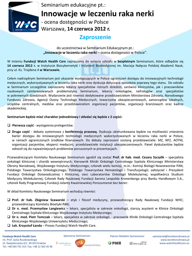 Seminarium edukacyjne pt.: Innowacje w leczeniu raka nerki - ocena dostępności w Polsce Warszawa, 14 czerwca 2012 r. Zaproszenie do uczestnictwa w Seminarium Edukacyjnym pt.: „Innowacje w leczeniu raka nerki – ocena dostępności w Polsce”. W imieniu Fundacji Watch Health Care zapraszamy do wzięcia udziału w bezpłatnym Seminarium, które odbędzie się 14 czerwca 2012 r. w Instytucie Biocybernetyki i Inżynierii Biomedycznej im. Macieja Nałęcza Polskiej Akademii Nauk, przy ul. Ks. Trojdena 4 w Warszawie. Celem nadrzędnym Seminarium jest ukazanie występujących w Polsce ograniczeń dostępu do innowacyjnych technologii medycznych, wykorzystywanych w leczeniu raka nerki oraz dyskusja dotycząca sposobów poprawy tego stanu. Do udziału w Seminarium szczególnie zapraszamy lekarzy specjalistów różnych dziedzin, zarówno klinicystów, jak i pracowników naukowych zainteresowanych problematyką Seminarium, lekarzy onkologów, nefrologów oraz specjalistów w pokrewnych dziedzinach. Wydarzenie jest również dedykowane przedstawicielom Ministerstwa Zdrowia, Narodowego Funduszu Zdrowia, Agencji Oceny Technologii Medycznych, towarzystw ubezpieczeniowych, samorządów lokalnych, urzędów centralnych, mediów oraz przedstawicielom organizacji pacjentów, organizacji branżowych oraz kadrze akademickiej. Seminarium będzie mieć charakter jednodniowy i składać się będzie z 2 części: Pierwsza część - wystąpienia prelegentów. Druga część - debata systemowa z konferencją prasową. Dyskusja ukierunkowana będzie na możliwości zniesienia barier dostępu do innowacyjnych technologii medycznych wykorzystywanych w leczeniu raka nerki w Polsce, w ramach ograniczonych środków finansowych. Do debaty zaproszeni zostaną przedstawiciele: MZ, NFZ, AOTM, organizacji pacjentów, eksperci medyczni, przedstawiciele instytucji ubezpieczeniowych. Panel dyskutantów będzie odnosił się do najważniejszych problemów poruszonych w prezentacjach. Przewodniczącym Komitetu Naukowego Seminarium zgodził się zostać Prof. dr hab. med. Cezary Szczylik – specjalista onkologii klinicznej i chorób wewnętrznych; Kierownik Kliniki Onkologii Centralnego Szpitala Klinicznego Ministerstwa Obrony Narodowej, Wojskowego Instytutu Medycznego; członek wielu komisji, m.in.: Komisji Biologii Nowotworów PAN, Polskiego Towarzystwa Onkologicznego, Polskiego Towarzystwa Hematologii i Transfuzjologii; założyciel i Prezydent Fundacji Onkologii Doświadczalnej i Klinicznej, sieci Laboratoriów Onkologii Molekularnej; współtwórca Studium Medycyny Molekularnej; Członek Rady Naukowej Fundacji barona Leopolda Kronenberga przy Banku Handlowym S.A., członek Rady Programowej Fundacji Jolanty Kwaśniewskiej Porozumienie bez barier. W skład Komitetu Naukowego Seminarium wchodzą również: Prof. dr hab. Zbigniew Szawarski – etyk i filozof medycyny, przewodniczący Rady Naukowej Fundacji WHC; przewodniczący Komitetu Bioetyki PAN; Dr n. med. Przemysław Langiewicz – lekarz, specjalista w zakresie onkoilogii, starszy asystent w Klinice Onkologii Centralnego Szpitala Klinicznego Wojskowego Instytutu Medycznego; Dr n. med. Piotr Tomczak – lekarz, specjalista w zakresie onkologii, - pracownik Kliniki Onkologii Centralnego Szpitala Klinicznego Wojskowego Uniwersytetu Medycznego; Lek. Krzysztof Łanda – Prezes Fundacji Watch Health Care. Fundacja Watch Health Care im. Prof. Jacka Ruszkowskiego Ul. Świętokrzyska 4/1, 30-015 Kraków Tel. +48 504 741 313 Fax. +48 12 362 45 46 Sponsorzy Seminarium: Patroni Medialni Seminarium: [email protected] www.korektorzdrowia.pl www.watchhealthcare.eu Seminarium edukacyjne pt.: Innowacje w leczeniu raka nerki - ocena dostępności w Polsce Warszawa, 14 czerwca 2012 r. PROGRAM SEMINARIUM 10:00-10:15 Otwarcie: Przedstawienie Komitetu Naukowego oraz uczestników dyskusji (Lek. Krzysztof Łanda) 10:15-10:40 Prof. Cezary Szczylik – Systemowy wpływ rozbieżności między wskazaniami rejestracyjnymi a kryteriami włączenia do programów terapeutycznych w RCC w Polsce 10:40-11:25 Wystąpienia przedstawicieli Ministerstwa Zdrowia oraz Narodowego Funduszu Zdrowia* 11:25-11:40 Anna Brzezińska – Rekomendacje AOTM dotyczące kompleksowego leczenia raka nerki w ramach programu terapeutycznego-lekowego* 11:40-11:55 Zbyt późne wykrywanie raka nerki – rola lekarzy pierwszego kontaktu* 11:55-12:15 Programy terapeutyczne a programy lekowe w raku nerki – jakie będą konsekwencje dla chorych* 12:15-12:30 Dostępność do operacyjnego leczenia przerzutów raka nerki w Polsce* 12:30-12:45 Dostępność do małoinwazyjnych metod ablacji guzów nerek w Polsce* 12:45-13:00 Przerwa kawowa 13:00-13:15 Potencjał i dostępność do małoinwazyjnych metod chirurgicznych w leczeniu raka nerki* 13:15-13:30 Wiarygodność wnioskowania z porównań pośrednich na przykładzie pazopanibu* 13:30-13:45 Dostępność i potencjał terapii celowanej w leczeniu raka nerki* 13:45-14:00 Dostępność do nowoczesnych leków stosowanych w raku nerki w Polsce, na tle innych krajów UE* 14:00-14:15 Lek. Krzysztof Łanda – Niekonstytucyjna nierówność dostępu do chemioterapii niestandardowej na obszarze Polski 14:15-14:30 Przerwa kawowa 14:30-14:45 Marcin Pająk – Mapowanie ograniczeń dostępu do świadczeń zdrowotnych – działalność Fundacji Watch Health Care 14:45-15:00 Paulina Przywara – Monitorowanie sprawności zarządzania koszykiem gwarantowanym w Polsce – „Barometr WHC” 15:00-16:15 Dyskusja z konferencją prasową, dotycząca możliwości rozwiązania problemów z dostępem do innowacyjnych technologii wykorzystywanych w leczeniu raka nerki w Polsce (dyskusję poprowadzi lek. Krzysztof Łanda) 16:15-16:30 Lek. Krzysztof Łanda – Potrzeby informacyjne pacjentów - wytyczne i standardy postępowania w Poradniku Pacjenta, na portalu WHC, a następnie zamknięcie Seminarium 16:30-17:00 Poczęstunek i nieformalne dyskusje w foyer TERMIN I MIEJSCE: 14 czerwca 2012 r., Inst