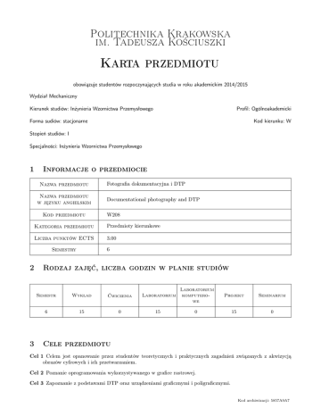 Politechnika Krakowska im. Tadeusza Kościuszki Karta przedmiotu obowiązuje studentów rozpoczynających studia w roku akademickim 2014/2015 Wydział Mechaniczny Kierunek studiów: Inżynieria Wzornictwa Przemysłowego Profil: Ogólnoakademicki Forma sudiów: stacjonarne Kod kierunku: W Stopień studiów: I Specjalności: Inżynieria Wzornictwa Przemysłowego 1 Informacje o przedmiocie Nazwa przedmiotu Nazwa przedmiotu w języku angielskim Kod przedmiotu 3 Documentational photography and DTP W208 Kategoria przedmiotu Przedmioty kierunkowe Liczba punktów ECTS 3.00 6 Semestry 2 Fotografia dokumentacyjna i DTP Rodzaj zajęć, liczba godzin w planie studiów Semestr Wykład Ćwiczenia Laboratorium Laboratorium komputerowe Projekt Seminarium 6 15 0 15 0 15 0 Cele przedmiotu Cel 1 Celem jest opanowanie przez studentów teoretycznych i praktycznych zagadnień związanych z akwizycją obrazów cyfrowych i ich przetwarzaniem. Cel 2 Poznanie oprogramowania wykorzystywanego w grafice rastrowej. Cel 3 Zapoznanie z podstawami DTP oraz urządzeniami graficznymi i poligraficznymi. Kod archiwizacji: 5857A9A7 Politechnika Krakowska im. Tadeusza Kościuszki 4 Wymagania wstępne w zakresie wiedzy, umiejętności i innych kompetencji 1 Znajomość podstawowych zagadnień z fizyki (barwy i optyka). 2 Znajomość obsługi komputera. 5 Efekty kształcenia EK1 Wiedza Student który zaliczył przedmiot posiada wiedzę na temat struktury obrazów cyfrowych, dyskretyzacji, znajomość formatów zapisy grafiki rastrowej i algorytmy kompresji. EK2 Wiedza Student który zaliczył przedmiot umie scharakteryzować algorytmy przetwarzania obrazu oraz posiada znajomość filtrów. EK3 Umiejętności Student który zaliczył przedmiot posiada umiejętność posługiwania się aparatem cyfrowym. EK4 Umiejętności Student który zaliczył przedmiot umie posługiwać się oprogramowaniem do grafiki rastrowej. EK5 Umiejętności Student który zaliczył przedmiot potrafi przygotować publikacje do druku oraz zaprojektować stronę internetową. EK6 Kompetencje społeczne Student który zaliczył przedmiot potrafi uzasadnić w zespole wybraną metodę akwizycji obrazu. 6 Treści programowe Wykład Lp Tematyka zajęć Opis szczegółowy bloków tematycznych Liczba godzin W1 Wprowadzenie do grafiki komputerowej oraz obszary jej zastosowań. 1 W2 Sprzęt do akwizycji i przetwarzania obrazów. Przetworniki CCD i CMOS. 2 W3 Kompozycja obrazu, głębia ostrości, balans bieli, podstawy optyki. 2 W4 Modele barw i percepcja obrazu. Gammut i system Pantone. 2 W5 Grafika rastrowa, akwizycja, przetwarzanie, formaty i kompresja. 2 W6 Przygotowanie materiałów do druku. 2 W7 Format RAW i konwersja na inne formaty. 2 W8 Skalowanie i kadrowanie zdjęć. 1 W9 Druk cyfrowy i offsetowy. 1 Laboratorium Lp Tematyka zajęć Opis szczegółowy bloków tematycznych Strona 2/7 Liczba godzin Politechnika Krakowska im. Tadeusza Kościuszki Laboratorium Lp Tematyka zajęć Opis szczegółowy bloków tematycznych Liczba godzin L1 Wykonanie zdjęć przedmiotu z wykorzystaniem różnych rodzajów oświetlenia. 4 L2 Wykonanie reprodukcji obrazu, plakatu. 1 L3 Skanowanie obiektu. 1 L4 Edycja zarejestrowanych obrazów. 4 L5 Korekta barwna z wykorzystaniem różnych modeli kolorów. 2 L6 Fonty i zasada tworzenia krojów pisma. 2 L7 Przygotowanie publikacji do druku cyfrowego i offsetowego. 1 Projekt 7 Lp Tematyka zajęć Opis szczegółowy bloków tematycznych P1 Omówienie projektów w grupach. 2 P2 Przygotowanie folderu do druku z własnoręcznie wykonanymi zdjęciami. 10 P3 Wykonanie graficznego projektu strony internetowej. 2 P4 Prezentacja zrealizowanych projektów. 1 Narzędzia dydaktyczne N1 Wykłady N2 Ćwiczenia laboratoryjne N3 Ćwiczenia projektowe N4 Prezentacje multimedialne N5 Praca w grupach Strona 3/7 Liczba godzin Politechnika Krakowska im. Tadeusza Kościuszki 8 Obciążenie pracą studenta Średnia liczba godzin na zrealizowanie aktywności Forma aktywności Godziny kontaktowe z nauczycielem akademickim, w tym: Godziny wynikające z planu studiów 0 Konsultacje przedmiotowe 5 Egzaminy i zaliczenia w sesji 5 Godziny bez udziału nauczyciela akademickiego wynikające z nakładu pracy studenta, w tym: Przygotowanie się do zajęć, w tym studiowanie zalecanej literatury 10 Opracowanie wyników 5 Przygotowanie raportu, projektu, prezentacji, dyskusji 20 Sumaryczna liczba godzin dla przedmiotu wynikająca z całego nakładu pracy studenta 45 Sumaryczna liczba punktów ECTS dla przedmiotu 9 3.00 Sposoby oceny Ocena formująca F1 Ćwiczenie praktyczne F2 Projekt indywidualny Ocena podsumowująca P1 Średnia ważona ocen formujących P2 Projekt Kryteria oceny Efekt kształcenia 1 Na ocenę 2.0 jw Na ocenę 3.0 Student potrafi korzystać z urządzeń do akwizycji obrazu, przetwarzać obrazy, posiada znajomość DTP i potrafi zaprojektować broszurę i stronę ww. Na ocenę 3.5 jw Na ocenę 4.0 jw Na ocenę 4.5 jw Strona 4/7 Politechnika Krakowska im. Tadeusza Kościuszki Na ocenę 5.0 jw Efekt kształcenia 2 Na ocenę 2.0 - Na ocenę 3.0 jw Na ocenę 3.5 - Na ocenę 4.0 - Na ocenę 4.5 - Na ocenę 5.0 Efekt kształcenia 3 Na ocenę 2.0 - Na ocenę 3.0 jw Na ocenę 3.5 - Na ocenę 4.0 - Na ocenę 4.5 - Na ocenę 5.0 Efekt kształcenia 4 Na ocenę 2.0 - Na ocenę 3.0 jw Na ocenę 3.5 - Na ocenę 4.0 - Na ocenę 4.5 - Na ocenę 5.0 Efekt kształcenia 5 Na ocenę 2.0 - Na ocenę 3.0 jw Na ocenę 3.5 - Na ocenę 4.0 - Na ocenę 4.5 - Strona 5/7 Politechnika Krakowska im. Tadeusza Kościuszki Na ocenę 5.0 Efekt kształcenia 6 Na ocenę 2.0 - Na ocenę 3.0 jw Na ocenę 3.5 - Na ocenę 4.0 - Na ocenę 4.5 - Na ocenę 5.0 - 10 Macierz realizacji przedmiotu Efekt kształcenia Odniesienie danego efektu do szczegółowych efektów zdefiniowanych dla programu Cele przedmiotu Treści programowe Narzędzia dydaktyczne Sposoby oceny EK1 K1_W11, K1_US06 Cel 1 Cel 2 W1 W2 W3 W4 W5 W6 W7 W8 W9 L1 L2 L3 L4 L5 L6 N1 N2 N3 N4 N5 F1 F2 EK2 K1_W11, K1_US06 Cel 1 Cel 2 