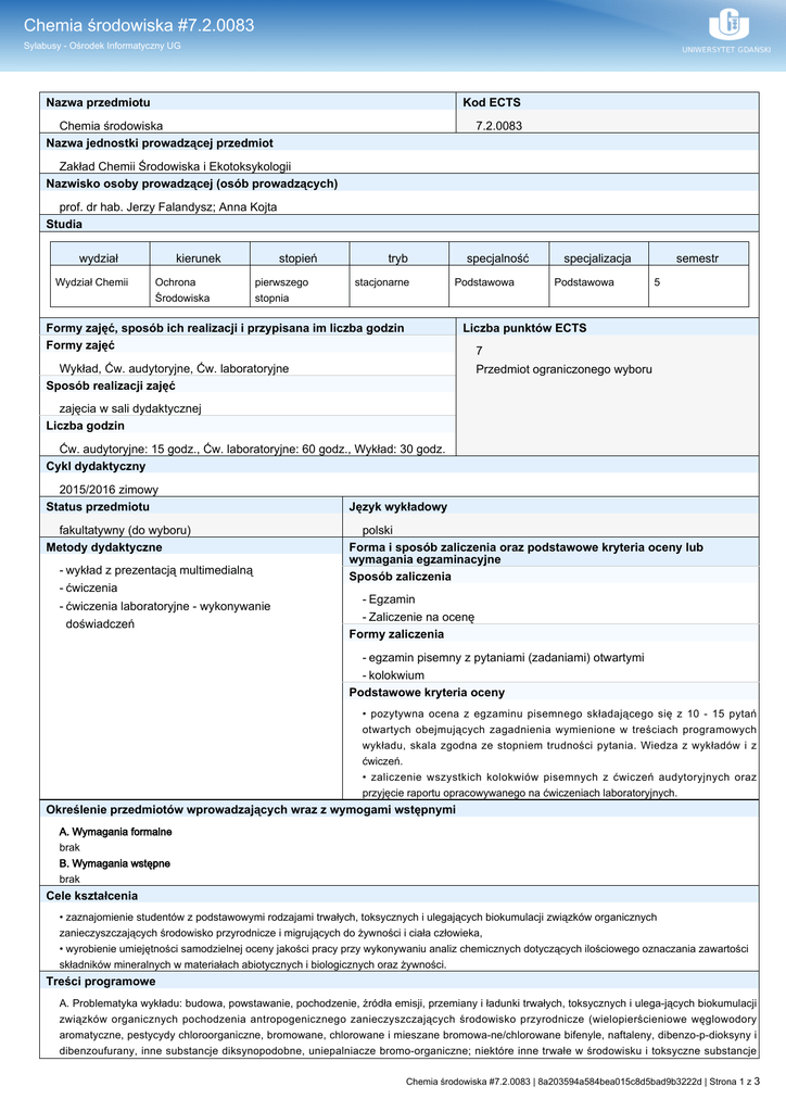 Chemia środowiska #7.2.0083 Sylabusy - Ośrodek Informatyczny UG Nazwa przedmiotu Kod ECTS Chemia środowiska Nazwa jednostki prowadzącej przedmiot 7.2.0083 Zakład Chemii Środowiska i Ekotoksykologii Nazwisko osoby prowadzącej (osób prowadzących) prof. dr hab. Jerzy Falandysz; Anna Kojta Studia wydział Wydział Chemii kierunek Ochrona Środowiska stopień pierwszego stopnia tryb stacjonarne specjalność Podstawowa Formy zajęć, sposób ich realizacji i przypisana im liczba godzin Formy zajęć specjalizacja Podstawowa semestr 5 Liczba punktów ECTS 7 Przedmiot ograniczonego wyboru Wykład, Ćw. audytoryjne, Ćw. laboratoryjne Sposób realizacji zajęć zajęcia w sali dydaktycznej Liczba godzin Ćw. audytoryjne: 15 godz., Ćw. laboratoryjne: 60 godz., Wykład: 30 godz. Cykl dydaktyczny 2015/2016 zimowy Status przedmiotu fakultatywny (do wyboru) Metody dydaktyczne - wykład z prezentacją multimedialną - ćwiczenia - ćwiczenia laboratoryjne - wykonywanie doświadczeń Język wykładowy polski Forma i sposób zaliczenia oraz podstawowe kryteria oceny lub wymagania egzaminacyjne Sposób zaliczenia - Egzamin - Zaliczenie na ocenę Formy zaliczenia - egzamin pisemny z pytaniami (zadaniami) otwartymi - kolokwium Podstawowe kryteria oceny • pozytywna ocena z egzaminu pisemnego składającego się z 10 - 15 pytań otwartych obejmujących zagadnienia wymienione w treściach programowych wykładu, skala zgodna ze stopniem trudności pytania. Wiedza z wykładów i z ćwiczeń. • zaliczenie wszystkich kolokwiów pisemnych z ćwiczeń audytoryjnych oraz przyjęcie raportu opracowywanego na ćwiczeniach laboratoryjnych. Określenie przedmiotów wprowadzających wraz z wymogami wstępnymi A. Wymagania formalne brak B. Wymagania wstępne brak Cele kształcenia • zaznajomienie studentów z podstawowymi rodzajami trwałych, toksycznych i ulegających biokumulacji związków organicznych zanieczyszczających środowisko przyrodnicze i migrujących do żywności i ciała człowieka, • wyrobienie umiejętności samodzielnej oceny jakości pracy przy wykonywaniu analiz chemicznych dotyczących ilościowego oznaczania zawartości składników mineralnych w materiałach abiotycznych i biologicznych oraz żywności. Treści programowe A. Problematyka wykładu: budowa, powstawanie, pochodzenie, źródła emisji, przemiany i ładunki trwałych, toksycznych i ulega-jących biokumulacji związków organicznych pochodzenia antropogenicznego zanieczyszczających środowisko przyrodnicze (wielopierścieniowe węglowodory aromatyczne, pestycydy chloroorganiczne, bromowane, chlorowane i mieszane bromowa-ne/chlorowane bifenyle, naftaleny, dibenzo-p-dioksyny i dibenzoufurany, inne substancje diksynopodobne, uniepalniacze bromo-organiczne; niektóre inne trwałe w środowisku i toksyczne substancje Chemia środowiska #7.2.0083 | 8a203594a584bea015c8d5bad9b3222d | Strona 1 z 3 Chemia środowiska #7.2.0083 Sylabusy - Ośrodek Informatyczny UG stosowane w celach przemysłowych, problem rtęci, arsenu i cyny i ich związków w środowisku) – atmosfera, hydrosfera, litosfera i biosfera. Niektóre katastrofy chemiczne. Chemia atmosfery: budowa, skład i ewolucja atmosfery, reakcje chemiczne i fotochemiczne w atmosferze; jony, rodniki i cząsteczki wzbudzone w atmosferze; reakcje atmosferycznego tlenu, azotu, siarki, węgla; woda w atmosferze; pyły; smog chemiczny i fotochemiczny; problem ozonu. B. Problematyka ćwiczeń audytoryjnych: podstawowe rodzaje trwałych, toksycznych oraz ulegających biokumulacji substancji organicznych zanieczyszczających środowiska przyrodnicze i żywność. C. Problematyka ćwiczeń laboratoryjnych: podstawy pracy laboratoryjnej przy pobieraniu próbek materiałów środowiskowych, biologicznych i żywności w celu przeprowadzenia analiz chemicznych dotyczących zawartości składników mineralnych oraz organicznych związków chemicznych zanieczyszczających środowisko przyrodnicze, sposoby przygotowania i zabezpieczania materiałów do badań chemicznych wraz z praktycznymi zajęciami terenowymi. Wykaz literatury A. Literatura wymagana do ostatecznego zaliczenia zajęć (zdania egzaminu): A.1. Treści wykładu A.2. Studiowana samodzielnie przez studenta: materiały z ćwiczeń audytoryjnych B. Literatura uzupełniająca J. Falandysz – Polichlorowane bifenyle (PCBs) w środowisku: chemia, analiza, toksyczność, stężenia i ocena ryzyka. Efekty uczenia się K_W03 charakteryzuje związki i zależności pomiędzy różnymi dyscyplinami nauk przyrodniczych i ścisłych, wykorzystuje wiedzę z zakresu matematyki, fizyki, chemii i biologii w opisie podstawowych pojęć, koncepcji oraz zasad w ochronie środowiska; K_W06 wyjaśnia przebieg naturalnych oraz wywołanych antropopresją fizycznych, chemicznych oraz biologicznych procesów i zjawisk zachodzących w przyrodzie na różnych poziomach organizacji materii; K_W09 wyjaśnia mechanizmy powstawania gospodarczej i konsumpcyjnej presji na środowisko oraz rozpoznaje możliwości jej ograniczania z wykorzystaniem najnowszej wiedzy i osiągnięć nauki; K_W11 opisuje podstawowe metody, techniki i narzędzia pozwalające na racjonalne wykorzystywanie, kształtowanie i odtwarzanie zasobów naturalnych; K_W13 definiuje podstawowe regulacje prawne i instrumenty stosowania prawa w ochronie środowiska; K_U03 ocenia funkcjonowanie naturalnych i zmienionych przez człowieka systemów przyrodniczych oraz określa wpływ antropopresji na określone procesy zachodzące w środowisku naturalnym; K_U06 posługuje się terminologią z zakresu ochrony środowiska oraz nomenklaturą poszczególnychc dyscyplin z nią związanych ; K_K01 identyfikuje poziom swojej wiedzy i umiejętności oraz potrzebę ciagłego dokształcania się zawodowego, aktualizowania wiedzy o środowisku i jego ochronie oraz rozwoju osobistego; K_K02 dokonuje samooceny własnych kompetencji i doskonali umiejętności, wyznacza kierunki własnego rozwoju i kształcenia;