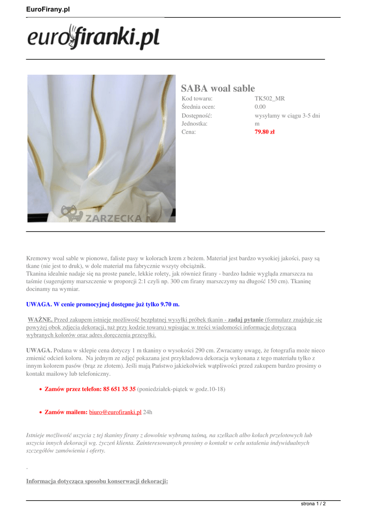 EuroFirany.pl SABA woal sable Kod towaru: Średnia ocen: Dostępność: Jednostka: Cena: TK502_MR 0.00 wysyłamy w ciągu 3-5 dni m 79.80 zł Kremowy woal sable w pionowe, faliste pasy w kolorach krem z beżem. Materiał jest bardzo wysokiej jakości, pasy są tkane (nie jest to druk), w dole materiał ma fabrycznie wszyty obciążnik. Tkanina idealnie nadaje się na proste panele, lekkie rolety, jak również firany - bardzo ładnie wygląda zmarszcza na taśmie (sugerujemy marszczenie w proporcji 2:1 czyli np. 300 cm firany marszczymy na długość 150 cm). Tkaninę docinamy na wymiar. UWAGA. W cenie promocyjnej dostępne już tylko 9.70 m. WAŻNE. Przed zakupem istnieje możliwość bezpłatnej wysyłki próbek tkanin - zadaj pytanie (formularz znajduje się powyżej obok zdjęcia dekoracji, tuż przy kodzie towaru) wpisując w treści wiadomości informację dotyczącą wybranych kolorów oraz adres doręczenia przesyłki. UWAGA. Podana w sklepie cena dotyczy 1 m tkaniny o wysokości 290 cm. Zwracamy uwagę, że fotografia może nieco zmienić odcień koloru. Na jednym ze zdjęć pokazana jest przykładowa dekoracja wykonana z tego materiału tylko z innym kolorem pasów (brąz ze złotem). Jeśli mają Państwo jakiekolwiek wątpliwości przed zakupem bardzo prosimy o kontakt mailowy lub telefoniczny. Zamów przez telefon: 85 651 35 35 (poniedziałek-piątek w godz.10-18) Zamów mailem: [email protected] 24h Istnieje możliwość uszycia z tej tkaniny firany z dowolnie wybraną taśmą, na szelkach albo kołach przelotowych lub uszycia innych dekoracji wg. życzeń klienta. Zainteresowanych prosimy o kontakt w celu ustalenia indywidualnych szczegółów zamówienia i oferty. Informacja dotycząca sposobu konserwacji dekoracji: strona 1 / 2 EuroFirany.pl UWAGA ! Dozując proszek do prania należy zwracać uwagę na zalecane ilości, zgodnie ze stopniami zabrudzenia tekstyliów. Informację dotyczącą zalecanych ilości można znaleźć na każdym opakowaniu proszku do prania. strona 2 / 2 Powered by TCPDF (www.tcpdf.org)