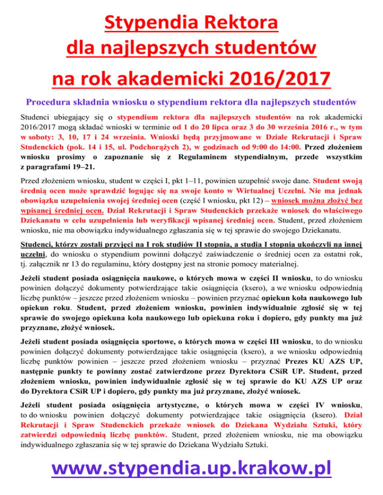 Stypendia Rektora dla najlepszych studentów na rok akademicki 2016/2017 Procedura składnia wniosku o stypendium rektora dla najlepszych studentów Studenci ubiegający się o stypendium rektora dla najlepszych studentów na rok akademicki 2016/2017 mogą składać wnioski w terminie od 1 do 20 lipca oraz 3 do 30 września 2016 r., w tym w soboty: 3, 10, 17 i 24 września. Wnioski będą przyjmowane w Dziale Rekrutacji i Spraw Studenckich (pok. 14 i 15, ul. Podchorążych 2), w godzinach od 9:00 do 14:00. Przed złożeniem wniosku prosimy o zapoznanie się z Regulaminem stypendialnym, przede wszystkim z paragrafami 19–21. Przed złożeniem wniosku, student w części I, pkt 1–11, powinien uzupełnić swoje dane. Student swoją średnią ocen może sprawdzić logując się na swoje konto w Wirtualnej Uczelni. Nie ma jednak obowiązku uzupełnienia swojej średniej ocen (część I wniosku, pkt 12) – wniosek można złożyć bez wpisanej średniej ocen. Dział Rekrutacji i Spraw Studenckich przekaże wniosek do właściwego Dziekanatu w celu uzupełnienia lub weryfikacji wpisanej średniej ocen. Student, przed złożeniem wniosku, nie ma obowiązku indywidualnego zgłaszania się w tej sprawie do swojego Dziekanatu. Studenci, którzy zostali przyjęci na I rok studiów II stopnia, a studia I stopnia ukończyli na innej uczelni, do wniosku o stypendium powinni dołączyć zaświadczenie o średniej ocen za ostatni rok, tj. załącznik nr 13 do regulaminu, który dostępny jest na stronie pomocy materialnej. Jeżeli student posiada osiągnięcia naukowe, o których mowa w części II wniosku, to do wniosku powinien dołączyć dokumenty potwierdzające takie osiągnięcia (ksero), a we wniosku odpowiednią liczbę punktów – jeszcze przed złożeniem wniosku – powinien przyznać opiekun koła naukowego lub opiekun roku. Student, przed złożeniem wniosku, powinien indywidualnie zgłosić się w tej sprawie do swojego opiekuna koła naukowego lub opiekuna roku i dopiero, gdy punkty ma już przyznane, złożyć wniosek. Jeżeli student posiada osiągnięcia sportowe, o których mowa w części III wniosku, to do wniosku powinien dołączyć dokumenty potwierdzające takie osiągnięcia (ksero), a we wniosku odpowiednią liczbę punktów powinien – jeszcze przed złożeniem wniosku – przyznać Prezes KU AZS UP, następnie punkty te powinny zostać zatwierdzone przez Dyrektora CSiR UP. Student, przed złożeniem wniosku, powinien indywidualnie zgłosić się w tej sprawie do KU AZS UP oraz do Dyrektora CSiR UP i dopiero, gdy punkty ma już przyznane, złożyć wniosek. Jeżeli student posiada osiągnięcia artystyczne, o których mowa w części to do wniosku powinien dołączyć dokumenty potwierdzające takie osiągnięcia Rekrutacji i Spraw Studenckich przekaże wniosek do Dziekana Wydziału zatwierdzi odpowiednią liczbę punktów. Student, przed złożeniem wniosku, nie indywidualnego zgłaszania się w tej sprawie do Dziekana Wydziału Sztuki. IV wniosku, (ksero). Dział Sztuki, który ma obowiązku www.stypendia.up.krakow.pl