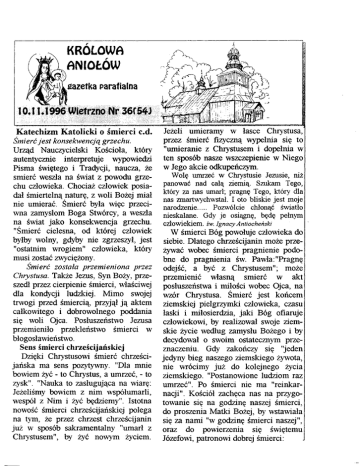 KROLOWA ANIOŁÓW gazetka parafialna 10.1 U 996 Wietrzno Nr 36f54J Katechizm Katolicki o śmierci c.d. Śmierć je st konsekwencją grzechu. Urząd Nauczycielski Kościoła, który autentycznie interpretuje wypowiedzi Pisma świętego i Tradycji, naucza, że śmierć weszła na świat z powodu grze chu człowieka. Chociaż człowiek posia dał śmiertelną naturę, z woli Bożej miał nie umierać. Śmierć była więc przeci wna zamysłom Boga Stwórcy, a weszła na świat jako konsekwencja grzechu. "Śmierć cielesna, od której człowiek byłby wolny, gdyby nie zgrzeszył, jest "ostatnim wrogiem" człowieka, który musi zostać zwyciężony. Śmierć została przemieniona przez Chrystusa. Także Jezus, Syn Boży, prze szedł przez cierpienie śmierci, właściwej dla kondycji ludzkiej. Mimo swojej trwogi przed śmiercią, przyjął ją aktem całkowitego i dobrowolnego poddania się woli Ojca. Posłuszeństwo Jezusa przemieniło przekleństwo śmierci w błogosławieństwo. Sens śmierci chrześcijańskiej Dzięki Chrystusowi śmierć chrześci jańska ma sens pozytywny. "Dla mnie bowiem żyć - to Chrystus, a umrzeć, - to zysk". "Nauka to zasługująca na wiarę: Jeżeliśmy bowiem z nim współumarli, wespół z Nim i żyć będziemy". Istotna nowość śmierci chrześcijańskiej polega na tym, że przez chrzest chrześcijanin już w sposób sakramentalny "umarł z Chrystusem", by żyć nowym życiem. Jeżeli umieramy w łasce Chrystusa, przez śmierć fizyczną wypełnia się to "umieranie z Chrystusem i dopełnia w ten sposób nasze wszczepienie w Niego w Jego akcie odkupeńczym. W olę umrzeć w Chrystusie Jezusie, niż panować nad całą ziemią. Szukam Tego, który za nas umarł; pragnę Tego, który dla nas zmartwychwstał. I oto bliskie jest moje narodzenie..... Pozwólcie chłonąć światło nieskalane. Gdy je osiągnę, będę pełnym człowiekiem, św. Ignacy Antiocheński W śmierci Bóg powołuje człowieka do siebie. Dlatego chrześcijanin może prze żywać wobec śmierci pragnienie podo bne do pragnienia św. Pawła. "Pragnę odejść, a być z Chrystusem"; może przemienić własną śmierć w akt posłuszeństwa i miłości wobec Ojca, na wzór Chrystusa. Śmierć jest końcem ziemskiej pielgrzymki człowieka, czasu łaski i miłosierdzia, jaki Bóg ofiaruje człowiekowi, by realizował swoje ziem skie życie według zamysłu Bożego i by decydował o swoim ostatecznym prze znaczeniu. Gdy zakończy się "jeden jedyny bieg naszego ziemskiego żywota, nie wrócimy już do kolejnego życia ziemskiego. "Postanowione ludziom raz umrzeć". Po śmierci nie ma "reinkar nacji". Kościół zachęca nas na przygo towanie się na godzinę naszej śmierci, do proszenia Matki Bożej, by wstawiała się za nami "w godzinę śmierci naszej", oraz do powierzenia się świętemu Józefowi, patronowi dobrej śmierci: NIEDZIELA XXXII Zw R. A. Mdr 1 Tes Mt 6,12-16; 4,13-18; 2 5 ,1 -1 3 Mów Panie, bo sługa Twój słucha ! Czyt I. - Autor księgi Mądrości, za mądrość uważa, umiejętność życia pobożnego zgodnego z Bożymi przykazaniami. Mądrość ta jest dla każdego dostępna i każdy człowiek może ją znaleźć. Wychodzi ona naprzeciw tych którzy ją szukają. Kto wstaje o świcie, znajduje ją siedzącą u drzwi. Niewielkim wysiłkiem, a właści wie niemal bez wysiłku, możesz posiąść wielki skarb, jakim jest umiejętność pobożnego życia. Korzy staj więc z tego i ubiegaj się o nią. Czyt. II - Na końcu świata przyjdzie tryumfalnie Jezus Chrystus. Wtedy Bóg wskrzesi umarłych tak jak wskrzesił Chrystusa. Zmartwychwstali i żywi utworzą orszak który wyjdzie naprzeciw Chrystusowi, przychodzą cemu z nieba na obłokach. To spot kanie nie będzie przelotnym spot kaniem, ale początkiem stałego prze bywania z Chrystusem \"W ten spo sób zawsze będziemy z Panem". Istotą tego przebywania z Panem będzie miłość, dająca szczęście prze kraczające wszelkie pojęcie:'1 Ani ucho nie słyszało, ani oko nie widzia ło, co Bóg zgotował tym, którzy Go miłują". Ewangelia. Chrystus wymaga od nas mądrości i czujności, ażeby nie popaść w zniechęcenie i zmęczenie, i N. Bohn 1 "Pan m łody idzie, wyjdźcie na spotkanie podczas oczekiwania na spotkanie z nim. Zapalony kaganek, to symbol wiary, która oświetla nasze życie, i symbol miłości, która rozpala w nas chęć działania. Jest także znakiem naszej przynależności do Chrystusa. Musi zawsze płonąć, bo Chrystus napewno przyjdzie, tylko nie wiemy kiedy. Każdy Chrześcijanin powinien być gotowy na Jego przyjście, na spotkanie z Nim. Czym są lampki oliwne w naszym życiu? Są nimi małe rzeczy dnia codziennego: wierność, punktualność, drobne słowa radości, pamięć o in nych, nasz sposób milczenia, patrze nia, mówienia i działania. Są nimi małe krople miłości, które sprawiają, że nasze życie wiarą świeci tak wielkim blaskiem. Matka Teresa □ .Dziś tj.3.11.po południu o ogz. 1500 Nabożeństwo i Różańcowe za zmarłych i Nowenna do bł. Jana z Dukli. □ Codziennie w tygodniu Msza św. o godz. 16.30 . D .W środę Nowenna Nieustająca. Hołd Matce Bożej składają dzieci kl IV □ .Wśrodę rocznica śmierci ks. Biskupa Franciszka Bardy. .□ . W sobotę dzień modlitwy w intencji Ojca Świętego Jana Pawła II □ . □ Rocznicę Chrztu św. obchodzą: 11,11 Marcin Korzec, Michał Korzec, Henryka Sajdak;13,11, Stanisław Kamiński, Zofia Longawa; 14,11 - Artur Biały, Maciej Byrczek, Tadeusz Długosz, Ewa Kamińska, Krzysztof Mikosz; 15,11, Krzysztof Jaracz; 17,11,- Stanisław Niemczyk, Bożena Włodyka; . Dzięki składajmy Panu Bogu naszemu. 53 Rocznicę ślubu obchodzą: 11,11 Zofia i Tadeusz Biały; 16,11,- Waleria i Zbigniew Janeski; 17,11,- Helena Stanisław Jastrzębski ; Gratulujemy i Bogu za przyczyną Królowej Aniołów polecamy, życząc sto lat. □ Rocznic śm ierci: 11,11 + Maria Marosz; 12,11 + Genowefa Czelny, Edward Kocur, Antonina Krężałek; 1