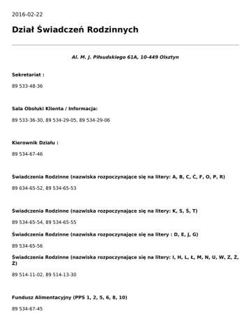 2016-02-22 Dział Świadczeń Rodzinnych Al. M. J. Piłsudskiego 61A, 10-449 Olsztyn Sekretariat : 89 533-48-36 Sala Obsłuki Klienta / Informacja: 89 533-36-30, 89 534-29-05, 89 534-29-06 Kierownik Działu : 89 534-67-46 Świadczenia Rodzinne (nazwiska rozpoczynające się na litery: A, B, C, Ć, F, O, P, R) 89 634-65-52, 89 534-65-53 Świadczenia Rodzinne (nazwiska rozpoczynające się na litery: K, S, Ś, T) 89 534-65-54, 89 534-65-55 Świadczenia Rodzinne (nazwiska rozpoczynające się na litery : D, E, J, G) 89 534-65-56 Świadczenia Rodzinne (nazwiska rozpoczynające się na litery: I, H, L, Ł, M, N, U, W, Z, Ż, Ź) 89 514-11-02, 89 514-13-30 Fundusz Alimentacyjny (PPS 1, 2, 5, 6, 8, 10) 89 534-67-45 Fundusz Alimentacyjny (PPS 3, 4, 7, 9) 89 534-28-69 Koordynacja systemów zabezpiecznia społecznego: 89 534-28-70 UWAGA!!! Niniejszym informujemy, że z dniem 02-01-2017 r. ulega zmianie adres filii Działu Świadczeń Rodzinnych MOPS w Olsztynie – Świadczenie Wychowawcze 500+ z dotychczasowego na: Al. M. J. Piłsudskiego 32 W związku z powyższym wszelką korespondencję dotyczącą świadczenia wychowawczego (500+) od 02-01-2017 r. prosimy kierować na nowy adres. Numery telefonów: Informacja – świadczenie wychowawcze 500+ 89 539 26 75 89 533 26 33 Sekretariat – świadczenie wychowawcze 500+ 89 533 04 72 89 533 16 41 (fax) Zastępca kierownika 89 533 17 40 Świadczenie wychowawcze (nazwiska zaczynające się na litery: A, J, Ka-Kł, Ł, Sa-Sy) 89 533 27 88 Świadczenie wychowawcze (nazwiska zaczynające się na litery: B, C, Ć, O, Pa-Pł, T) 89 526 58 22 Świadczenie wychowawcze (nazwiska zaczynające się na litery: D, F, G, I, R, Sz) 89 526 60 17 Świadczenie wychowawcze (nazwiska zaczynające się na litery: E, Km-Kz, L, M) 89 526 57 40 Świadczenie wychowawcze (nazwiska zaczynające się na litery: H, N, Pm-Pz, Q, Ś, U, W, V, X, Y, Z, Ź, Ż) 89 526 73 17