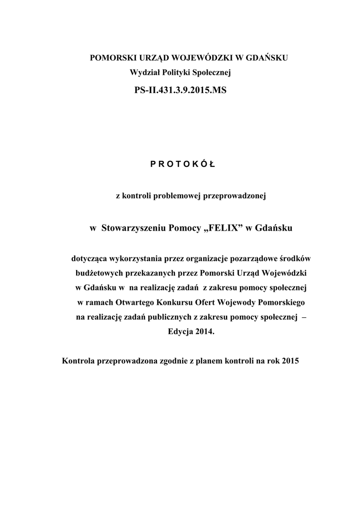 POMORSKI URZĄD WOJEWÓDZKI W GDAŃSKU Wydział Polityki Społecznej PS-II.431.3.9.2015.MS PROTOKÓŁ z kontroli problemowej przeprowadzonej w Stowarzyszeniu Pomocy „FELIX” w Gdańsku dotycząca wykorzystania przez organizacje pozarządowe środków budżetowych przekazanych przez Pomorski Urząd Wojewódzki w Gdańsku w na realizację zadań z zakresu pomocy społecznej w ramach Otwartego Konkursu Ofert Wojewody Pomorskiego na realizację zadań publicznych z zakresu pomocy społecznej – Edycja 2014. Kontrola przeprowadzona zgodnie z planem kontroli na rok 2015 2 I. Zasady i warunki organizacji kontroli Działając na podstawie art. 28 ustawy z dnia 23 stycznia 2009 r. i administracji rządowej w województwie (Dz. U. Nr 31, poz. 206 o wojewodzie z późn. zm.), art. 17 ustawy z dnia 24 kwietnia 2003 r. o działalności pożytku publicznego i o wolontariacie (j.t. Dz. U. z 2014 r. poz. 1118 z późn. zm.), w związku z art. 25 ust. 1 i ust. 5 ustawy z dnia 12 marca 2004r. o pomocy społecznej ( j.t. Dz. U. z 2013 r. poz. 182 z późń. zm.), rozporządzenia Ministra Polityki Społecznej z dnia 23 marca 2005 r. w sprawie nadzoru i kontroli w pomocy społecznej (Dz. U. Nr 61, poz. 543 z późn. zm.) oraz umów zawartych w ramach Otwartego Konkursu Ofert Wojewody Pomorskiego – edycja 2014 r., przeprowadzona została kontrola problemowa w Stowarzyszeniu Pomocy „FELIX’ w Gdańsku obejmująca wykorzystanie w 2014 r. środków budżetowych przekazanych przez Pomorski Urząd Wojewódzki w Gdańsku na realizację zadań z zakresu pomocy społecznej. Kontrolę przeprowadzono w siedzibie Stowarzyszenia Pomocy „FELIX” – Gdańsk, ul. Srebrniki 17 (budynek XXI parter). Pod adresem tym funkcjonuje również Zespół Kształcenia Podstawowego i Gimnazjalnego nr 32 przy Wojewódzkim Szpitalu Psychiatrycznym w Gdańsku , gdzie realizowana była znacząca część działań finansowanych z dotacji Wojewody Pomorskiego w ramach projektu „Bądź samodzielny”. Tutaj też przechowywana jest cała dokumentacja związana z tym zadaniem. Celem kontroli była ocena realizacji zadania z zakresu pomocy społecznej przez Stowarzyszeniu Pomocy „FELIX’ w Gdańsku na podstawie umowy zawartej w 2014 r. z Wojewodą Pomorskim. Przedmiotem badania kontrolnego w szczególności było ustalenie: - merytorycznej poprawności realizacji zadania, - warunków realizacji zadania, - prawidłowości gospodarowania środkami dotacyjnymi w zakresie zgodności realizowanego zadania z zapisami umowy zawartej z Wojewodą ( w tym zachowanie określonego w umowie poziomu udziału dotacji z budżetu Wojewody w całości kosztów zadania), - prawidłowości ewidencji wydatkowanych środków dotacyjnych, - efektów zrealizowanego projektu. 3 Całokształt przedmiotu kontroli badano na podstawie: ustawa z dnia 12 marca 2004 r. o pomocy społecznej (j. t. Dz. U. z 2013 r. poz. 182 z późń. zm.), ustawa z dnia 24 kwietnia 2003 r. o działalności pożytku publicznego i o wolontariacie (j.t. Dz. U. z 2014 r. poz. 1118 z późn. zm.), rozporządzenie Ministra Pracy i Polityki Społecznej z dnia 15 grudnia 2010 r. w sprawie ramowego wzoru oferty i ramowego wzoru umowy dotyczących realizacji zadania publicznego oraz wzoru sprawozdania z wykonania tego zadania (Dz. U. z 2011 r. Nr 6, poz. 25), ustawa z dnia 27 sierpnia 2009 r. o finansach publicznych (Dz.U. z 2013 r. poz. 885 z późn. zm.), ustawa z dnia 29 września 1994r. o rachunkowości ( Dz.U. z 2013 r. poz. 330 z późn. zm.) Umowa dotacyjna Nr 66/PS z dnia 16 czerwca 2014 r., zawarta pomiędzy Wojewodą Pomorskim reprezentowanym przez Krystynę Kobylińską – Zastępcę Dyrektora Wydziału Polityki Społecznej Pomorskiego Urzędu Wojewódzkiego a Stowarzyszeniem Pomocy „FELIX” w Gdańsku reprezentowanym przez Hannę Straszewską – Prezesa oraz Marka Piskulskiego – Wiceprezesa. Kontrolę przeprowadziły w dniu 4 grudnia 2015 r.: - Małgorzata Szady – starszy inspektor wojewódzki w Wydziale Polityki Społecznej Pomorskiego Urzędu Wojewódzkiego w Gdańsku, posiadająca Upoważnienie Nr 361/2015 (PS-II.0030.28.2015.MS) z dnia 30 listopada 2015r., - Aneta Onichowska - inspektor wojewódzki w Wydziale Polityki Społecznej Pomorskiego Urzędu Wojewódzkiego w Gdańsku, posiadająca (PS-II.0030.28.2015.MS) z dnia 30 listopada 2015r., W toku kontroli wyjaśnień udzielali: - Hanna Straszewska – Prezes Stowarzyszenia , - Tadeusz Okrój – Koordynator zadania. Upoważnienie Nr 362/2015 4 II. Ustalenia kontrolne: W 2014 r. Pomorski Urząd Wojewódzki w Gdańsku przekazał Stowarzyszeniu Pomocy „FELIX” w Gdańsku w wyniku rozstrzygnięć Otwartego Konkursu Ofert Wojewody Pomorskiego na realizację zadań publicznych z zakresu pomocy społecznej dotację kwocie 10 000 zł na realizację programu: „Bądź samodzielny”– zgodnie z umową Nr 66/PS z dnia 16 czerwca 2014 r. Istotą tego projektu było przeprowadzenie zajęć tematycznych (technicznych, kulinarnych, rękodzielniczych, plastycznych) dla grupy dzieci i młodzieży z zaburzeniami psychicznymi – pacjentów Wojewódzkiego Szpitala Psychiatrycznego (Gdańsk-Wrzeszcz, ul. Srebrniki), Gdańskiego Centrum Zdrowia (Gdańsk- Nowy Port, ul. Oliwska), mieszkańców Środowiskowego Domu Samopomocy „Młodzieżowy Szopen” (Gdańsk-Wrzeszcz, ul. Chopina) oraz leczonych psychiatrycznie w formie ambulatoryjnej uczniów Zespołu Kształcenia Podstawowego i Gimnazjalnego nr 32 (Gdańsk-Wrzeszcz, ul. Srebrniki). Realizacja tego przedsięwzięcia miała za zadanie przygotować te osoby do pełnienia właściwych ról w życiu codziennym poprzez uzyskanie praktycznych umiejętności oraz pomóc im w żmudnym procesie usamodzielniania się. Wsparciem tym objęto prawie 100 uczestników w wieku 7-19 lat, uczniów klas podstawowych, gimnazjalnych oraz ponadgimnazjalnych, z rozpoznaniem chorób i zaburzeń psychicznych (psychoza, depresja, nerwica, fobie społeczne i szkolne, próby samobójcze, zaburzenia zac