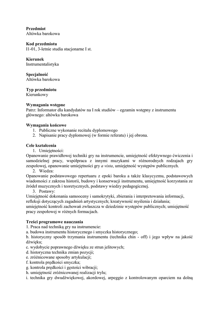 Przedmiot Altówka barokowa Kod przedmiotu I1-01, 3-letnie studia stacjonarne I st. Kierunek Instrumentalistyka Specjalność Altówka barokowa Typ przedmiotu Kierunkowy Wymagania wstępne Patrz: Informator dla kandydatów na I rok studiów – egzamin wstępny z instrumentu głównego: altówka barokowa Wymagania końcowe 1. Publiczne wykonanie recitalu dyplomowego 2. Napisanie pracy dyplomowej (w formie referatu) i jej obrona. Cele kształcenia 1. Umiejętności: Opanowanie prawidłowej techniki gry na instrumencie, umiejętność efektywnego ćwiczenia i samodzielnej pracy, współpraca z innymi muzykami w różnorodnych rodzajach gry zespołowej, opanowanie umiejętności gry a vista, umiejętność występów publicznych. 2. Wiedza: Opanowanie podstawowego repertuaru z epoki baroku a także klasycyzmu, podstawowych wiadomości z zakresu historii, budowy i konserwacji instrumentu, umiejętność korzystania ze źródeł muzycznych i teoretycznych, podstawy wiedzy pedagogicznej. 3. Postawy: Umiejętność dokonania samooceny i samokrytyki, zbierania i interpretowania informacji, refleksji dotyczących zagadnień artystycznych; kreatywność myślenia i działania; umiejętność kontroli zachowań zwłaszcza w dziedzinie występów publicznych; umiejętność pracy zespołowej w różnych formacjach. Treści programowe nauczania 1. Praca nad techniką gry na instrumencie: a. budowa instrumentu historycznego i smyczka historycznego; b. historyczny sposób trzymania instrumentu (technika chin - off) i jego wpływ na jakość dźwięku; c. wydobycie poprawnego dźwięku ze strun jelitowych; d. historyczna technika zmian pozycji; e. zróżnicowane sposoby artykulacji; f. kontrola prędkości smyczka; g. kontrola prędkości i gęstości wibracji; h. umiejętność zróżnicowanej realizacji trylu; i. technika gry dwudźwiękowej, akordowej, arpeggio z kontrolowanym oparciem na dolną bądź górną nutę; j. intonowanie w różnych wysokościach stroju i różnorodnych temperacjach. 2. Praca nad samodzielnym warsztatem artystycznym: a. metody efektywnego ćwiczenia; b. umiejętność samodzielnej pracy; c. technika czytania a vista; d. panowanie nad stresem w warunkach koncertowych; e. umiejętność publicznego koncertowania. 3. Interpretacja: a. umiejętność dostosowania właściwego języka muzycznego do danego utworu z uwzględnieniem szkoły narodowej, stylu, zdobnictwa, retoryki muzycznej, epoki powstania; b. indywidualizacja własnej wypowiedzi muzycznej z zachowaniem zasad obowiązujących w danej epoce; c. wyszukiwanie i ocena przydatności różnych wydań nutowych; d. kształtowanie motywów i fraz, kształtowanie formy utworów, poczucie i organizacja czasu w muzyce, prawidłowe kontrolowanie oddechu w czasie gry. 4. Opanowanie podstawowych wiadomości teoretycznych w zakresie historycznych praktyk wykonawczych: a. zdobnictwo (m.in. dyminucje wczesnobarokowe, zdobnictwo swobodne w wolnych częściach utworów, improwizowane kadencje); b. style narodowe; c. praktyczna umiejętność gry w starych kluczach; d. praktyczne odczytywanie starodruków i manuskryptów. 5. Podstawą pracy w kolejnych semestrach są pozycje repertuarowe i wymagania ilościowe oraz egzaminacyjne podane w programie studiów. W uzasadnionych wypadkach dopuszcza się odchylenia od tych wymagań. Zamierzone efekty kształcenia (uczenia się) Po ukończeniu I cyklu studiów studenci specjalności altówka barokowa powinni: W zakresie wiedzy: 1. Opanowanie podstawowego repertuaru z epoki baroku a także klasycyzmu, podstawowych wiadomości z zakresu historii, budowy i konserwacji instrumentu. (K_W02, K_W11) 2. Poznanie podstawowych elementów wyróżniających technikę i estetykę gry na altówce barokowej w stosunku do gry na tzw. altówce współczesnej. (K_W06) 3. Opanowanie umiejętności korzystania ze źródeł muzycznych i teoretycznych, opanowanie podstaw wiedzy pedagogicznej. (K_W04, K_W16) 4. Posiadanie odpowiedniego zasobu wiadomości źródłowych (historyczne traktaty i podręczniki) pozwalającego na zgodną ze stylistyką epoki i kręgu kulturowego interpretację danego utworu. (K_W05) 5. Posiadanie odpowiedniego zasobu wiadomości teoretycznych (harmonia, formy, itp.) pozwalającego na samodzielną analizę wykonywanego utworu. (K_W13) W zakresie umiejętności: 1. Opanowanie prawidłowej techniki gry na instrumencie i umiejętności efektywnego ćwiczenia i samodzielnej pracy (K_U10) 2. Współpraca z innymi muzykami w różnorodnych rodzajach gry zespołowej. (K_U07) 3. Opanowanie umiejętności gry a vista (K_U09) 4. Umiejętność występów publicznych. (K_U17) 5. Właściwie łączyć posiadaną wiedzę z praktyką wykonawczą.(K_U01) 6. Przedstawienie swoich wykonań (koncerty, egzaminy, itd.) w sposób odpowiadający wymogom profesjonalnym. (K_U18) 7. W adekwatny sposób w wypowiedziach ustnych i pisemnych uzasadnić wybory artystyczne. (K_U15) 8. Przygotować w odpowiednie sposób od strony merytorycznej i formalnej pracę licencjacką i jej obronę. (K_U15) W zakresie kompetencji społecznych: 1. We właściwy sposób włączyć w proces kształcenia sferę własnej emocjonalności, zarówno w zakresie pokonywania trudności podczas ćwiczenia/przyswajania wiedzy, umiejętności opanowania stresu koncertowego, jak i pozytywnych emocji towarzyszących wykonaniu danego utworu. (K_K11) 2. Wykształcić umiejętność konstruktywnej współpracy z innymi muzykami (akompaniator, zespół kameralny, orkiestra). (K_K07) 3. Umiejętność dokonania samooceny i samokrytyki, zbierania i interpretowania informacji, refleksji dotyczących zagadnień artystycznych; kreatywność myślenia i działania; umiejętność kontroli zachowań zwłaszcza w dziedzinie występów publicznych. (K_K04) Metody nauczania Zajęcia prowadzone są indywidualnie w wymiarze dwóch godzin tygodniowo, z możliwością obserwowania lekcji przez innych studentów. Metody pracy dostosowane do możliwości i umiejętno