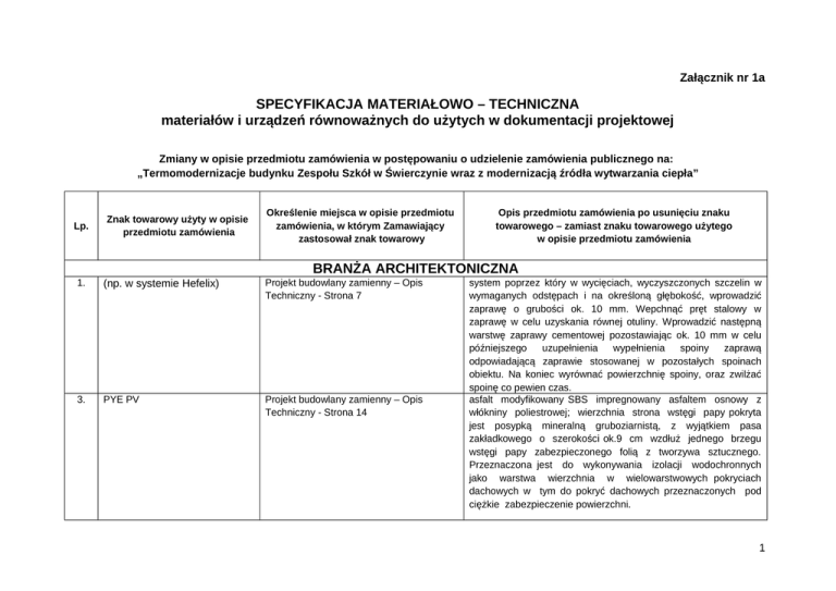 Załącznik nr 1a SPECYFIKACJA MATERIAŁOWO – TECHNICZNA materiałów i urządzeń równoważnych do użytych w dokumentacji projektowej Zmiany w opisie przedmiotu zamówienia w postępowaniu o udzielenie zamówienia publicznego na: „Termomodernizacje budynku Zespołu Szkół w Świerczynie wraz z modernizacją źródła wytwarzania ciepła” Lp. Znak towarowy użyty w opisie przedmiotu zamówienia Określenie miejsca w opisie przedmiotu zamówienia, w którym Zamawiający zastosował znak towarowy Opis przedmiotu zamówienia po usunięciu znaku towarowego – zamiast znaku towarowego użytego w opisie przedmiotu zamówienia BRANŻA ARCHITEKTONICZNA 1. (np. w systemie Hefelix) Projekt budowlany zamienny – Opis Techniczny - Strona 7 3. PYE PV Projekt budowlany zamienny – Opis Techniczny - Strona 14 system poprzez który w wycięciach, wyczyszczonych szczelin w wymaganych odstępach i na określoną głębokość, wprowadzić zaprawę o grubości ok. 10 mm. Wepchnąć pręt stalowy w zaprawę w celu uzyskania równej otuliny. Wprowadzić następną warstwę zaprawy cementowej pozostawiając ok. 10 mm w celu późniejszego uzupełnienia wypełnienia spoiny zaprawą odpowiadającą zaprawie stosowanej w pozostałych spoinach obiektu. Na koniec wyrównać powierzchnię spoiny, oraz zwilżać spoinę co pewien czas. asfalt modyfikowany SBS impregnowany asfaltem osnowy z włókniny poliestrowej; wierzchnia strona wstęgi papy pokryta jest posypką mineralną gruboziarnistą, z wyjątkiem pasa zakładkowego o szerokości ok.9 cm wzdłuż jednego brzegu wstęgi papy zabezpieczonego folią z tworzywa sztucznego. Przeznaczona jest do wykonywania izolacji wodochronnych jako warstwa wierzchnia w wielowarstwowych pokryciach dachowych w tym do pokryć dachowych przeznaczonych pod ciężkie zabezpieczenie powierzchni. 1 4. Unilift KP 250 A 1 Projekt budowlany zamienny – Rysunek A1 Rzut kondygnacji podziemnej – rysunek zamienny jednostopniowa pompa odwadniająca zatapialna z półotwartym wirnikiem do pompowania wody drenażowej i wody szarej (zabrudzonej, wolnej od fekaliów); zatapialna pompa odwadniająca ze stali nierdzewnej o mocnej konstrukcji, z króćcem tłocznym skierowanym w górę i umieszczonym na górze pompy, zewnętrzna osłona wykonana jest w całości jako jedna część, sieciowy kabel zasilający i kabel łącznika poziomu podłączone są do jednej, wulkanizowanej i wodoszczelnej wtyczki, która wtykana jest do gniazda na hermetycznie uszczelnionej obudowie stojana, silnik elektryczny to jedno- lub trójfazowy silnik asynchroniczny z mokrym wirnikiem, tzn. komora wirnika silnika wypełniona jest cieczą i łożyskami smarowanymi wodą, pompa z pływakowym łącznikiem poziomu (praca automatyczna); eksploatowana w pozycji pionowej stojącej, załączana i wyłączana za pomocą łącznika pływakowego, swobodna długość kabla: min. 70 mm i max. 150 mm. BRANŻA SANITARNA 1. HILTI, Projekt budowlany – Opis Techniczny Pkt. 3.0 Instalacja centralnego ogrzewania Pkt 3.2. Rury instalacji c.o. 3 x w tym punkcie system elementów do podwieszania przewodów instalacyjnych 2. Cosmo typ KV firmy V&H Projekt budowlany – Opis Techniczny Pkt. 3.3 Grzejniki i armatura 1 x w tym punkcie grzejnik płytowy 3. BIOLINE AQUA PROFESSIONAL Projekt budowlany – Opis Techniczny kocioł na pellet 2 Pkt 4.1. Wyposażenie 1 x w tym punkcie Projekt budowlany – Rysunek nr 6 Schemat technologiczny kotłowni 4. Reflex N200 Projekt budowlany – Opis Techniczny Pkt 4.1. Wyposażenie 1 x w tym punkcie przeponowe naczynie wzbiorcze o pojemności 200 Litrów Projekt budowlany – Opis Techniczny Pkt 4.3. Wyposażenie 1 x w tym punkcie Projekt budowlany – Rysunek nr 1 Rzut piwnicy – instalacja c.o. z technologią kotłowni Projekt budowlany – Rysunek nr 6 Schemat technologiczny kotłowni PRZEDMIAR – INST. SANIT. - strona nr 3 5. SYR 1915 1”/1/1/4” Projekt budowlany – Opis Techniczny Pkt 4.3. Wyposażenie 1 x w tym punkcie zawór bezpieczeństwa membranowy Projekt budowlany – Rysunek nr 6 Schemat technologiczny kotłowni 6. SYR 3065 Projekt budowlany – Opis Techniczny Pkt 4.3. Wyposażenie zabezpieczenie termiczne wypływu 3 1 x w tym punkcie Projekt budowlany – Rysunek nr 6 Schemat technologiczny kotłowni 7. Z POMPĄ ZATAPIALNĄ Unilift KP 250 A 1 Projekt budowlany – Rysunek nr 1 Rzut piwnicy – instalacja c.o. z technologią kotłowni pompa zatapialna o max przepływie: 3.11 l/s, obliczona wysokość podnoszenia pompy: 5.29 m, H max: 7.5 m 8. ESTYMA Projekt budowlany – Rysunek nr 6 Schemat technologiczny kotłowni regulator kotłowy 9. MAGNA 40-60 F Projekt budowlany – Rysunek nr 6 Schemat technologiczny kotłowni pompa obiegu kotła o przepływie obliczeniowym: 5.7 m3/h; obliczona wysokość podnoszenia pompy: 0.6 m; H max: 60 dm PRZEDMIAR – INST. SANIT. - strona nr 4 10. ALPHA2 32-40 Projekt budowlany – Rysunek nr 6 Schemat technologiczny kotłowni pompa obiegu sali o przepływie obliczeniowym: 0.94 m3/h; obliczona wysokość podnoszenia pompy: 1.93 m; H max: 40 dm; PRZEDMIAR – INST. SANIT. - strona nr 3 11. MAGNA 32-60 Projekt budowlany – Rysunek nr 6 Schemat technologiczny kotłowni pompa obiegu szkoły o przepływie obliczeniowym: 4.13 m3/h; obliczona wysokość podnoszenia pompy: 2.15 m; H max: 60 dm; PRZEDMIAR – INST. SANIT. - strona nr 4 12. ALPHA2 25-40 Projekt budowlany – Rysunek nr 6 Schemat technologiczny kotłowni PRZEDMIAR – INST. SANIT. - strona nr 3 13. MH65 MEIBES Projekt budowlany – Rysunek nr 6 Schemat technologiczny kotłowni pompa obiegowa przedszkola o przepływie obliczeniowym: 0.622 m3/h; obliczona wysokość podnoszenia pompy: 1.67 m; H max: 40 dm; wartownik o max przepływie 8 m3/h PRZEDMIAR – INST. SANIT. - strona nr 3 4 14. MGV65 MEIBES Projekt budowlany – Rysunek nr 6 Schemat technologiczny kotłowni rozdzielacz kołnierzowy o max przepływie 8 m3/h PRZEDMIAR – INST. SANIT. - strona nr 3 15. UPS 25-40 Projekt budowlany 
