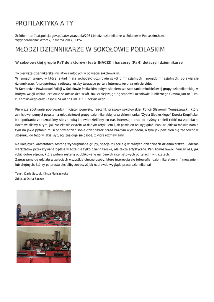 PROFILAKTYKA A TY Źródło: http://pat.policja.gov.pl/pat/wydarzenia/2061,Mlodzi-dziennikarze-w-Sokolowie-Podlaskim.html Wygenerowano: Wtorek, 7 marca 2017, 13:57 MŁODZI DZIENNIKARZE W SOKOŁOWIE PODLASKIM W sokołowskiej grupie PaT do aktorów (teatr INACZJ) i harcerzy (PaH) dołączyli dziennikarze To pierwsza dziennikarska inicjatywa młodych w powiecie sokołowskim. W ramach grupy, w której skład mają wchodzić uczniowie szkół gimnazjalnych i ponadgimnazjalnych, pojawią się dziennikarze, fotoreporterzy, radiowcy, osoby tworzące portale internetowe oraz relacje video. W Komendzie Powiatowej Policji w Sokołowie Podlaskim odbyło się pierwsze spotkanie młodzieżowej grupy dziennikarskiej, w którym wzięli udział uczniowie sokołowskich szkół. Najliczniejszą grupę stanowili uczniowie Publicznego Gimnazjum nr 1 im. P. Kamińskiego oraz Zespołu Szkół nr 1 im. K.K. Baczyńskiego. Pierwsze spotkanie poprowadził inicjator pomysłu, rzecznik prasowy sokołowskiej Policji Sławomir Tomaszewski, który zainicjował pomysł powstania młodzieżowej grupy dziennikarskiej oraz dziennikarka "Życia Siedleckiego" Dorota Krupińska. Na spotkaniu zapoznaliśmy się ze sobą i powiedzieliśmy co nas interesuje oraz co byśmy chcieli robić na zajęciach. Rozmawialiśmy o tym, jak zaciekawić czytelnika danym artykułem i jak powinien on wyglądać. Pani Krupińska mówiła nam o tym na jakie pytania musi odpowiedzieć sobie dziennikarz przed każdym wywiadem, o tym jak powinien się zachować w stosunku do tego w jakiej sytuacji znajduje się osoba, z którą rozmawiamy. Na kolejnych warsztatach zostaną wyodrębnione grupy, specjalizujące się w różnych dziedzinach dziennikarstwa. Podczas warsztatów przekazywana będzie wiedza nie tylko dziennikarska, ale także artystyczna. Pan Tomaszewski nauczy nas, jak robić dobre zdjęcia, które potem zostaną opublikowane na różnych internetowych portalach i w gazetach. Zapraszamy do udziału w zajęciach wszystkie chętne osoby, które interesują się fotografią, dziennikarstwem, filmowaniem lub chętnych, którzy po prostu chcieliby zobaczyć jak naprawdę wygląda praca dziennikarza! Tekst: Daria Saczuk, Kinga Maliszewska Zdjęcia: Daria Saczuk Ocena: 0/5 (0) Tweetnij