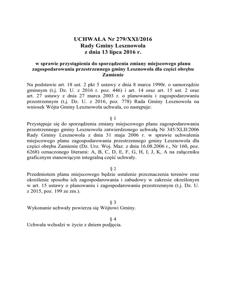 UCHWAŁA Nr 279/XXI/2016 Rady Gminy Lesznowola z dnia 13 lipca 2016 r. w sprawie przystąpienia do sporządzenia zmiany miejscowego planu zagospodarowania przestrzennego gminy Lesznowola dla części obrębu Zamienie Na podstawie art. 18 ust. 2 pkt 5 ustawy z dnia 8 marca 1990r. o samorządzie gminnym (t.j. Dz. U. z 2016 r. poz. 446) i art. 14 oraz art. 15 ust. 2 oraz art. 27 ustawy z dnia 27 marca 2003 r. o planowaniu i zagospodarowaniu przestrzennym (t.j. Dz. U. z 2016, poz. 778) Rada Gminy Lesznowola na wniosek Wójta Gminy Lesznowola uchwala, co następuje: §1 Przystępuje się do sporządzenia zmiany miejscowego planu zagospodarowania przestrzennego gminy Lesznowola zatwierdzonego uchwałą Nr 345/XLII/2006 Rady Gminy Lesznowola z dnia 31 maja 2006 r. w sprawie uchwalenia miejscowego planu zagospodarowania przestrzennego gminy Lesznowola dla części obrębu Zamienie (Dz. Urz. Woj. Maz. z dnia 16.08.2006 r., Nr 160, poz. 6268) oznaczonego literami: A, B, C, D, E, F, G, H, I, J, K, A na załączniku graficznym stanowiącym integralną część uchwały. §2 Przedmiotem planu miejscowego będzie ustalenie przeznaczenia terenów oraz określenie sposobu ich zagospodarowania i zabudowy w zakresie określonym w art. 15 ustawy o planowaniu i zagospodarowaniu przestrzennym (t.j. Dz. U. z 2015, poz. 199 ze zm.). §3 Wykonanie uchwały powierza się Wójtowi Gminy. §4 Uchwała wchodzi w życie z dniem podjęcia. UZASADNIENIE Uchwała Rady Gminy Lesznowola w sprawie przystąpienia do sporządzenia zmiany miejscowego planu zagospodarowania przestrzennego gminy Lesznowola zatwierdzonego uchwałą Nr 345/XLII/2006 Rady Gminy Lesznowola z dnia 31 maja 2006 r. w sprawie uchwalenia miejscowego planu zagospodarowania przestrzennego gminy Lesznowola dla części obrębu Zamienie (Dz. Urz. Woj. Maz. z dnia 16.08.2006 r., Nr 160, poz. 6268) wynika z potrzeby dostosowania ustaleń planu do aktualnych przepisów prawa.