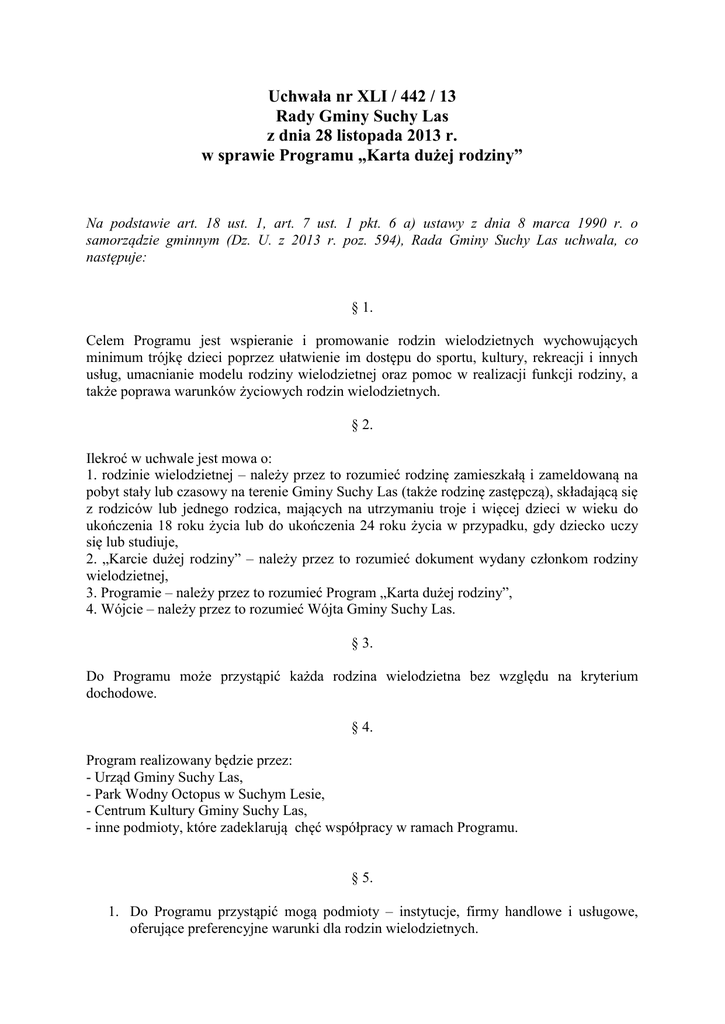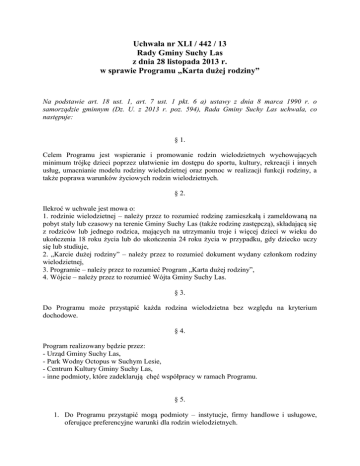 Uchwała nr XLI / 442 / 13 Rady Gminy Suchy Las z dnia 28 listopada 2013 r. w sprawie Programu „Karta dużej rodziny” Na podstawie art. 18 ust. 1, art. 7 ust. 1 pkt. 6 a) ustawy z dnia 8 marca 1990 r. o samorządzie gminnym (Dz. U. z 2013 r. poz. 594), Rada Gminy Suchy Las uchwala, co następuje: § 1. Celem Programu jest wspieranie i promowanie rodzin wielodzietnych wychowujących minimum trójkę dzieci poprzez ułatwienie im dostępu do sportu, kultury, rekreacji i innych usług, umacnianie modelu rodziny wielodzietnej oraz pomoc w realizacji funkcji rodziny, a także poprawa warunków życiowych rodzin wielodzietnych. § 2. Ilekroć w uchwale jest mowa o: 1. rodzinie wielodzietnej – należy przez to rozumieć rodzinę zamieszkałą i zameldowaną na pobyt stały lub czasowy na terenie Gminy Suchy Las (także rodzinę zastępczą), składającą się z rodziców lub jednego rodzica, mających na utrzymaniu troje i więcej dzieci w wieku do ukończenia 18 roku życia lub do ukończenia 24 roku życia w przypadku, gdy dziecko uczy się lub studiuje, 2. „Karcie dużej rodziny” – należy przez to rozumieć dokument wydany członkom rodziny wielodzietnej, 3. Programie – należy przez to rozumieć Program „Karta dużej rodziny”, 4. Wójcie – należy przez to rozumieć Wójta Gminy Suchy Las. § 3. Do Programu może przystąpić każda rodzina wielodzietna bez względu na kryterium dochodowe. § 4. Program realizowany będzie przez: - Urząd Gminy Suchy Las, - Park Wodny Octopus w Suchym Lesie, - Centrum Kultury Gminy Suchy Las, - inne podmioty, które zadeklarują chęć współpracy w ramach Programu. § 5. 1. Do Programu przystąpić mogą podmioty – instytucje, firmy handlowe i usługowe, oferujące preferencyjne warunki dla rodzin wielodzietnych. 2. Przystąpienie do Programu następuje na podstawie deklaracji złożonej przez zainteresowany podmiot i po podpisaniu stosownego porozumienia pomiędzy podmiotem, a Wójtem. 3. Wzór deklaracji i porozumienia określi Wójt. § 6. Wszystkie podmioty uczestniczące w Programie otrzymają jako fakt potwierdzenia uczestnictwa logo gminy Suchy Las, do zamieszczenia w witrynie sklepu lub przy wejściu do budynku. Lista podmiotów uczestniczących w programie będzie dostępna na stronach www.suchylas.pl , a także w Biuletynie Informacji Publicznej. § 7. Posiadanie „Karty dużej rodziny” uprawnia do: 1. korzystania z oferty zajęć Centrum Kultury Gminy Suchy Las z zastosowaniem zniżki - za jednostkowy bilet ogólny, 2. zakupu ze zniżką biletów jednorazowych do Parku Wodnego Octopus w Suchym Lesie, 3. zniżki w opłacie za udział w półkoloniach organizowanych przez Ośrodek Pomocy Społecznej, 4. korzystania z preferencyjnych warunków zaproponowanych przez inne podmioty, według zasad określonych przez te podmioty. § 8. 1. „Karta dużej rodziny” wydawana jest na podstawie złożonego wniosku przez rodzica (opiekuna prawnego) do Wójta Gminy. 2. Wnioski są przyjmowane przez cały rok kalendarzowy. 3. „Karta dużej rodziny” wydawana jest na czas określony. 4. Okres ważności karty ustala się w oparciu o postanowienia § 2 pkt. 1 niniejszej uchwały dotyczące składu rodziny, wieku dzieci oraz kontynuowania przez nie nauki. 5. Datę ważności karty ustala się na koniec miesiąca kalendarzowego, w którym ustaje jedna z przesłanek określonych w § 2 pkt. 1 niniejszej uchwały. 6. Ważność karty wymaga potwierdzenia raz na 12 miesięcy. 7. „Kartę dużej rodziny” otrzymuje każdy członek rodziny wielodzietnej. 8. Wzór wniosku, o którym mowa w ust. 1, wzór „Karty dużej rodziny”, oraz procedury jej wydawania określi Wójt. § 9. Środki niezbędne na realizację zadań zawartych w § 7 pkt. 1, 2, 3 zabezpiecza się w budżecie Gminy Suchy Las. § 10. Wykonanie uchwały powierza się Wójtowi Gminy Suchy Las. § 11. Uchwała wchodzi w życie z dniem podjęcia.