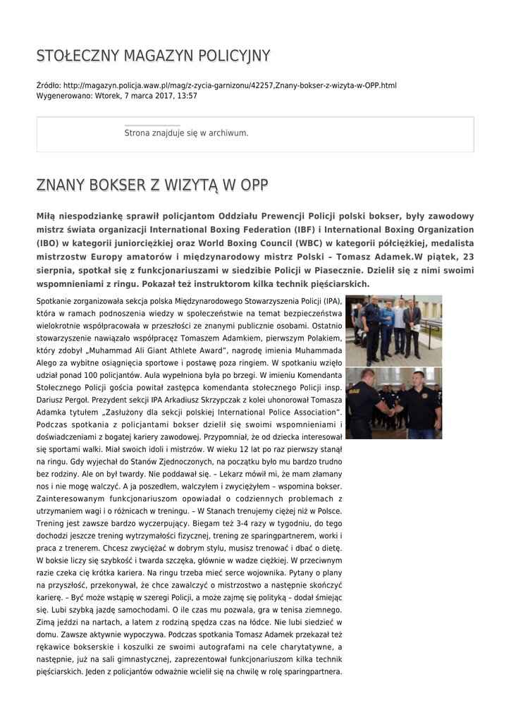 STOŁECZNY MAGAZYN POLICYJNY Źródło: http://magazyn.policja.waw.pl/mag/z-zycia-garnizonu/42257,Znany-bokser-z-wizyta-w-OPP.html Wygenerowano: Wtorek, 7 marca 2017, 13:57 Strona znajduje się w archiwum. ZNANY BOKSER Z WIZYTĄ W OPP Miłą niespodziankę sprawił policjantom Oddziału Prewencji Policji polski bokser, były zawodowy mistrz świata organizacji International Boxing Federation (IBF) i International Boxing Organization (IBO) w kategorii juniorciężkiej oraz World Boxing Council (WBC) w kategorii półciężkiej, medalista mistrzostw Europy amatorów i międzynarodowy mistrz Polski – Tomasz Adamek.W piątek, 23 sierpnia, spotkał się z funkcjonariuszami w siedzibie Policji w Piasecznie. Dzielił się z nimi swoimi wspomnieniami z ringu. Pokazał też instruktorom kilka technik pięściarskich. Spotkanie zorganizowała sekcja polska Międzynarodowego Stowarzyszenia Policji (IPA), która w ramach podnoszenia wiedzy w społeczeństwie na temat bezpieczeństwa wielokrotnie współpracowała w przeszłości ze znanymi publicznie osobami. Ostatnio stowarzyszenie nawiązało współpracęz Tomaszem Adamkiem, pierwszym Polakiem, który zdobył „Muhammad Ali Giant Athlete Award”, nagrodę imienia Muhammada Alego za wybitne osiągnięcia sportowe i postawę poza ringiem. W spotkaniu wzięło udział ponad 100 policjantów. Aula wypełniona była po brzegi. W imieniu Komendanta Stołecznego Policji gościa powitał zastępca komendanta stołecznego Policji insp. Dariusz Pergoł. Prezydent sekcji IPA Arkadiusz Skrzypczak z kolei uhonorował Tomasza Adamka tytułem „Zasłużony dla sekcji polskiej International Police Association”. Podczas spotkania z policjantami bokser dzielił się swoimi wspomnieniami i doświadczeniami z bogatej kariery zawodowej. Przypomniał, że od dziecka interesował się sportami walki. Miał swoich idoli i mistrzów. W wieku 12 lat po raz pierwszy stanął na ringu. Gdy wyjechał do Stanów Zjednoczonych, na początku było mu bardzo trudno bez rodziny. Ale on był twardy. Nie poddawał się. – Lekarz mówił mi, że mam złamany nos i nie mogę walczyć. A ja poszedłem, walczyłem i zwyciężyłem – wspomina bokser. Zainteresowanym funkcjonariuszom opowiadał o codziennych problemach z utrzymaniem wagi i o różnicach w treningu. – W Stanach trenujemy ciężej niż w Polsce. Trening jest zawsze bardzo wyczerpujący. Biegam też 3-4 razy w tygodniu, do tego dochodzi jeszcze trening wytrzymałości fizycznej, trening ze sparingpartnerem, worki i praca z trenerem. Chcesz zwyciężać w dobrym stylu, musisz trenować i dbać o dietę. W boksie liczy się szybkość i twarda szczęka, głównie w wadze ciężkiej. W przeciwnym razie czeka cię krótka kariera. Na ringu trzeba mieć serce wojownika. Pytany o plany na przyszłość, przekonywał, że chce zawalczyć o mistrzostwo a następnie skończyć karierę. – Być może wstąpię w szeregi Policji, a może zajmę się polityką – dodał śmiejąc się. Lubi szybką jazdę samochodami. O ile czas mu pozwala, gra w tenisa ziemnego. Zimą jeździ na nartach, a latem z rodziną spędza czas na łódce. Nie lubi siedzieć w domu. Zawsze aktywnie wypoczywa. Podczas spotkania Tomasz Adamek przekazał też rękawice bokserskie i koszulki ze swoimi autografami na cele charytatywne, a następnie, już na sali gimnastycznej, zaprezentował funkcjonariuszom kilka technik pięściarskich. Jeden z policjantów odważnie wcielił się na chwilę w rolę sparingpartnera. Nie obyło się bez licznych zdjęć ze światowej sławy bokserem oraz autografów. Kilkugodzinne spotkanie z Tomaszem Adamkiem w Oddziale Prewencji Policji zakończyło uroczyste przekazanie pary rękawic bokserskich z autografem Tomasza Adamka na ręce Komendanta Stołecznego Policji nadinsp. Dariusza Działo. W godzinach popołudniowych mistrz spotkał się z Komendantem Głównym Policji nadinspektorem Markiem Działoszyńskim, któremu również przekazał parę rękawic bokserskich ze swoim autografem. kom. Anna Kędzierzawska foto Krzysztof Chwała ZAŁĄCZNIKI DO STRONY Stołeczny Magazyn Policyjny - nr 09/2013 3.31 MB Ocena: 0/5 (0) Tweetnij
