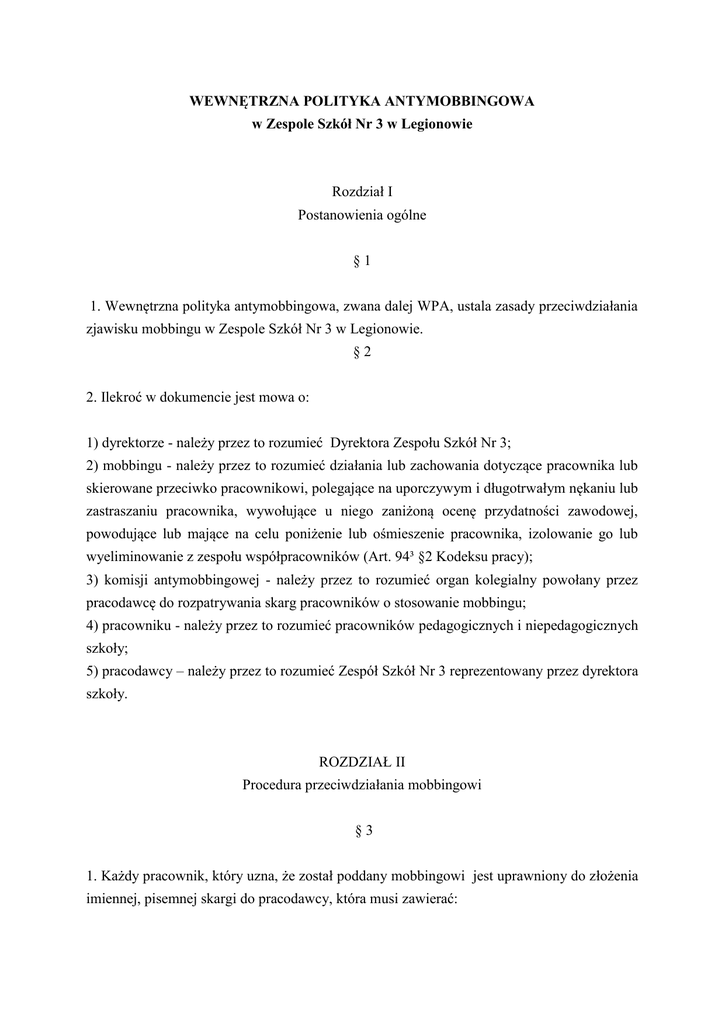 WEWNĘTRZNA POLITYKA ANTYMOBBINGOWA w Zespole Szkół Nr 3 w Legionowie Rozdział I Postanowienia ogólne §1 1. Wewnętrzna polityka antymobbingowa, zwana dalej WPA, ustala zasady przeciwdziałania zjawisku mobbingu w Zespole Szkół Nr 3 w Legionowie. §2 2. Ilekroć w dokumencie jest mowa o: 1) dyrektorze - należy przez to rozumieć Dyrektora Zespołu Szkół Nr 3; 2) mobbingu - należy przez to rozumieć działania lub zachowania dotyczące pracownika lub skierowane przeciwko pracownikowi, polegające na uporczywym i długotrwałym nękaniu lub zastraszaniu pracownika, wywołujące u niego zaniżoną ocenę przydatności zawodowej, powodujące lub mające na celu poniżenie lub ośmieszenie pracownika, izolowanie go lub wyeliminowanie z zespołu współpracowników (Art. 94³ §2 Kodeksu pracy); 3) komisji antymobbingowej - należy przez to rozumieć organ kolegialny powołany przez pracodawcę do rozpatrywania skarg pracowników o stosowanie mobbingu; 4) pracowniku - należy przez to rozumieć pracowników pedagogicznych i niepedagogicznych szkoły; 5) pracodawcy – należy przez to rozumieć Zespół Szkół Nr 3 reprezentowany przez dyrektora szkoły. ROZDZIAŁ II Procedura przeciwdziałania mobbingowi §3 1. Każdy pracownik, który uzna, że został poddany mobbingowi jest uprawniony do złożenia imiennej, pisemnej skargi do pracodawcy, która musi zawierać: 1) określenie z imienia i nazwiska sprawcy (sprawców); 2) przedstawienie stanu faktycznego oraz konkretnych dowodów na poparcie przytoczonych okoliczności (data, miejsce, świadkowie zdarzenia, itp.); 3) określenie częstotliwości zdarzeń; 4) opis wszelkich dodatkowych form i aspektów działań będących przedmiotem skargi; 5) przedstawienie indywidualnych skutków, psychicznych, zdrowotnych i innych opisywanych zdarzeń; 6) własnoręczny podpis poszkodowanego oraz datę. 2. Przed złożeniem skargi pracownik może starać się samodzielnie wyjaśnić wszelkie okoliczności i dążyć do polubownego rozwiązania sporu. §4 1. Do rozpatrzenia skargi pracownika pracodawca w terminie 5 dni od daty jej wpłynięcia, zarządzeniem powołuje Komisję ds. Przeciwdziałania Mobbingowi, zwaną dalej komisją, w skład której wchodzą: 1) pracownik wskazany przez osobę mobbingowaną spośród pracowników szkoły; 2) przedstawiciel zakładowej organizacji związkowej ZNP; 3) dyrektor lub przedstawiciel Rady Pedagogicznej wskazany przez Dyrektora szkoły 2. Pracami komisji kieruje Przewodniczący, wybrany na pierwszym posiedzeniu Komisji, zwykłą większością głosów. 3. Celem prac Komisji jest rozpatrywanie skarg pracowników na mobbing oraz rzetelne prowadzenie postępowań wyjaśniających. 4. Komisja w swoich działaniach kieruje się obiektywizmem i bezstronnością wobec stron oraz dąży do jak najszybszego wyjaśnienia zgłoszonych skarg. Komisja rozpatruje skargę z zachowaniem zasad bezstronności i poufności. 5. Komisja jest upoważniona do: a) przeglądania dokumentów niezbędnych do wyjaśnienia sprawy; b) wysłuchania skarżącego i oskarżonego o mobbing; c) wysłuchania osób wskazanych przez strony postępowania jako świadków zdarzeń; d) przeprowadzenia innych działań, które miałyby istotne znaczenie w postępowaniu wyjaśniającym. 6. Komisja rozpoczyna postępowanie w ciągu 14 dni roboczych od dnia złożenia skargi. 7. Komisja prowadzi postępowanie przy udziale pracowników, o których mowa w § 4 ust. 1. 8. Komisja obraduje w pełnym składzie. 9. Członkowie Komisji są zobowiązani do zachowania w tajemnicy informacji zdobytych w trakcie lub w związku z rozpatrywaną skargą. 10. Członkowie Komisji winni być zaznajomieni z problematyką mobbingu, a także z przepisami dotyczącymi ochrony danych osobowych i procedur dotyczących ochrony danych osobowych. 11. Po wysłuchaniu wyjaśnień stron konfliktu oraz przeprowadzeniu postępowania dowodowego komisja podejmuje decyzję zwykłą większością głosów, co do zasadności rozpatrywania skargi. 12. Z posiedzenia Komisji sporządzany jest protokół, który powinien zawierać wnioski dotyczące prowadzonego postępowania oraz ewentualne propozycje odnośnie sposobów zakończenia konfliktu. Protokół podpisują wszyscy członkowie komisji. 13. Komisja przedstawia protokół pracodawcy w ciągu 7 dni roboczych od zakończenia postępowania wyjaśniającego. 14. Przewodniczący komisji albo wyznaczona przez niego osoba informuje w formie pisemnej wraz z uzasadnieniem pracownika, który złożył skargę, mobbingowanego oraz pracownika, któremu zarzuca się stosowanie mobbingu, o podjętym przez komisję rozstrzygnięciu, w terminie 4 dni roboczych od dnia jego podjęcia. 15. Dokumenty powstałe w wyniku postępowania Komisji przewodniczący przekazuje do kadr, gdzie są przechowywane w założonym segregatorze „Mobbing w szkole”. 16. Protokoły z posiedzeń Komisji (w tym kserokopie) oraz inne dokumenty są udostępniane tylko za zgodą przewodniczącego Komisji. 17. Wyłączenie członka ze składu Komisji może nastąpić na wniosek uczestnika postępowania, jeżeli zachodzą okoliczności mogące mieć wpływ na jego bezstronność. 18. Uczestnik postępowania składa wniosek do dyrektora o wyłączenie członka ze składu komisji w terminie 7 dni od daty ogłoszenia zarządzenia. Jeżeli dyrektor jest obwinionym lub składającym skargę, wniosek składa się do przewodniczącego Komisji. §5 1. Postępowanie prowadzone przez Komisję nie zamyka, każdej ze stron konfliktu, możliwości skierowania sprawy na drogę postępowania sądowego. 2. W razie uznania skargi za zasadną wobec obwinionego, pracodawca może zastosować upomnienie lub naganę oraz zmienić stosunek pracy w sposób przewidziany w kodeksie pracy. 3. W przypadku, gdy oskarżonym jest dyrektor szkoły, w razie uznania skargi za zasadną, komisja powiadamia organ prowadzący o treści postępowania. ROZDZIAŁ III Postanowienia końcowe §6 1. Pracodawca w 