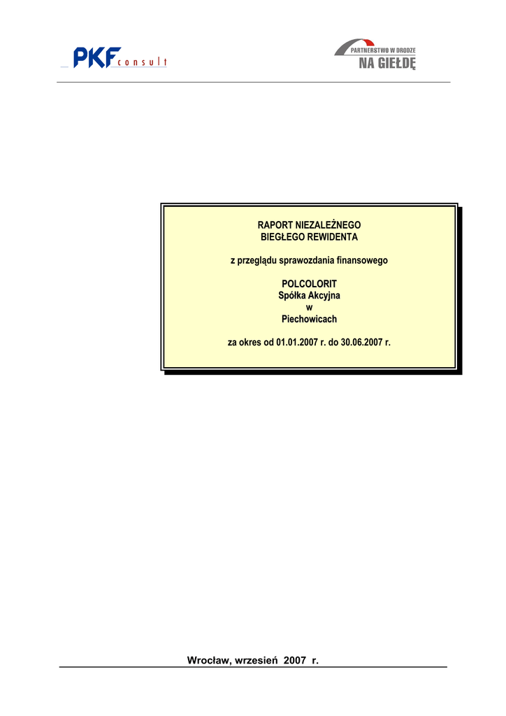 RAPORT NIEZALEŻNEGO BIEGŁEGO REWIDENTA z przeglądu sprawozdania finansowego POLCOLORIT Spółka Akcyjna w Piechowicach za okres od 01.01.2007 r. do 30.06.2007 r. Wrocław, wrzesień 2007 r. POLCOLORIT Spółka Akcyjna RAPORT NIEZALEŻNEGO BIEGŁEGO REWIDENTA dla Walnego Zgromadzenia, Rady Nadzorczej i Zarządu POLCOLORIT Spółka Akcyjna z przeglądu sprawozdania finansowego obejmującego okres od 01.01.2007 r. do 30.06.2007 r. Dokonaliśmy przeglądu załączonego sprawozdania finansowego POLCOLORIT Spółka Akcyjna, z siedzibą w Piechowicach, na które składa się: wprowadzenie do sprawozdania finansowego, bilans sporządzony na dzień 30.06.2007 r., który po stronie aktywów i pasywów wykazuje sumę: 203 229 tys. zł, rachunek zysków i strat za okres od 01.01.2007 r. do 30.06.2007r. wykazujący stratę netto w wysokości: 1 306 tys. zł, zestawienie zmian w kapitale (funduszu) własnym za okres do 30.06.2007r. wykazujące zmniejszenie kapitału własnego o kwotę: od 01.01.2007r. 1 306 tys. zł, rachunek przepływów pieniężnych za okres od 01.01.2007r. do 30.06.2007r. wykazujący zmniejszenie stanu środków pieniężnych o kwotę: 1 505 tys. zł, dodatkowe informacje i objaśnienia. Za sporządzenie tego sprawozdania odpowiada kierownik jednostki. Naszym zadaniem było dokonanie przeglądu tego sprawozdania. Przegląd przeprowadziliśmy stosownie do przepisów ustawy o rachunkowości oraz norm wykonywania zawodu biegłego rewidenta, wydanych przez Krajową Radę Biegłych Rewidentów. Podmiot wpisany na listę podmiotów uprawnionych do badania sprawozdań finansowych pod numerem 477 Sąd Rejonowy dla m.st. Warszawy XIX Wydział Gospodarczy-Krajowego Rejestru Sądowego Numer KRS 0000034774 2 POLCOLORIT Spółka Akcyjna Normy nakładają na nas obowiązek zaplanowania i przeprowadzenia przeglądu w taki sposób, aby uzyskać umiarkowaną pewność, że sprawozdanie finansowe nie zawiera istotnych nieprawidłowości. Przeglądu dokonaliśmy głównie drogą analizy sprawozdania finansowego, wglądu w księgi rachunkowe oraz wykorzystania informacji uzyskanych od kierownictwa oraz osób odpowiedzialnych za finanse i księgowość Spółki. Zakres i metoda przeglądu sprawozdania finansowego istotnie różni się od badań leżących u podstaw opinii wyrażanej o rzetelności, prawidłowości i jasności rocznego sprawozdania finansowego, dlatego nie możemy wydać takiej opinii o załączonym sprawozdaniu. Dokonany przez nas przegląd nie ujawnił niczego, co wskazywałoby na istotne zniekształcenie obrazu sytuacji majątkowej i finansowej jednostki na dzień 30.06.2007 r. oraz jej wyniku finansowego za okres od 01.01.2007 r. do 30.06.2007r., przekazywanego przez załączone sprawozdanie finansowe, sporządzone zgodnie z Międzynarodowymi Standardami Rachunkowości, Międzynarodowymi Standardami Sprawozdawczości Finansowej oraz związanymi z nimi interpretacjami ogłoszonymi w formie rozporządzeń wykonawczych Komisji Europejskiej, jak również wymogami określonymi w Rozporządzeniu Ministra Finansów z dnia 19 października 2005 r. w sprawie informacji bieżących i okresowych przekazywanych przez emitentów papierów wartościowych (Dz. U. z 2005 r., nr 209, poz. 1744). Elżbieta Kuchciak PKF Consult Sp. z o.o. Podmiot uprawniony do badania nr 477 Warszawa, ul. Elbląska 15/17 Rafał Barycki ........................................................... Biegły rewident nr 7056/5916 ........................................................... Członek Zarządu Biegły rewident nr 10 744/7805 reprezentujący podmiot uprawniony do badania sprawozdań finansowych Wrocław, 24 wrzesień 2007 r. Podmiot wpisany na listę podmiotów uprawnionych do badania sprawozdań finansowych pod numerem 477 Sąd Rejonowy dla m.st. Warszawy XIX Wydział Gospodarczy-Krajowego Rejestru Sądowego Numer KRS 0000034774 3