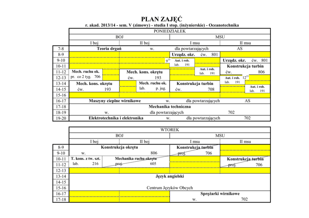 PLAN ZAJĘĆ 7-8 8-9 9-10 10-11 11-12 12-13 13-14 14-15 15-16 16-17 17-18 18-19 19-20 r. akad. 2013/14 - sem. V (zimowy) - studia I stop. (inżynierskie) - Oceanotechnika PONIEDZIAŁEK BOJ MSU I boj II boj I msu II msu Teoria drgań w. dla powtarzających AS Urządz. okr. ćw. 801 15 Aut. i rob. Urządz. okr. ćw. 801 9 lab. 191 Konstrukcja turbin Aut. i rob. Mech. ruchu ok. ćw. 806 Mech. kons. okrętu lab. 191 15 pr. co 2 tyg. 706 12 Aut. i rob. ćw. 193 lab. 191 Mech. ruchu ok. Mech. kons. okrętu Konstrukcja turbin Aut. i rob. lab. p. jug. ćw. 193 ćw. 708 lab. 191 Maszyny cieplne wirnikowe w. Elektrotechnika i elektronika w. dla powtarzających Mechanika techniczna dla powtarzających w. dla powtarzających AS 702 702 WTOREK BOJ I boj 8-9 9-10 10-11 11-12 12-13 13-14 14-15 15-16 16-17 17-18 MSU II boj Konstrukcja okrętu w. T. kons. z tw. szt. lab. 216 806 I msu Konstrukcja turbin proj. 706 Mechanika ruchu okrętu proj. 605 II msu Konstrukcja turbin proj. 706 Język angielski Centrum Języków Obcych Sprężarki wirnikowe w. 702 V oce ŚRODA BOJ 8-9 9-10 10-11 11-12 12-13 13-14 14-15 15-16 16-17 MSU I boj II boj Technol. budowy i remontu okrętów w. 702 Technol. konstr. z tworzyw szt. w. 702 Mechanika konstrukcji okrętu w. 701 Mech. kons. okr. 902 lab. lab. 180 Kontr. jakości I msu II msu Siłownie okrętowe w. 806 Siłownie okr. ćw. 708 Kotły i wym. c. ćw. 193 Kotły i wym. c. ćw. 193 Siłownie okr. ćw. 708 Kotły i wymienniki ciepła w. 702 Urządzenia okrętowe M.kons.ok. L. 180 902 L. Kontr. jak. w. 416 CZWARTEK BOJ 8-9 9-10 10-11 11-12 12-13 13-14 14-15 15-16 I boj Mechanika ruchu okrętu I Kontrola jakości Pr. konstr. okr. proj. 206 MSU II boj w. w. 409 409 T. kon. z tw. szt. lab. 216 Pr. konstr. okr. proj. 206 I msu II msu Podstawy hydrauliki siłowej w. 410 P. hydr. sił. ćw. 801 T. bud. i rem. ok. proj. 25 Wychowanie fizyczne Centrum Sportu Akademickiego P. hydr. sił. ćw. 801 V oce PIĄTEK BOJ I boj 7-8 8-9 9-10 10-11 11-12 12-13 13-14 14-15 15-16 16-17 Proj. okr. i jachtów proj. 501.b Mech. ruchu ok. lab. p. jug. T. bud. i rem. ok. proj. 25 MSU II boj Proj. okr. i jachtów proj. 501.a Mech. ruchu ok. lab. p. jug. T. bud. i rem. ok. proj. 25 T. kon. z tw. szt. lab. 216 Proj. konstr. okr. proj. 193 Proj. okr. i jachtów proj. 501.a I msu II msu Pompy i spręż. ćw. 193 w. w. Pompy i spręż. ćw. 193 Pompy i sprężarki 806 Konstrukcja turbin 806