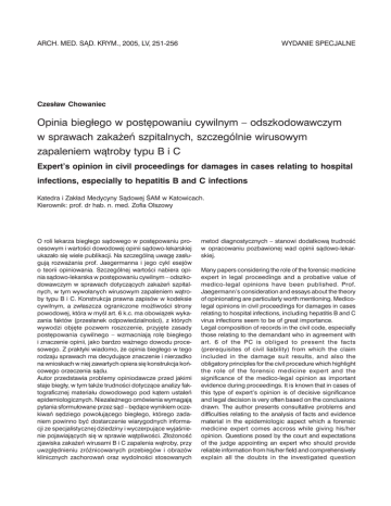 ARCH. MED. SĄD. KRYM., 2005, LV, 251-256 WYDANIE SPECJALNE Czesław Chowaniec Opinia biegłego w postępowaniu cywilnym – odszkodowawczym w sprawach zakażeń szpitalnych, szczególnie wirusowym zapaleniem wątroby typu B i C Expert’s opinion in civil proceedings for damages in cases relating to hospital infections, especially to hepatitis B and C infections Katedra i Zakład Medycyny Sądowej ŚAM w Katowicach. Kierownik: prof. dr hab. n. med. Zofia Olszowy O roli lekarza biegłego sądowego w postępowaniu procesowym i wartości dowodowej opinii sądowo-lekarskiej ukazało się wiele publikacji. Na szczególną uwagę zasługują rozważania prof. Jaegermanna i jego cykl esejów o teorii opiniowania. Szczególnej wartości nabiera opinia sądowo-lekarska w postępowaniu cywilnym – odszkodowawczym w sprawach dotyczących zakażeń szpitalnych, w tym wywołanych wirusowym zapaleniem wątroby typu B i C. Konstrukcja prawna zapisów w kodeksie cywilnym, a zwłaszcza ograniczone możliwości strony powodowej, która w myśl art. 6 k.c. ma obowiązek wykazania faktów (przesłanek odpowiedzialności), z których wywodzi objęte pozwem roszczenie, przyjęte zasady postępowania cywilnego – wzmacniają rolę biegłego i znaczenie opinii, jako bardzo ważnego dowodu procesowego. Z praktyki wiadomo, że opinia biegłego w tego rodzaju sprawach ma decydujące znaczenie i nierzadko na wnioskach w niej zawartych opiera się konstrukcja końcowego orzeczenia sądu. Autor przedstawia problemy opiniodawcze przed jakimi staje biegły, w tym także trudności dotyczące analizy faktograficznej materiału dowodowego pod kątem ustaleń epidemiologicznych. Niezależnego omówienia wymagają pytania sformułowane przez sąd – będące wynikiem oczekiwań sędziego powołującego biegłego, którego zadaniem powinno być dostarczenie wiarygodnych informacji ze specjalistycznej dziedziny i wyczerpujące wyjaśnienie pojawiających się w sprawie wątpliwości. Złożoność zjawiska zakażeń wirusami B i C zapalenia wątroby, przy uwzględnieniu zróżnicowanych przebiegów i obrazów klinicznych zachorowań oraz wydolności stosowanych metod diagnostycznych – stanowi dodatkową trudność w opracowaniu pozbawionej wad opinii sądowo-lekarskiej. Many papers considering the role of the forensic medicine expert in legal proceedings and a probative value of medico-legal opinions have been published. Prof. Jaegermann’s consideration and essays about the theory of opinionating are particularly worth mentioning. Medicolegal opinions in civil proceedings for damages in cases relating to hospital infections, including hepatitis B and C virus infections seem to be of great importance. Legal composition of records in the civil code, especially those relating to the demandant who in agreement with art. 6 of the PC is obliged to present the facts (prerequisites of civil liability) from which the claim included in the damage suit results, and also the obligatory principles for the civil procedure which highlight the role of the forensic medicine expert and the significance of the medico-legal opinion as important evidence during proceedings. It is known that in cases of this type of expert’s opinion is of decisive significance and legal decision is very often based on the conclusions drawn. The author presents consultative problems and difficulties relating to the analysis of facts and evidence material in the epidemiologic aspect which a forensic medicine expert comes accross while giving his/her opinion. Questions posed by the court and expectations of the judge appointing an expert who should provide reliable information from his/her field and comprehensively explain all the doubts in the investigated question 252 Czesław Chowaniec are suggested to be discussed independently. The complicated character of infections with hepatitis B and C viruses, especially their various courses and clinical pictures as well as the efficiency of all the diagnostic methods used make the provision of a medico-legal opinion more difficult. Słowa kluczowe: opinia sądowo-lekarska, zakażenia szpitalne, wirusowe zapalenie wątroby Key words: medico-legal opinion, hospital infection, viral hepatitis W monografii „opiniowanie sądowo-lekarskie – eseje o teorii” prof. Jaegermann wyraził pogląd, że korzystanie z biegłego wymaga teoretycznej lub względnie jasnej wiedzy o wzajemnej relacji sędziego i biegłego [4]. Wiedza ta odgrywa istotną rolę w ocenie użyteczności tzw. dowodu z biegłego [12]. Powyższa myśl może stanowić motyw rozważań na temat roli biegłego i wartości opinii sądowo-lekarskiej w sprawach cywilnych – odszkodowawczych z tytułu roszczeń związanych z zakażeniami szpitalnymi, w tym wywołanymi wirusami B i C zapalenia wątroby. Z praktyki opiniodawczej Zakładu Medycyny Sądowej ŚAM wynika, że opinia biegłego w tego rodzaju sprawach stanowi bardzo ważny, jeśli nie decydujący dowód stanowiący podstawę orzeczenia sądu. Zakłady opieki zdrowotnej ponoszą odpowiedzialność z art. 420 k.c. w zw. z art. 417 k.c. wówczas, gdy spełnione są wszelkie przesłanki tej odpowiedzialności: – wyrządzenie szkody przez funkcjonariusza państwowego, – zawinione działanie lub zaniechanie funkcjonariusza, – normalny związek przyczynowy pomiędzy tym działaniem lub zaniechaniem a wyrządzoną szkodą, – wyrządzenie szkody przy wykonywaniu powierzonej funkcjonariuszowi czynności. Przyczynami odpowiedzialności, jak wyżej podano jest szkoda, wina lekarza lub personelu pomocniczego oraz związek przyczynowy. W procesach dotyczących roszczeń z tytułu zakażeń szpitalnych zazwyczaj trudno jest ustalić, który z lekarzy leczących pacjenta lub kto z personelu pomocniczego dopuścił się winy, a dowiedzione zostało, że popełniono zaniedbanie. Zachodzi wówczas tzw. wina bezimienna [3, 5, 6, 10]. Istotnymi czynnikami wpływającymi bezpośrednio na stopień ryzyka zakaż