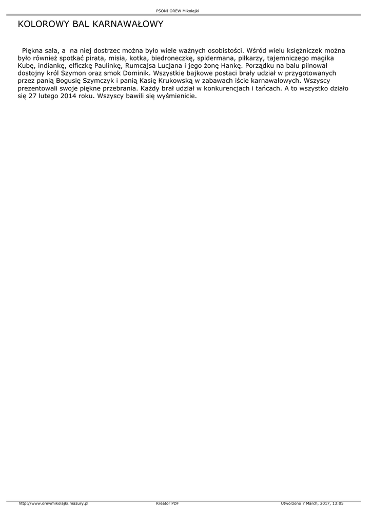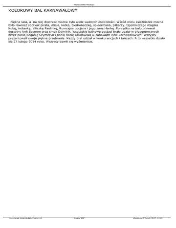 PSONI OREW Mikołajki KOLOROWY BAL KARNAWAŁOWY Piękna sala, a na niej dostrzec można było wiele ważnych osobistości. Wśród wielu księżniczek można było również spotkać pirata, misia, kotka, biedroneczkę, spidermana, piłkarzy, tajemniczego magika Kubę, indiankę, elficzkę Paulinkę, Rumcajsa Lucjana i jego żonę Hankę. Porządku na balu pilnował dostojny król Szymon oraz smok Dominik. Wszystkie bajkowe postaci brały udział w przygotowanych przez panią Bogusię Szymczyk i panią Kasię Krukowską w zabawach iście karnawałowych. Wszyscy prezentowali swoje piękne przebrania. Każdy brał udział w konkurencjach i tańcach. A to wszystko działo się 27 lutego 2014 roku. Wszyscy bawili się wyśmienicie. http://www.orewmikolajki.mazury.pl Kreator PDF Utworzono 7 March, 2017, 13:05