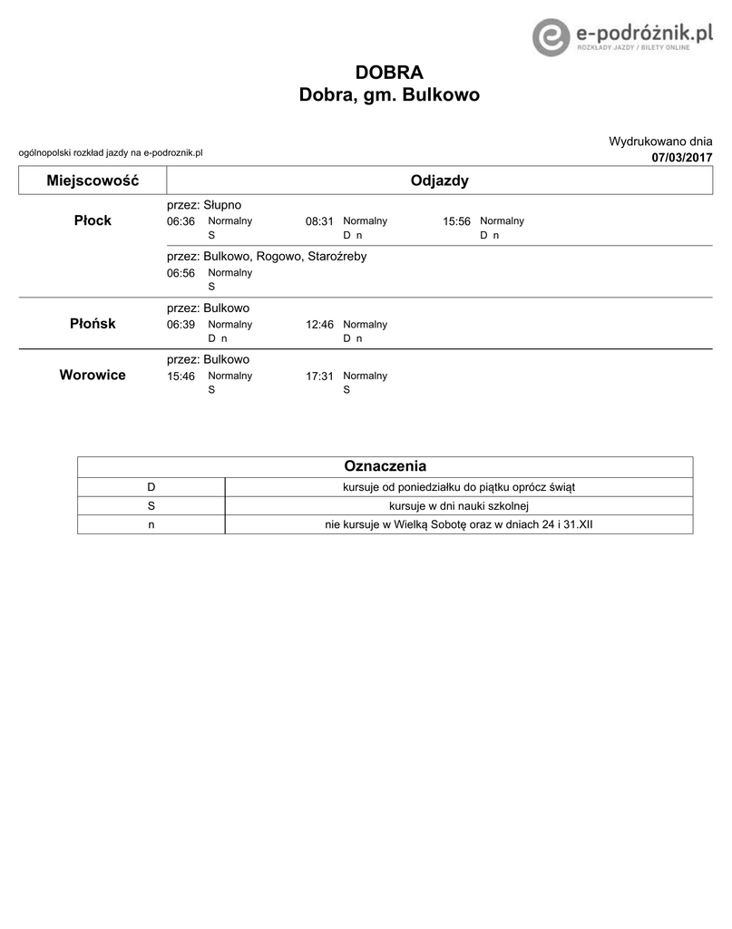 DOBRA Dobra, gm. Bulkowo Wydrukowano dnia 07/03/2017 ogólnopolski rozkład jazdy na e-podroznik.pl Miejscowość Odjazdy przez: Słupno Płock 06:36 Normalny S 08:31 Normalny 15:56 Normalny D n D n przez: Bulkowo, Rogowo, Staroźreby 06:56 Normalny S przez: Bulkowo Płońsk 06:39 Normalny D n 12:46 Normalny D n przez: Bulkowo Worowice 15:46 Normalny S 17:31 Normalny S Oznaczenia D kursuje od poniedziałku do piątku oprócz świąt S kursuje w dni nauki szkolnej n nie kursuje w Wielką Sobotę oraz w dniach 24 i 31.XII