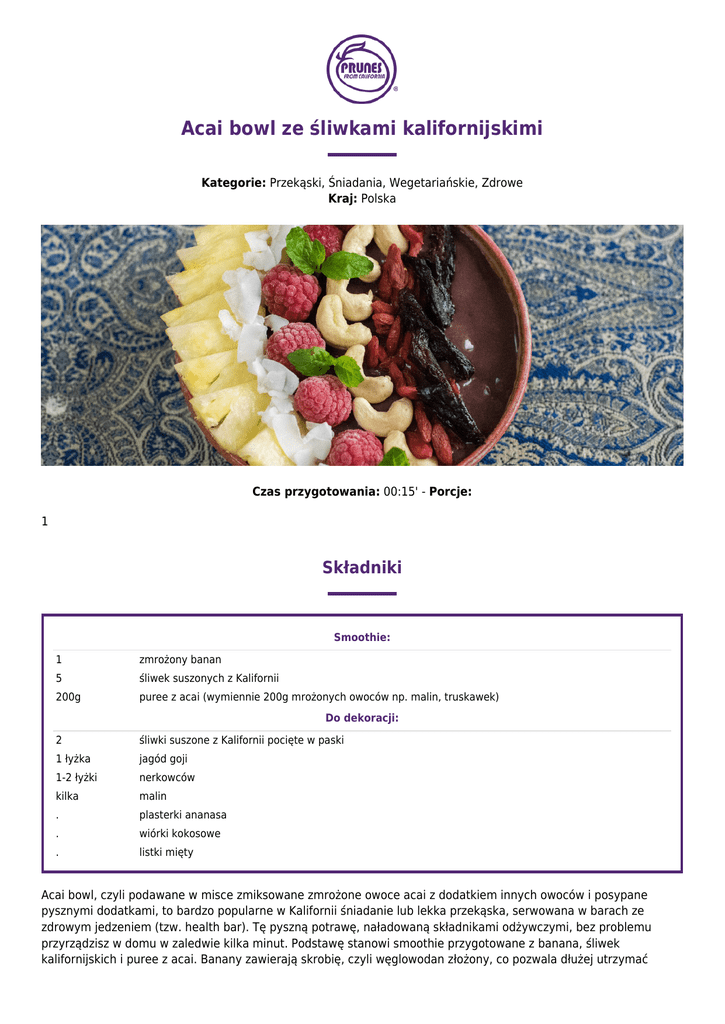 Acai bowl ze ś liwkami kalifornijskimi Kategorie: Przekąski, Śniadania, Wegetariańskie, Zdrowe Kraj: Polska Czas przygotowania: 00:15' - Porcje: 1 Składniki Smoothie: 1 zmrożony banan 5 śliwek suszonych z Kalifornii 200g puree z acai (wymiennie 200g mrożonych owoców np. malin, truskawek) Do dekoracji: 2 śliwki suszone z Kalifornii pocięte w paski 1 łyżka jagód goji 1-2 łyżki nerkowców kilka malin . plasterki ananasa . wiórki kokosowe . listki mięty Acai bowl, czyli podawane w misce zmiksowane zmrożone owoce acai z dodatkiem innych owoców i posypane pysznymi dodatkami, to bardzo popularne w Kalifornii śniadanie lub lekka przekąska, serwowana w barach ze zdrowym jedzeniem (tzw. health bar). Tę pyszną potrawę, naładowaną składnikami odżywczymi, bez problemu przyrządzisz w domu w zaledwie kilka minut. Podstawę stanowi smoothie przygotowane z banana, śliwek kalifornijskich i puree z acai. Banany zawierają skrobię, czyli węglowodan złożony, co pozwala dłużej utrzymać stabilny poziom glukozy we krwi. Suszone śliwki są źródłem witaminy B6, która wspiera pracę układu odpornościowego i witaminy K, która wspiera utrzymanie zdrowych kości. Prawdziwa zabawa w przyrządzaniu acai bowl zaczyna się w dekorowaniu. Wybierz dodatki, które najbardziej lubisz lub skorzystaj z naszej propozycji. Naturalną słodycz zapewnią dojrzewające w kalifornijskim słońcu suszone śliwki. Jagody goji stanowią dobre źródło białka, sprzyjającego rozwojowi masy mięśniowej. A orzechy nerkowca są źródłem potrzebnego w diecie magnezu i żelaza. Całość smakuje wyśmienicie i doda Ci mnóstwo pozytywnej, wiosennej energii! Przygotowanie Śliwki kalifornijskie do smoothie zalać wrzątkiem i odstawić na 5 minut. Do blendera wrzucić mrożonego banana, przelane wrzątkiem śliwki, puree z acai, zmiksować na jednolitą masę, przełożyć do miseczki. Na puree ułożyć: plasterki ananasa, wiórki kokosowe, paski śliwek kalifornijskich, maliny, nerkowce, jagody goji i płatki mięty. Podawać od razu.