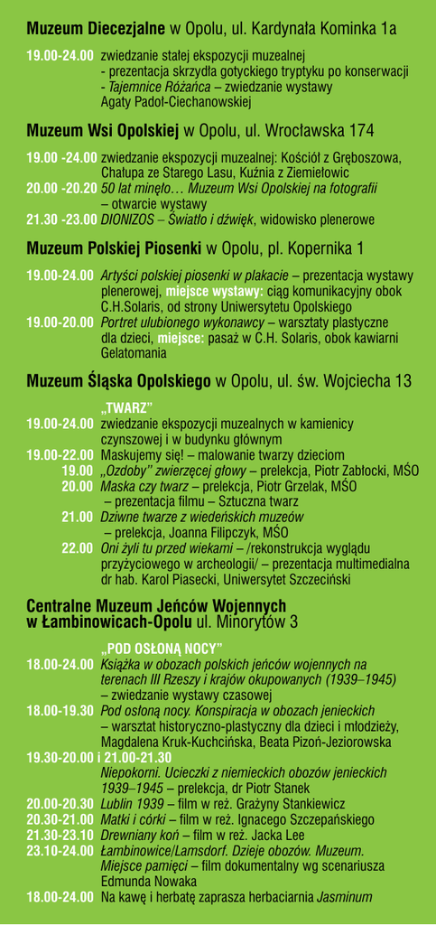 Muzeum Diecezjalne w Opolu, ul. Kardynała Kominka 1a 19.00-24.00 zwiedzanie stałej ekspozycji muzealnej - prezentacja skrzydła gotyckiego tryptyku po konserwacji - Tajemnice Różańca – zwiedzanie wystawy Agaty Padoł-Ciechanowskiej Muzeum Wsi Opolskiej w Opolu, ul. Wrocławska 174 19.00 -24.00zwiedzanie ekspozycji muzealnej: Kościół z Gręboszowa, Chałupa ze Starego Lasu, Kuźnia z Ziemiełowic 20.00 -20.2050 lat minęło… Muzeum Wsi Opolskiej na fotografii – otwarcie wystawy 21.30 -23.00DIONIZOS – Światło i dźwięk, widowisko plenerowe Muzeum Polskiej Piosenki w Opolu, pl. Kopernika 1 19.00-24.00 Artyści polskiej piosenki w plakacie – prezentacja wystawy plenerowej, miejsce wystawy: ciąg komunikacyjny obok C.H.Solaris, od strony Uniwersytetu Opolskiego 19.00-20.00 Portret ulubionego wykonawcy – warsztaty plastyczne dla dzieci, miejsce: pasaż w C.H. Solaris, obok kawiarni Gelatomania Muzeum Śląska Opolskiego w Opolu, ul. św. Wojciecha 13 „TWARZ” 19.00-24.00 zwiedzanie ekspozycji muzealnych w kamienicy czynszowej i w budynku głównym 19.00-22.00 Maskujemy się! – malowanie twarzy dzieciom 19.00 „Ozdoby” zwierzęcej głowy – prelekcja, Piotr Zabłocki, MŚO 20.00 Maska czy twarz – prelekcja, Piotr Grzelak, MŚO – prezentacja filmu – Sztuczna twarz 21.00 Dziwne twarze z wiedeńskich muzeów – prelekcja, Joanna Filipczyk, MŚO 22.00 Oni żyli tu przed wiekami – /rekonstrukcja wyglądu przyżyciowego w archeologii/ – prezentacja multimedialna dr hab. Karol Piasecki, Uniwersytet Szczeciński Centralne Muzeum Jeńców Wojennych w Łambinowicach-Opolu ul. Minorytów 3 „POD OSŁONĄ NOCY” 18.00-24.00 Książka w obozach polskich jeńców wojennych na terenach III Rzeszy i krajów okupowanych (1939–1945) – zwiedzanie wystawy czasowej 18.00-19.30 Pod osłoną nocy. Konspiracja w obozach jenieckich – warsztat historyczno-plastyczny dla dzieci i młodzieży, Magdalena Kruk-Kuchcińska, Beata Pizoń-Jeziorowska 19.30-20.00 i 21.00-21.30 Niepokorni. Ucieczki z niemieckich obozów jenieckich 1939–1945 – prelekcja, dr Piotr Stanek 20.00-20.30 Lublin 1939 – film w reż. Grażyny Stankiewicz 20.30-21.00 Matki i córki – film w reż. Ignacego Szczepańskiego 21.30-23.10 Drewniany koń – film w reż. Jacka Lee 23.10-24.00 Łambinowice/Lamsdorf. Dzieje obozów. Muzeum. Miejsce pamięci – film dokumentalny wg scenariusza Edmunda Nowaka 18.00-24.00 Na kawę i herbatę zaprasza herbaciarnia Jasminum