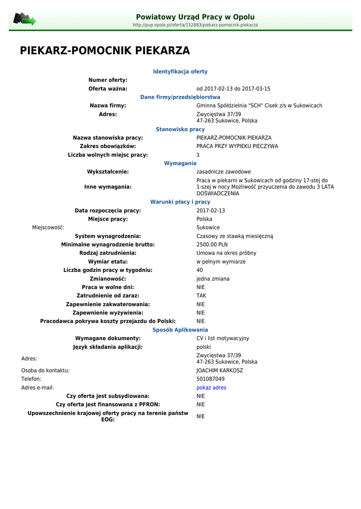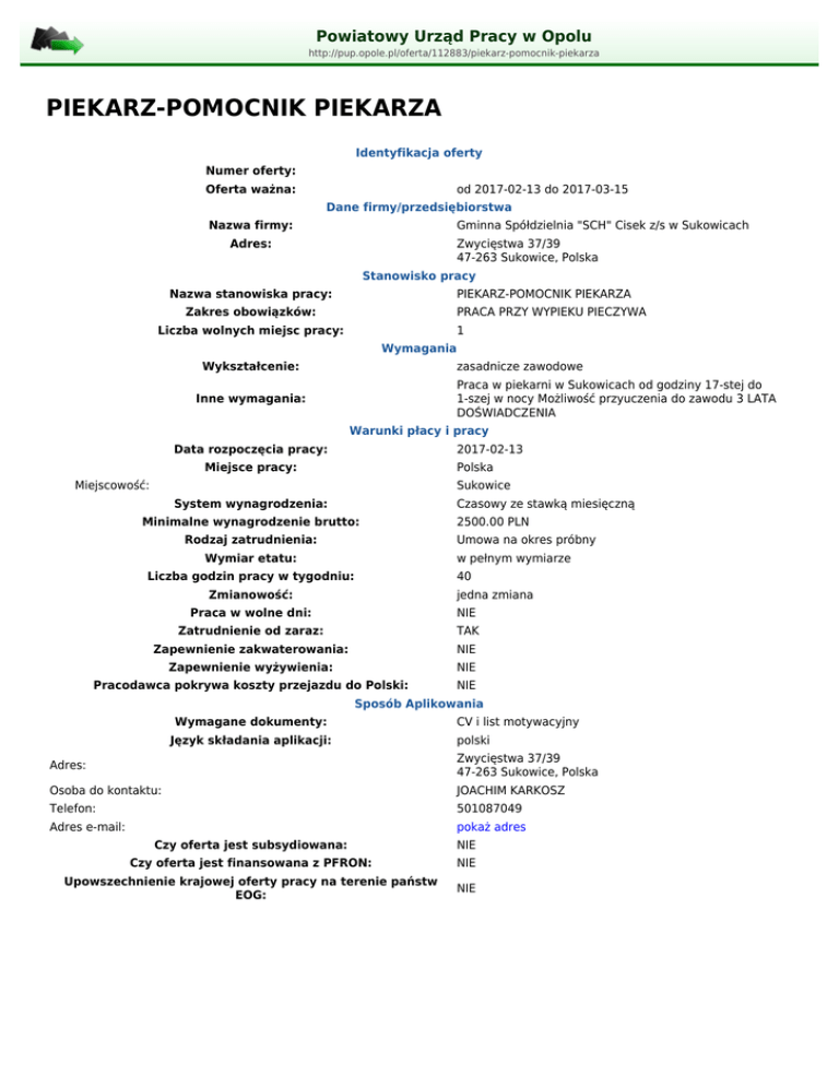 Powiatowy Urząd Pracy w Opolu http://pup.opole.pl/oferta/112883/piekarz-pomocnik-piekarza PIEKARZ-POMOCNIK PIEKARZA Identyfikacja oferty Numer oferty: Oferta ważna: od 2017-02-13 do 2017-03-15 Dane firmy/przedsiębiorstwa Nazwa firmy: Gminna Spółdzielnia "SCH" Cisek z/s w Sukowicach Adres: Zwycięstwa 37/39 47-263 Sukowice, Polska Stanowisko pracy Nazwa stanowiska pracy: PIEKARZ-POMOCNIK PIEKARZA Zakres obowiązków: PRACA PRZY WYPIEKU PIECZYWA Liczba wolnych miejsc pracy: 1 Wymagania Wykształcenie: zasadnicze zawodowe Praca w piekarni w Sukowicach od godziny 17-stej do 1-szej w nocy Możliwość przyuczenia do zawodu 3 LATA DOŚWIADCZENIA Inne wymagania: Warunki płacy i pracy Data rozpoczęcia pracy: 2017-02-13 Miejsce pracy: Polska Miejscowość: Sukowice System wynagrodzenia: Czasowy ze stawką miesięczną Minimalne wynagrodzenie brutto: Rodzaj zatrudnienia: 2500.00 PLN Umowa na okres próbny Wymiar etatu: w pełnym wymiarze Liczba godzin pracy w tygodniu: 40 Zmianowość: jedna zmiana Praca w wolne dni: NIE Zatrudnienie od zaraz: TAK Zapewnienie zakwaterowania: NIE Zapewnienie wyżywienia: NIE Pracodawca pokrywa koszty przejazdu do Polski: NIE Sposób Aplikowania Wymagane dokumenty: Język składania aplikacji: CV i list motywacyjny polski Adres: Zwycięstwa 37/39 47-263 Sukowice, Polska Osoba do kontaktu: JOACHIM KARKOSZ Telefon: 501087049 Adres e-mail: pokaż adres Czy oferta jest subsydiowana: NIE Czy oferta jest finansowana z PFRON: NIE Upowszechnienie krajowej oferty pracy na terenie państw EOG: NIE