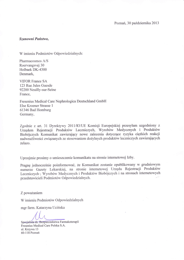 P oznan, 30 października 20 1 3 Szanowni Puństwo, W imieniu Podmiotów odpowiedzialnych: Pharmacosmos A/S Roervangsvej 30 Holbaek DK-4300 Denmark, VIFOR France SA 123 Ruę Jules Guesde 92Ż00 Neuilly-sur- Seine France, Fresenius Medical Care Nephrologica Deutschland GmbH Else Kroener Strasse 1 61346 Bad Homburg Germany, z art.31 Dyrektywy 20i1l83/UE Komisji Europejskiej przesyłam uzgodniony z Urzędem Rejestracji Produktów Lecznlczych, Wyrobów Medycznych i Produktów Biobójczych Komunikat zawięrający nowę zalęcęnia dotyczące ryzyka ciężkich reakcji Zgodnie nadwrazliwości związanych ze stosowaniem dozylnych produktów LeczniczychzawierĄących Żelazo. Uprzejmie prosimy o umieszczenie komunikatu na stronie internetowej Izby. w grudniowym numerze Gazety Lekarskiej, na stronie internetowej Urzędu Rejestracji Produktów Leczniezych,, Wyrobów Medycznych i Produktów Biobójczych i na stronach internetowych Pragnę jednocześnie poinformować, ze Komunikat zostanie opublikowany przedstawicieli Podmiotów odpowiedzialnych. ZpowaŻaniem W imięniu Podmiotów odpowiedzialnych mgr fa rm"Katarzyna Ucińska /LU__ SB€effi ""'---r^---' ęństwa Farmakoterapii Fresęnius Mędical Care Polska S.A. ul. Krzywa l3 60-1 18 Poznań'