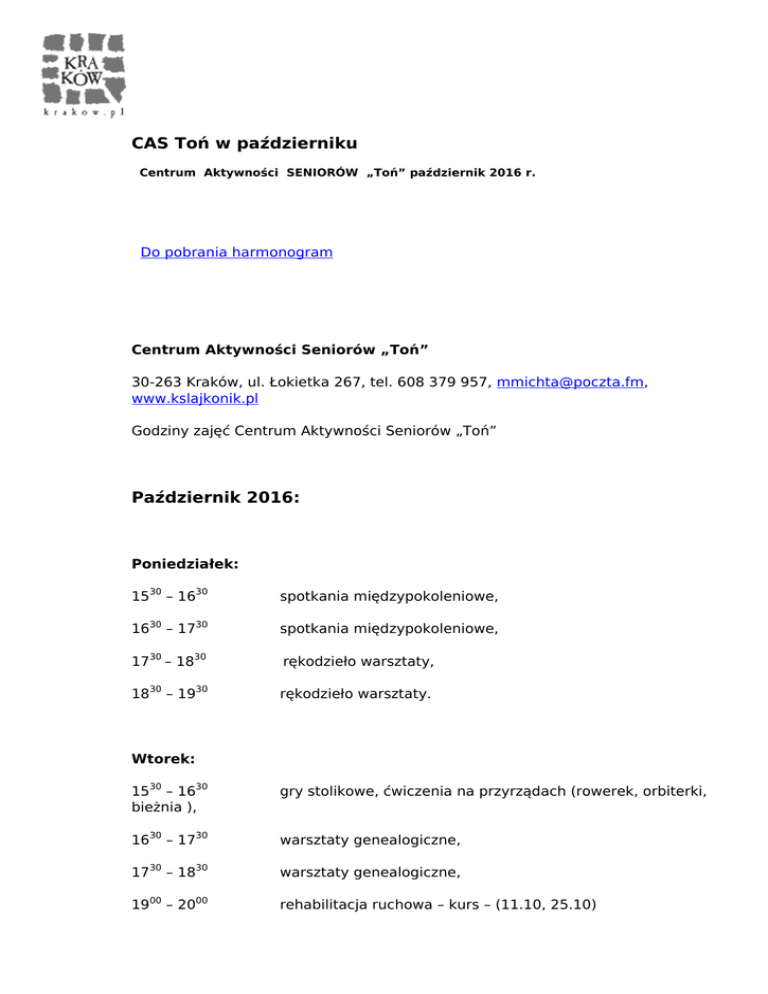 CAS Toń w październiku Centrum Aktywności SENIORÓW „Toń” październik 2016 r. Do pobrania harmonogram Centrum Aktywności Seniorów „Toń” 30-263 Kraków, ul. Łokietka 267, tel. 608 379 957, [email protected], www.kslajkonik.pl Godziny zajęć Centrum Aktywności Seniorów „Toń” Październik 2016: Poniedziałek: 1530 – 1630 spotkania międzypokoleniowe, 1630 – 1730 spotkania międzypokoleniowe, 1730 – 1830 rękodzieło warsztaty, 1830 – 1930 rękodzieło warsztaty. Wtorek: 1530 – 1630 bieżnia ), gry stolikowe, ćwiczenia na przyrządach (rowerek, orbiterki, 1630 – 1730 warsztaty genealogiczne, 1730 – 1830 warsztaty genealogiczne, 1900 – 2000 rehabilitacja ruchowa – kurs – (11.10, 25.10) Środa: 1000 – 1100 rehabilitacja ruchowa – kurs – (05.10, 19.10) 1130 – 1230 zdrowe gotowanie, 1230 – 1330 zdrowe gotowanie, 1715 – 1815 taniec Salsa. Czwartek: 1600 – 1700 bieżnia ), gry stolikowe, ćwiczenia na przyrządach (rowerek, orbiterki, 1700 – 1800 pierwsza pomoc - kurs, 1800 – 1900 zajęcia ruchowe - Zumba, 1900 – 2000 kawiarenka obywatelska. Piątek: 1600 – 1700 bieżnia ), gry stolikowe, ćwiczenia na przyrządach (rowerek, orbiterki, 1700 – 1800 bieżnia ), gry stolikowe, ćwiczenia na przyrządach (rowerek, orbiterki, 1800 – 1900 taniec towarzyski, 1900 – 2000 wolontariat seniorów. Uwaga: Terminy niektórych zajęć mogą ulec zmianie. Będę Państwa informował na bieżąco. Marek Michta tel. 608 379 957. Powered by TCPDF (www.tcpdf.org)