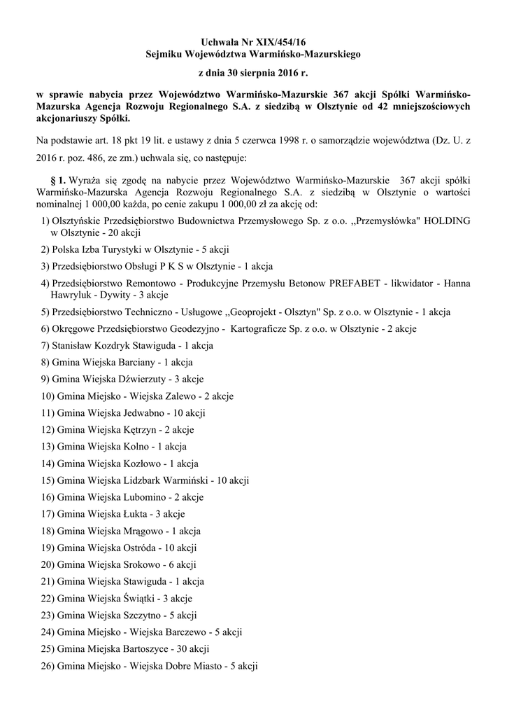 Uchwała Nr XIX/454/16 Sejmiku Województwa Warmińsko-Mazurskiego z dnia 30 sierpnia 2016 r. w sprawie nabycia przez Województwo Warmińsko-Mazurskie 367 akcji Spółki WarmińskoMazurska Agencja Rozwoju Regionalnego S.A. z siedzibą w Olsztynie od 42 mniejszościowych akcjonariuszy Spółki. Na podstawie art. 18 pkt 19 lit. e ustawy z dnia 5 czerwca 1998 r. o samorządzie województwa (Dz. U. z 2016 r. poz. 486, ze zm.) uchwala się, co następuje: § 1. Wyraża się zgodę na nabycie przez Województwo Warmińsko-Mazurskie 367 akcji spółki Warmińsko-Mazurska Agencja Rozwoju Regionalnego S.A. z siedzibą w Olsztynie o wartości nominalnej 1 000,00 każda, po cenie zakupu 1 000,00 zł za akcję od: 1) Olsztyńskie Przedsiębiorstwo Budownictwa Przemysłowego Sp. z o.o. ,,Przemysłówka" HOLDING w Olsztynie - 20 akcji 2) Polska Izba Turystyki w Olsztynie - 5 akcji 3) Przedsiębiorstwo Obsługi P K S w Olsztynie - 1 akcja 4) Przedsiębiorstwo Remontowo - Produkcyjne Przemysłu Betonow PREFABET - likwidator - Hanna Hawryluk - Dywity - 3 akcje 5) Przedsiębiorstwo Techniczno - Usługowe ,,Geoprojekt - Olsztyn" Sp. z o.o. w Olsztynie - 1 akcja 6) Okręgowe Przedsiębiorstwo Geodezyjno - Kartograficze Sp. z o.o. w Olsztynie - 2 akcje 7) Stanisław Kozdryk Stawiguda - 1 akcja 8) Gmina Wiejska Barciany - 1 akcja 9) Gmina Wiejska Dźwierzuty - 3 akcje 10) Gmina Miejsko - Wiejska Zalewo - 2 akcje 11) Gmina Wiejska Jedwabno - 10 akcji 12) Gmina Wiejska Kętrzyn - 2 akcje 13) Gmina Wiejska Kolno - 1 akcja 14) Gmina Wiejska Kozłowo - 1 akcja 15) Gmina Wiejska Lidzbark Warmiński - 10 akcji 16) Gmina Wiejska Lubomino - 2 akcje 17) Gmina Wiejska Łukta - 3 akcje 18) Gmina Wiejska Mrągowo - 1 akcja 19) Gmina Wiejska Ostróda - 10 akcji 20) Gmina Wiejska Srokowo - 6 akcji 21) Gmina Wiejska Stawiguda - 1 akcja 22) Gmina Wiejska Świątki - 3 akcje 23) Gmina Wiejska Szczytno - 5 akcji 24) Gmina Miejsko - Wiejska Barczewo - 5 akcji 25) Gmina Miejska Bartoszyce - 30 akcji 26) Gmina Miejsko - Wiejska Dobre Miasto - 5 akcji 27) Gmina Miejsko - Wiejska Korsze - 5 akcji 28) Gmina Miejsko - Wiejska Pasym - 5 akcji 29) Gmina Miejsko - Wiejska Reszel - 2 akcje 30) Gmina Miejska Iława - 40 akcji 31) Gmina Miejsko - Wiejska Jeziorany - 2 akcje 32) Gmina Miejska Lidzbark Warmińsko - 10 akcji 33) Gmina Miejsko - Wiejska Morąg - 35 akcji 34) Gmina Miejska Mrągowo - 40 akcji 35) Gmina Miejsko - Wiejska Nidzica - 15 akcji 36) Miasto Olsztyn - 30 akcji 37) Gmina Miejska Ostróda - 20 akcji 38) Gmina Miejska Szczytno - 20 akcji 39) Warmińsko - Mazurska Izba Przemysłowo - Handlowa w Bartoszycach - 1 akcja 40) Warmińsko - Mazurska Izba Rzemiosła i Przedsiębiorczości w Olsztynie - 1 akcja 41) Wodociągowo - Ciepłownicza Sp. z o.o. ,,Cowik" w Bartoszycach - 5 akcji 42) Zrzeszenie Prytwatnego Handlu i Usług w Olsztynie - 2 akcje § 2. Wykonanie uchwały powierza się Zarządowi Województwa Warmińsko-Mazurskiemu. § 3. Uchwała wchodzi w życie z dniem podjęcia. Przewodniczący Sejmiku Województwa Warmińsko-Mazurskiego Piotr Żuchowski