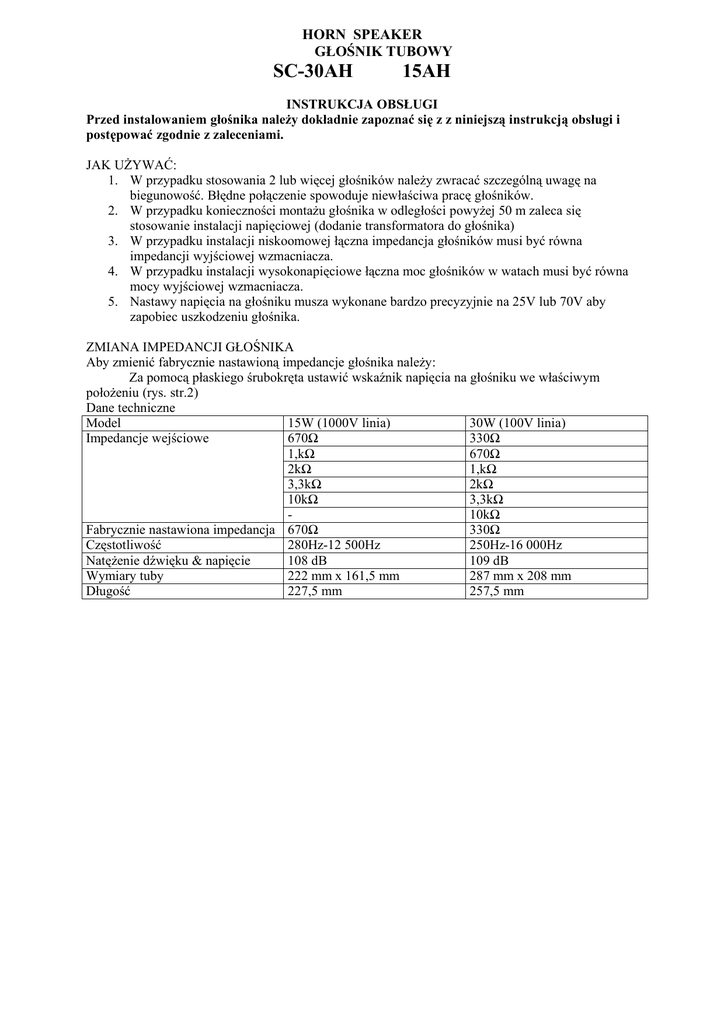 HORN SPEAKER GŁOŚNIK TUBOWY SC-30AH 15AH INSTRUKCJA OBSŁUGI Przed instalowaniem głośnika należy dokładnie zapoznać się z z niniejszą instrukcją obsługi i postępować zgodnie z zaleceniami. JAK UŻYWAĆ: 1. W przypadku stosowania 2 lub więcej głośników należy zwracać szczególną uwagę na biegunowość. Błędne połączenie spowoduje niewłaściwa pracę głośników. 2. W przypadku konieczności montażu głośnika w odległości powyżej 50 m zaleca się stosowanie instalacji napięciowej (dodanie transformatora do głośnika) 3. W przypadku instalacji niskoomowej łączna impedancja głośników musi być równa impedancji wyjściowej wzmacniacza. 4. W przypadku instalacji wysokonapięciowe łączna moc głośników w watach musi być równa mocy wyjściowej wzmacniacza. 5. Nastawy napięcia na głośniku musza wykonane bardzo precyzyjnie na 25V lub 70V aby zapobiec uszkodzeniu głośnika. ZMIANA IMPEDANCJI GŁOŚNIKA Aby zmienić fabrycznie nastawioną impedancje głośnika należy: Za pomocą płaskiego śrubokręta ustawić wskaźnik napięcia na głośniku we właściwym położeniu (rys. str.2) Dane techniczne Model 15W (1000V linia) 30W (100V linia) Impedancje wejściowe 670Ω 330Ω 1,kΩ 670Ω 2kΩ 1,kΩ 3,3kΩ 2kΩ 10kΩ 3,3kΩ 10kΩ Fabrycznie nastawiona impedancja 670Ω 330Ω Częstotliwość 280Hz-12 500Hz 250Hz-16 000Hz Natężenie dźwięku & napięcie 108 dB 109 dB Wymiary tuby 222 mm x 161,5 mm 287 mm x 208 mm Długość 227,5 mm 257,5 mm