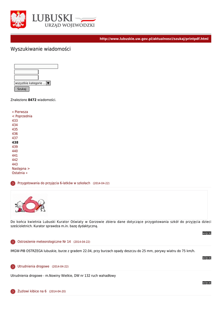http://www.lubuskie.uw.gov.pl/aktualnosci/szukaj/printpdf.html Wyszukiwanie wiadomości wszystkie kategorie ... ▼ Szukaj Znaleziono 8472 wiadomości. « Pierwsza < Poprzednia 433 434 435 436 437 438 439 440 441 442 443 Następna > Ostatnia » Przygotowania do przyjęcia 6-latków w szkołach (2014-04-22) Do końca kwietnia Lubuski Kurator Oświaty w Gorzowie zbiera dane dotyczące przygotowania szkół do przyjęcia dzieci sześcioletnich. Kurator sprawdza m.in. bazę dydaktyczną. więcej Ostrzeżenie meteorologiczne Nr 14 (2014-04-22) IMGW-PIB OSTRZEGA lubuskie, burze z gradem 22.04, przy burzach opady deszczu do 25 mm, porywy wiatru do 75 km/h. więcej Utrudnienia drogowe (2014-04-22) Utrudnienia drogowe - m.Nowiny Wielkie, DW nr 132 ruch wahadłowy więcej Żużlowi kibice na 6 (2014-04-20) Grupa 200 dzieci i młodzieży ubranych w koszulki „Kibica na 6” obejrzała żużlowy mecz Stali Gorzów z Unią Leszno. Doping najmłodszych kibiców stanowić mógł wzór postawy fair play. więcej Informacja drogowa (2014-04-20) Dw 279 po wypadku odblokowana. więcej Informacja drogowa (2014-04-20) Międzyrzecz trasa S3, 3 km w kierunku na Skwierzynę po kolizji odblokowana. więcej Utrudnienia drogowe (2014-04-19) Międzyrzecz S3 - 3 km w kierunku na Skwierzynę. Ruch wahadłowy więcej Utrudnienia drogowe (2014-04-19) DW 279 pomiędzy Zawadą a Janami droga zablokowana więcej Informacja drogowa (2014-04-18) m. Marianka, pow. żarski, droga wojewódzka nr 289, utrudnienia drogowe zakończone. więcej Środki na NPPDL zabezpieczone (2014-04-18) Zwiększenie budżetu na budowę lub remont dróg powiatowych i gminnych – w tej sprawie do minister Hanny Majszczyk zwrócił się wojewoda Jerzy Ostrouch załączając listę projektów. więcej « Pierwsza < Poprzednia 433 434 435 436 437 438 439 440 441 442 443 Następna > Ostatnia »