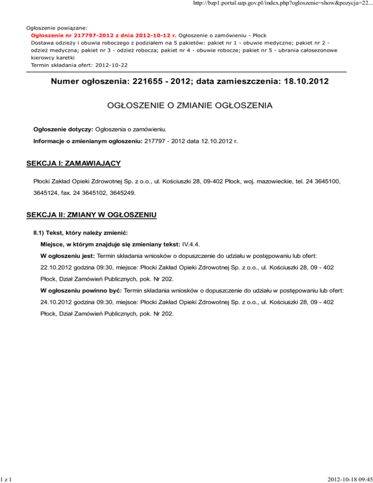 1z1 http://bzp1.portal.uzp.gov.pl/index.php?ogloszenie=show&pozycja=22... Ogłoszenie powiązane: Ogłoszenie nr 217797-2012 z dnia 2012-10-12 r. Ogłoszenie o zamówieniu - Płock Dostawa odzieży i obuwia roboczego z podziałem na 5 pakietów: pakiet nr 1 - obuwie medyczne; pakiet nr 2 odzież medyczna; pakiet nr 3 - odzież robocza; pakiet nr 4 - obuwie robocze; pakiet nr 5 - ubrania całosezonowe kierowcy karetki Termin składania ofert: 2012-10-22 Numer ogłoszenia: 221655 - 2012; data zamieszczenia: 18.10.2012 OGŁOSZENIE O ZMIANIE OGŁOSZENIA Ogłoszenie dotyczy: Ogłoszenia o zamówieniu. Informacje o zmienianym ogłoszeniu: 217797 - 2012 data 12.10.2012 r. SEKCJA I: ZAMAWIAJĄCY Płocki Zakład Opieki Zdrowotnej Sp. z o.o., ul. Kościuszki 28, 09-402 Płock, woj. mazowieckie, tel. 24 3645100, 3645124, fax. 24 3645102, 3645249. SEKCJA II: ZMIANY W OGŁOSZENIU II.1) Tekst, który należy zmienić: Miejsce, w którym znajduje się zmieniany tekst: IV.4.4. W ogłoszeniu jest: Termin składania wniosków o dopuszczenie do udziału w postępowaniu lub ofert: 22.10.2012 godzina 09:30, miejsce: Płocki Zakład Opieki Zdrowotnej Sp. z o.o., ul. Kościuszki 28, 09 - 402 Płock, Dział Zamówień Publicznych, pok. Nr 202. W ogłoszeniu powinno być: Termin składania wniosków o dopuszczenie do udziału w postępowaniu lub ofert: 24.10.2012 godzina 09:30, miejsce: Płocki Zakład Opieki Zdrowotnej Sp. z o.o., ul. Kościuszki 28, 09 - 402 Płock, Dział Zamówień Publicznych, pok. Nr 202. 2012-10-18 09:45