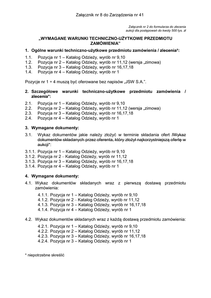 Załącznik nr 8 do Zarządzenia nr 41 Załącznik nr 2 do formularza do zlecenia aukcji dla postępowań do kwoty 500 tys. zł „WYMAGANE WARUNKI TECHNICZNO-UŻYTKOWE PRZEDMIOTU ZAMÓWIENIA” 1. Ogólne warunki techniczno-użytkowe przedmiotu zamówienia / zlecenia*: 1.1. 1.2. 1.3. 1.4. Pozycja nr 1 – Katalog Odzieży, wyrób nr 9,10 Pozycja nr 2 – Katalog Odzieży, wyrób nr 11,12 (wersja „zimowa) Pozycja nr 3 – Katalog Odzieży, wyrób nr 16,17,18 Pozycja nr 4 – Katalog Odzieży, wyrób nr 1 Pozycje nr 1 ÷ 4 muszą być oferowane bez napisów „JSW S.A.”. 2. Szczegółowe warunki zlecenia*: 2.1. 2.2. 2.3. 2.4. techniczno-użytkowe przedmiotu zamówienia / Pozycja nr 1 – Katalog Odzieży, wyrób nr 9,10 Pozycja nr 2 – Katalog Odzieży, wyrób nr 11,12 (wersja „zimowa) Pozycja nr 3 – Katalog Odzieży, wyrób nr 16,17,18 Pozycja nr 4 – Katalog Odzieży, wyrób nr 1 3. Wymagane dokumenty: 3.1. Wykaz dokumentów jakie należy złożyć w terminie składania ofert /Wykaz dokumentów składanych przez oferenta, który złożył najkorzystniejszą ofertę w aukcji*: 3.1.1. 3.1.2. 3.1.3. 3.1.4. Pozycja nr 1 – Katalog Odzieży, wyrób nr 9,10 Pozycja nr 2 – Katalog Odzieży, wyrób nr 11,12 Pozycja nr 3 – Katalog Odzieży, wyrób nr 16,17,18 Pozycja nr 4 – Katalog Odzieży, wyrób nr 1 4. Wymagane dokumenty: 4.1. Wykaz dokumentów składanych wraz z pierwszą dostawą przedmiotu zamówienia: 4.1.1. 4.1.2. 4.1.3. 4.1.4. Pozycja nr 1 – Katalog Odzieży, wyrób nr 9,10 Pozycja nr 2 – Katalog Odzieży, wyrób nr 11,12 Pozycja nr 3 – Katalog Odzieży, wyrób nr 16,17,18 Pozycja nr 4 – Katalog Odzieży, wyrób nr 1 4.2. Wykaz dokumentów składanych wraz z każdą dostawą przedmiotu zamówienia: 4.2.1. 4.2.2. 4.2.3. 4.2.4. Pozycja nr 1 – Katalog Odzieży, wyrób nr 9,10 Pozycja nr 2 – Katalog Odzieży, wyrób nr 11,12 Pozycja nr 3 – Katalog Odzieży, wyrób nr 16,17,18 Pozycja nr 3 – Katalog Odzieży, wyrób nr 1 * niepotrzebne skreślić