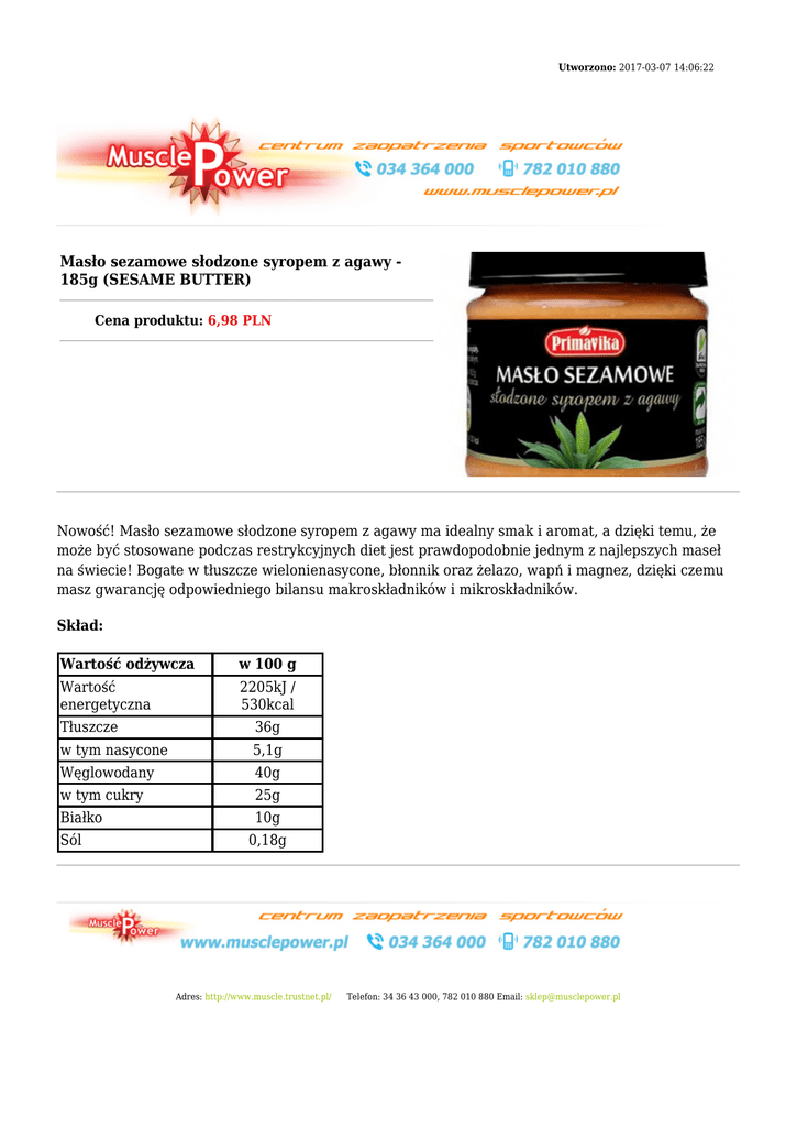 Utworzono: 2017-03-07 14:06:22 Masło sezamowe słodzone syropem z agawy 185g (SESAME BUTTER) Cena produktu: 6,98 PLN Nowość! Masło sezamowe słodzone syropem z agawy ma idealny smak i aromat, a dzięki temu, że może być stosowane podczas restrykcyjnych diet jest prawdopodobnie jednym z najlepszych maseł na świecie! Bogate w tłuszcze wielonienasycone, błonnik oraz żelazo, wapń i magnez, dzięki czemu masz gwarancję odpowiedniego bilansu makroskładników i mikroskładników. Skład: Wartość odżywcza w 100 g Wartość energetyczna 2205kJ / 530kcal Tłuszcze 36g w tym nasycone 5,1g Węglowodany 40g w tym cukry 25g Białko 10g Sól 0,18g Adres: http://www.muscle.trustnet.pl/ Telefon: 34 36 43 000, 782 010 880 Email: [email protected]