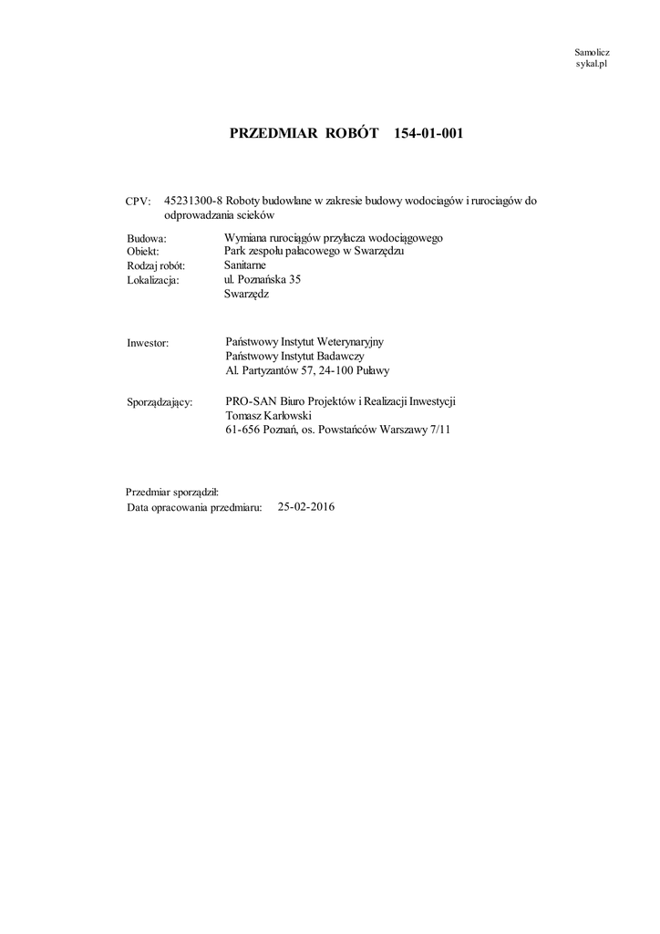 Kosztorys: 154-01-001 - Państwowy Instytut Weterynaryjny