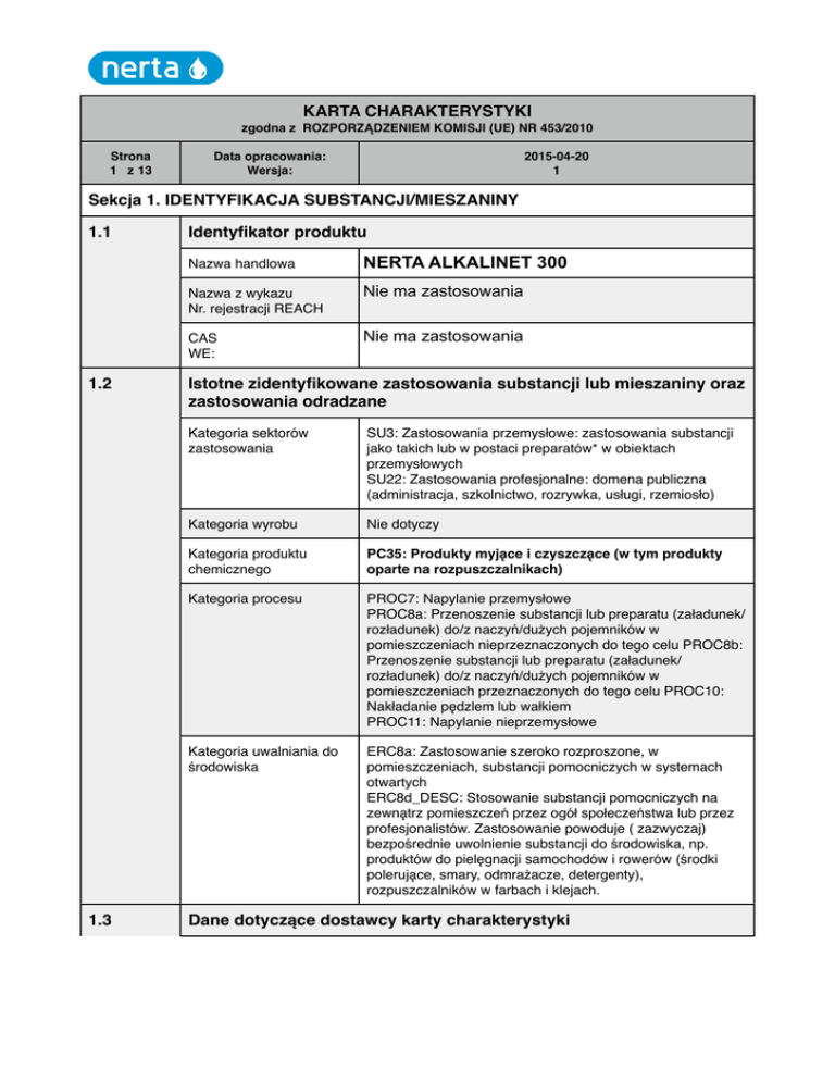 KARTA CHARAKTERYSTYKI zgodna z ROZPORZĄDZENIEM KOMISJI (UE) NR 453/2010 Strona 1 z 13 Data opracowania: Wersja: 2015-04-20 1 Sekcja 1. IDENTYFIKACJA SUBSTANCJI/MIESZANINY 1.1 1.2 1.3 Identyfikator produktu Nazwa handlowa NERTA ALKALINET 300 Nazwa z wykazu Nr. rejestracji REACH Nie ma zastosowania CAS WE: Nie ma zastosowania Istotne zidentyfikowane zastosowania substancji lub mieszaniny oraz zastosowania odradzane Kategoria sektorów zastosowania SU3: Zastosowania przemysłowe: zastosowania substancji jako takich lub w postaci preparatów* w obiektach przemysłowych SU22: Zastosowania profesjonalne: domena publiczna (administracja, szkolnictwo, rozrywka, usługi, rzemiosło) Kategoria wyrobu Nie dotyczy Kategoria produktu chemicznego PC35: Produkty myjące i czyszczące (w tym produkty oparte na rozpuszczalnikach) Kategoria procesu PROC7: Napylanie przemysłowe PROC8a: Przenoszenie substancji lub preparatu (załadunek/ rozładunek) do/z naczyń/dużych pojemników w pomieszczeniach nieprzeznaczonych do tego celu PROC8b: Przenoszenie substancji lub preparatu (załadunek/ rozładunek) do/z naczyń/dużych pojemników w pomieszczeniach przeznaczonych do tego celu PROC10: Nakładanie pędzlem lub wałkiem PROC11: Napylanie nieprzemysłowe Kategoria uwalniania do środowiska ERC8a: Zastosowanie szeroko rozproszone, w pomieszczeniach, substancji pomocniczych w systemach otwartych ERC8d_DESC: Stosowanie substancji pomocniczych na zewnątrz pomieszczeń przez ogół społeczeństwa lub przez profesjonalistów. Zastosowanie powoduje ( zazwyczaj) bezpośrednie uwolnienie substancji do środowiska, np. produktów do pielęgnacji samochodów i rowerów (środki polerujące, smary, odmrażacze, detergenty), rozpuszczalników w farbach i klejach. Dane dotyczące dostawcy karty charakterystyki KARTA CHARAKTERYSTYKI zgodna z ROZPORZĄDZENIEM KOMISJI (UE) NR 453/2010 Strona z 13 1.32 1.4 Data opracowania: Wersja: 2015-04-20 1 Dostawca NERTA Sp. z o.o. ul. Grunwaldzka 115 60-313 Poznań Tel. +48 61-88 00 758 www.nerta.pl Osoba udzielająca informacji Marek Różycki Kartę sporządził Marek Różycki [email protected] Numer telefonu alarmowego Telefon: Tel. +48 61-88 00 758 w godzinach 8-16:00 SEKCJA 2: Identyfikacja zagrożeń 2.1 2.2 Klasyfikacja substancji lub mieszaniny Klasyfikacja zgodna z Rozporządzeniem (WE) Nr 1272/2008 [CLP] Działanie zrace na skóre - Kategoria 1A Niebezpieczenstwo (CLP : Skin Corr. 1A) Powazne uszkodzenie oczu - Kategoria 1 Niebezpieczenstwo (CLP : Eye Dam. 1) Klasyfikacja zgodnie z dyrektywą 67/548/EWG C, R35, Xi R37 Elementy oznakowania Oznakowanie zgodne z Rozporządzeniem (WE) Nr 1272/2008 [CLP]: Piktogramy określające rodzaj zagrożenia GHS05 Hasła ostrzegawcze Niebezpieczeństwo Zwroty wskazujące rodzaj zagrożenia H314 - Powoduje powazne oparzenia skóry oraz uszkodzenia oczu. KARTA CHARAKTERYSTYKI zgodna z ROZPORZĄDZENIEM KOMISJI (UE) NR 453/2010 Strona 3 z 13 Data opracowania: Wersja: 2015-04-20 1 Zwroty wskazujące środki ostrożności ZAPOBIEGANIE P280 - Stosowac rekawice ochronne/odziez ochronna/ ochrone oczu/ochrone twarzy. P260 - Nie wdychac pyłu, dymu, gazu, mgły, par, rozpylonej cieczy. P264 - Dokładnie umyc po manipulowaniu. REAGOWANIE P301+330+331 - W PRZYPADKU POŁKNIECIA: wypłukac usta. NIE wywoływac wymiotów. P303+361+353 - W PRZYPADKU KONTAKTU ZE SKÓRa (lub z włosami): Natychmiast zdjac cała zanieczyszczona odziez. Spłukac skóre pod strumieniem wody/prysznicem. Stosowac rekawice ochronne/odziez ochronna/ochrone oczu/ ochrone twarzy. P305+P351+P338 - W PRZYPADKU DOSTANIA SIe DO OCZU : Ostroznie płukac woda przez kilka minut. Wyjac soczewki kontaktowe, jezeli sa i mozna je łatwo usunac. Nadal płukac. Klasyfikacja zgodnie z dyrektywą 67/548/EWG Oznaczenie: C - Żrący Zwroty R R35 : Powoduje powazne oparzenia. R37 : Działa drazniaco na drogi oddechowe. Zwroty S S26 : Zanieczyszczone oczy przemyc natychmiast duza iloscia wody i zasiegnac porady lekarza. S36/37 : Nosic odpowiednia odziez ochronna i odpowiednie rekawice ochronne. S45 : W przypadku awarii lub jezeli zle sie poczujesz, niezwłocznie zasiegnij porady lekarza jezeli to mozliwe, pokaz etykiete. 2.3 Inne zagrożenia PBT lub vPvB Nie podlega klasyfikacji SEKCJA 3: Skład/informacja o składnikach Substancje: KARTA CHARAKTERYSTYKI zgodna z ROZPORZĄDZENIEM KOMISJI (UE) NR 453/2010 Strona 4 z 13 Data opracowania: Wersja: 2015-04-20 1 Wodotlenek potasu CAS 1310-58-3 WE 215-181-3 Index 019-002-00-8 REACH 01-2119487136-33 Klasyfikacja CLP: Xn; R22 C; R35 Klasyfikacja GHS: Eye Dam. 1;H318 Acute Tox. 4 (Oral);H302 Zawartość: 1-10% Sól sodowa EDTA (Kwas : etylenodwuaminoczterooctowy) CAS 64-02-8, WE 200-573-9 REACH 01-2119486762-27 Klasyfikacja CLP: Xn; R22 - R36 Klasyfikacja GHS: Acute Tox. 4 (Oral) H302 Eye Dam. 1;H318 Acute Tox. 4 (Inhalation) H332 Zawartość: 1-10% Metakrzemian sodowy CAS 6834-92-0 WE 229-912-9 REACH 01-2119449811-37 Klasyfikacja CLP: C, R:34 Klasyfikacja GHS: Skin Corr. 1B;H314, Met. Corr. 1;H290, STOT SE3;H335 Zawartość: 1-10% Mieszaniny: Brak SEKCJA 4: Środki pierwszej pomocy 4.1 Opis środków pierwszej pomocy Informacje ogólne Zalecane jest przeniesienie narażonej osoby z miejsca narażenia na świeże powietrze. Zapewnić poszkodowanemu ciepło i spokój. Niezwłocznie zasięgnąć porady lekarskiej jeśli występują lub utrzymują się niepokojące objawy. Pokazać etykietę / kartę. 4.2 Przez drogi oddechowe: Wyprowadzić na świeże powietrze. W razie dolegliwości wezwać lekarza. W przypadku kontaktu ze skórą: Natychmiast zmyć wodą i mydłem i dobrze spłukać . Po dostaniu się do oczu: Przemyć oczy wodą dokładnie i nieprzerwanie przez okres, co najmniej 15 minut. Należy trzymać szeroko oczy podczas płukania. Wyjąć szkła kontaktowe. Poszkodowanego należy niezwłocznie umieścić w specjalistycznej placówce medycznej. Spożycie / aspiracja Nie powodować wymiotów. Wypłukać usta wodą i sprowadzić lekarza. Najważniejsze os