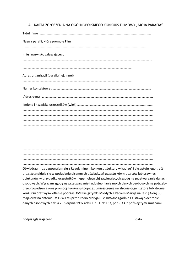 A. KARTA ZGŁOSZENIA NA OGÓLNOPOLSKIEGO KONKURS FILMOWY „MOJA PARAFIA” Tytuł filmu …............................................................................................................................ Nazwa parafii, którą promuje Film ............................................................................................................................................ Imię i nazwisko zgłaszającego …………………………………………………………………………………………………………………………………..……….. ………………………………………………………………………………………………………………………. Adres organizacji (parafialnej, innej) ………………………………………………………………………………………………………………………... Numer kontaktowy ……………………………………………………………………………………………………………. Adres e-mail ……………………………………………………………………………………………………………………….. Imiona i nazwiska uczestników (wiek) ……………………………………………………………………............... …………………………………………………………………………………………………………………………………………….. ……………………………………………………………………………………………………………………………………………… …………………………………………………………………………………………………………………………………………….. ……………………………………………………………………………………………………………………………………………… …………………………………………………………………………………………………………………………………………….. ……………………………………………………………………………………………………………………………………………… …………………………………………………………………………………………………………………………………………….. ……………………………………………………………………………………………………………………………………………… …………………………………………………………………………………………………………………………………………….. ……………………………………………………………………………………………………………………………………………… …………………………………………………………………………………………………………………………………………….. ……………………………………………………………………………………………………………………………………………… Oświadczam, że zapoznałem się z Regulaminem konkursu „Lektury w kadrze” i akceptuję jego treść oraz, że znajduję się w posiadaniu pisemnych oświadczeń uczestników (rodziców lub prawnych opiekunów w przypadku uczestników niepełnoletnich) zawierających zgodę na przetwarzanie danych osobowych. Wyrażam zgodę na przetwarzanie i udostępnianie moich danych osobowych na potrzeby przeprowadzenia oraz promocji konkursu (poprzez umieszczenie na stronie organizatora lub stronie konkursu oraz wyświetlenie podczas XVII Pielgrzymki Młodych z Radiem Maryja na Jasną Górę 30 maja oraz na antenie TV TRWAM) przez Radio Maryja i TV TRWAM zgodnie z Ustawą o ochronie danych osobowych z dnia 29 sierpnia 1997 roku, Dz. U. Nr 133, poz. 833, z późniejszymi zmianami. podpis zgłaszającego data B. ZGODA RODZICA DLA OSOBY NIEPEŁNOLETNIEJ Wyrażam zgodę na przetwarzanie i udostępnianie danych osobowych mojego dziecka ………………………………………………………………………………………………………………………………………………. na potrzeby przeprowadzenia oraz promocji Konkursu Filmowego „Moja Parafia” (przez promocję rozumie się umieszczenie fragmentów lub całości filmów w mediach np. na stronie internetowej konkursu) przez Radio Maryja i TV TRWAM zgodnie z Ustawą o ochronie danych osobowych z dnia 29 sierpnia 1997 roku, Dz. U. Nr 133, poz. 833, z późniejszymi zmianami. miejscowość i data podpis rodzica (prawnego opiekuna) C. ZGODA PEŁNOLETNIEGO UCZESTNIKA Wyrażam zgodę na przetwarzanie i udostępnianie moich danych osobowych na potrzeby przeprowadzenia oraz promocji Konkursu Filmowego „Moja Parafia” (przez promocję rozumie się umieszczenie fragmentów lub całości filmów w mediach np. na stronie internetowej konkursu) przez Radio maryja i TV TRWAM zgodnie z Ustawą o ochronie danych osobowych z dnia 29 sierpnia 1997 roku, Dz. U. Nr 133, poz. 833, z późniejszymi zmianami. miejscowość i data czytelny podpis uczestnika