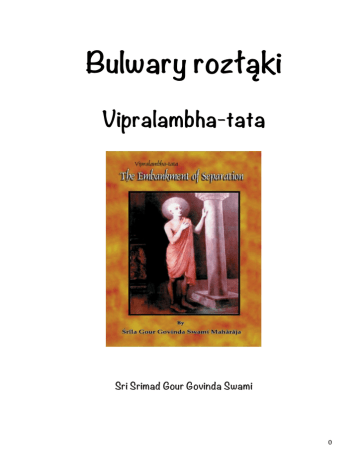 Bulwary rozłąki Vipralambha-tata Sri Srimad Gour Govinda Swami 0 Tytuł oryginału - Embankment of Separation Tłumaczenie z angielskiego: Rati Mataji Pierwsze polskie wydanie. 1 CHWAŁA JAGANATHA MAHAPRABHU!!! CHWAŁA GURU I GAURANGA!!! W ‘Dvapara Yudze’, gdy Pan Śiva poprosił Pana Kṛṣṇę o wybaczenie ogromnego błędu jakim było przeciwstawienie się Panu Krysznie w bitwie mającej na celu pomszczenie śmierci Kaśiraja, Najwyższy Pan opowiedział o wielkiej świętości i duchowej chwale Puruṣottama Kṣetra – najświętszego ze Świętych Miejsc, którego nazwa wywodzi się od samego Najwyższego Pana. Poradził też Śivie aby zamieszkał w tym Świętym Kṣetra. Ten pradawny epizod, wspomniany w Skanda Puranie, został opowiedziany królowi Indradyumnie przez Maharisiego Naradę gdy opisywał starożytne dzieje i chwały Boskiej Siedziby Puruṣottama Jaganatha. Starożytne pochodzenie Puruṣottama Dham jest rzeczywiście okryte tajemnicą, lecz długa historia tego świętego miejsca jasno wskazuje, że wielcy święci i mędrcy w Indiach, bez względu na swoje religijne wyznania i przynależność do określonej grupy wierzących, od wieków ofiarowywali swe pełne czci pokłony do lotosowych stóp Pana Wszechświata w Puruṣottama Dham. Czy był to Adi Śankaracarya, przedstawiciel Advaita Vedanty, czy Vaisṇava Acaryowie od Śrī Ramanujacaryi do Śrī Caitanyi Mahaprabhu, czy muzułmański poeta-święty Salbeg z Kairu, czy nawet Guru Sikhów Nanak, to właśnie Pan Jagannath w Puruṣottama Dham był przez nich wszystkich wielbiony jako Absolutna Najwyższa Boskość. Tak, jak różne strumienie wpływające do ogromnego, bezkresnego oceanu, podobnie różne (niekiedy wyglądające na sprzeczne z sobą) szkoły myśli religijnych, pogrążają się we wszechobejmującej jedności Śrī Jagannatha dharmy, w usprawiedliwiającym twierdzeniu Rig Vedy: "Indram Mitram Varunam agnimahurekam sat vipra bahudha vadanti” (Chociaż jest jednym, mędrcy opisują go różnie jako Agni, Mitra, Varuna itd.) Poprzez serie przejrzystych i oświecających rozmów z oddaniem zestawionych w „Bulwarach rozłąki" (Embankment of Separation), Param Pujyam Śrila Gour Govinda Svami Maharaj rzuca potoki światła na duchową chwałę tego najbardziej starożytnego i świętego Puruṣottama Dham oraz boskiego „Lila” Śrī Caitanyi Mahaprabhu w tym świętym miejscu. Propagowanie chwały i świętego Imienia Najwyższego Pana i jego Boskich Nauk są jedynymi sposobami na wyzwolenie się z wydających się nie kończyć smutków i niepokojów egzystencji. Niechaj czytelnicy „Bulwarów rozłąki” zaczerpną boskiej inspiracji do pewnego kroczenia duchową ścieżką i przezwyciężając przeszkody, osiągną Boskie Przeznaczenie wiecznego szczęścia. HARE KṚṢṆA HARE KṚṢṆA KṚṢṆA KṚṢṆA HARE HARE HARE RAMA HARE RAMA RAMA RAMA HARE HARE Puruṣottama-Dham 15 stycznia 1996r GAJAPATI MAHARAJA DIBYA SINGHA DEB 2 WPROWADZENIE Śrī Caitanya Mahaprabhu pojawił się zaraz po zachodzie słońca 18 lutego 1486 roku w Mayapur we Wschodnim Bengalu. Jego życie i nauki zostały należycie udokumentowane przez uczonych oraz religioznawców. Niemniej jednak wiedza o jego prawdziwej tożsamości oraz głębia oceanu Jego emocji zawsze pozostała poufną przewagą Jego najbliższych towarzyszy i ich uczniów. Czytelnicy zaznajomieni z Avatarami Viṣnu, który wielbiony jest w Wedach jako wszechzwycięski Pan trzech światów, pamiętać będą Wszechmocną Osobę Boga jako dobroczynnego i pomysłowego bohatera niezliczonych, pasjonujących przygód. Jakkolwiek rozrywki Śrī Kṛṣṇy, który jest źródłem wszystkich avatarów, są odmiennej natury. W tym wyjątkowym tomiku, Śrī Śrimad Gaur Govinda Svami - mistrz duchowy pochodzący w bezpośredniej linii sukcesji uczniów od Śrī Caitanyi Mahaprabhu – odkrywa wzniosłe intencje Najwyższej Osoby Boga, Kṛṣṇy; to jak On stara odkryć się i spełnić Swe intymne aspiracje. Wykraczając poza wszystkie relatywne koncepcje prawdy w odniesieniu do nadrzędności Boga, autor przedstawia absolutną boskość jako takiego jakim On jest: wyjątkowo słodkiego i bezbronnego podrostka, którego intymne i pełne szczęścia dziecięce zabawy zostają przedwcześnie przerwane przez serię nieszczęśliwych okoliczności „poza Jego kontrolą”. Oderwany od domorosłych uroków swej wiejskiej społeczności Vrindavan, Kṛṣṇa wyrusza by ustanowić potężną dynastię, zniszczyć wpływy skorumpowanych królów i spełnić Swą misję odciążenia ziemi. Jak na ironię, nie potrafi On jednak pozbyć się ciężaru ze Swego serca. Nawet pośród bogactwa przepychu Swej bajecznej stolicy, Dvaraki, Kṛṣṇa jest ścigany przez słodko-gorzkie wspomnienia Swej pierwszej i jedynej miłości, w tej prostej wiosce w której dorastał. Z drugiej strony, bohaterka, Śrī Radhika, zostaje z perspektywą spędzenia życia bez Kṛṣṇy. Jej uczucia rozłąki stanowią główną zawartość tego tomiku. Cztery i pół tysiąca lat po odegraniu tych dramatycznych rozrywek, Kṛṣṇa, pociągany fascynacją dla miłości -w- rozłące, Śrīmatī Rādharani, udaje się na najśmielszą ze wszystkich swych operacji – Gaura-lila. Wcześniej Kṛṣṇa pokonał szereg niezwykłych wrogów, ale teraz w Swej próbie poznania miłości czułej dziewczyny z wioski, Kṛṣṇa zostaje onieśmielony. Po raz pierwszy Kṛṣṇa nie potrafi zapanować i nie może się odnaleźć w tym doprawdy nieznanym otoczeniu – w emocjach Śrīmatī Rādharani. W tym sensie, karty tej książki są w rzeczy samej świadectwem Jej wspaniałości. 3 Romanse Rādhy i Kṛṣṇy osiągają bezprecedensową intensywność w rozrywkach Śrī Caitanyi Mahaprabhu, w których Najwyższa Osoba Boga odkrywa doskonałość miłosnego oddania i dzieli się nim z każdym i wszystkimi. „Bulwary rozłąki” zostały skompilowane z kilku 